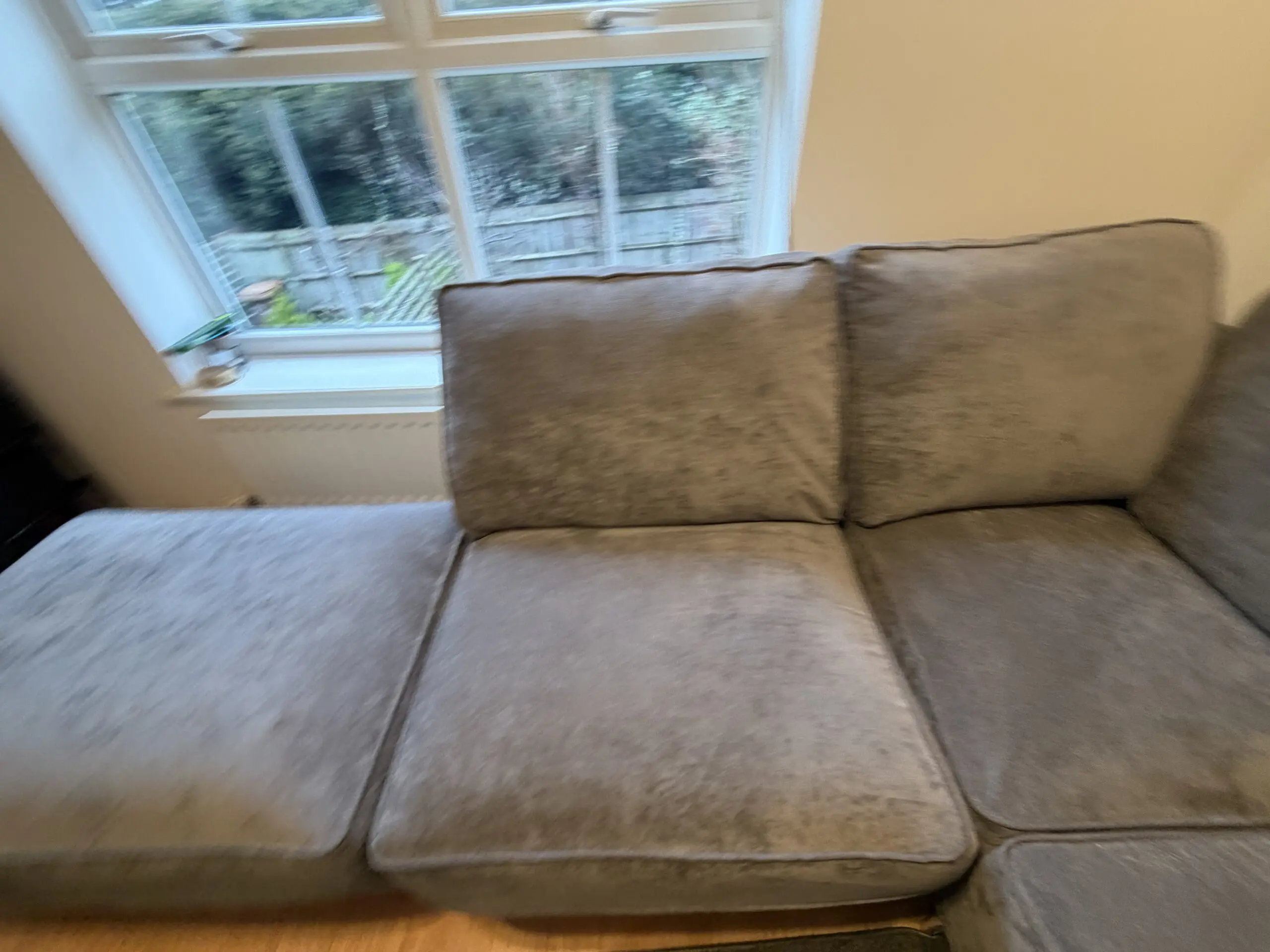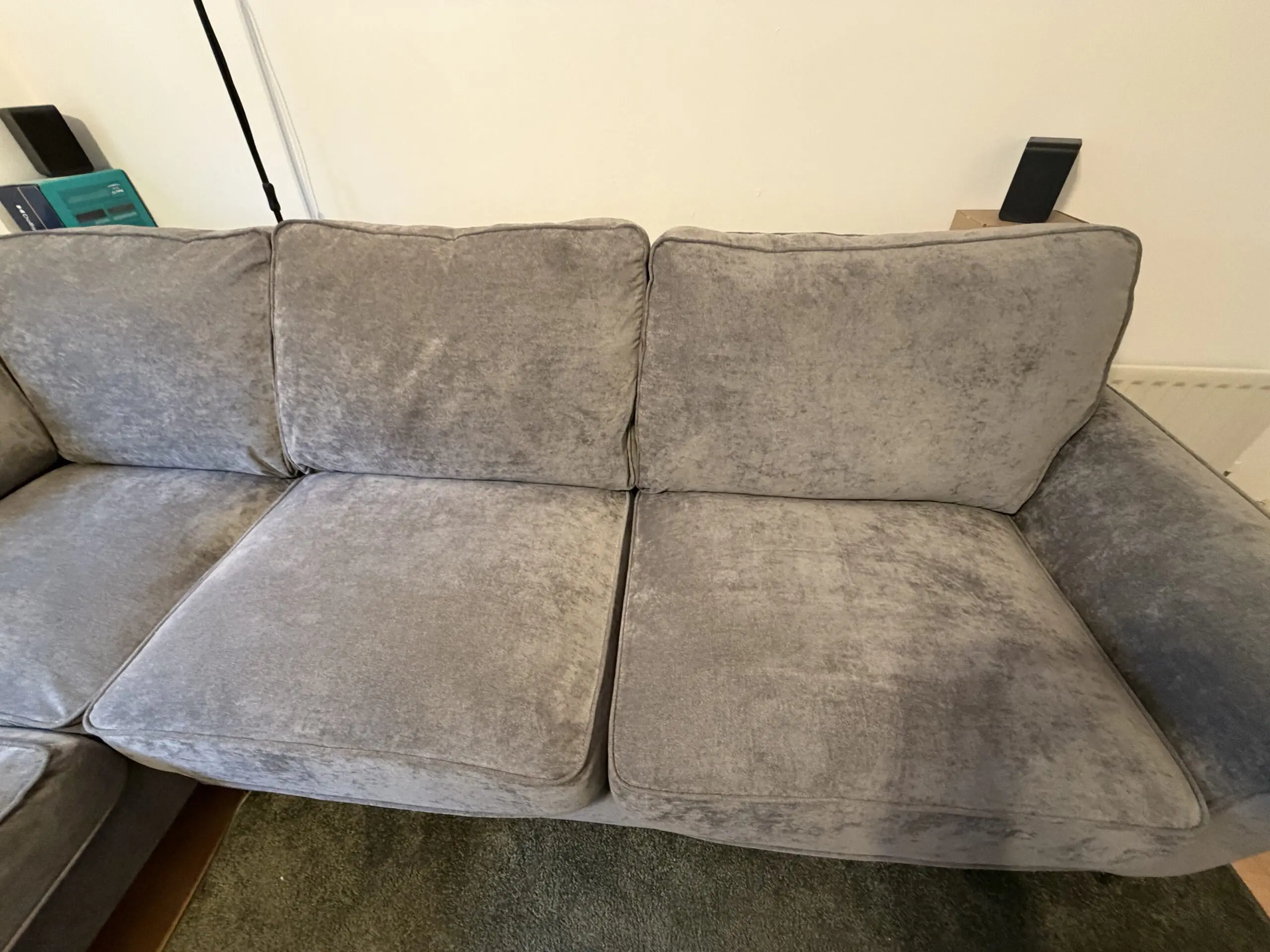Beautifully kept Furniture Village Legend classic fabric back sofa with matching footstool. Around 7 months old and in immaculate condition, having seen very little use. Clean, comfortable, and well cared for, with no marks or defects.