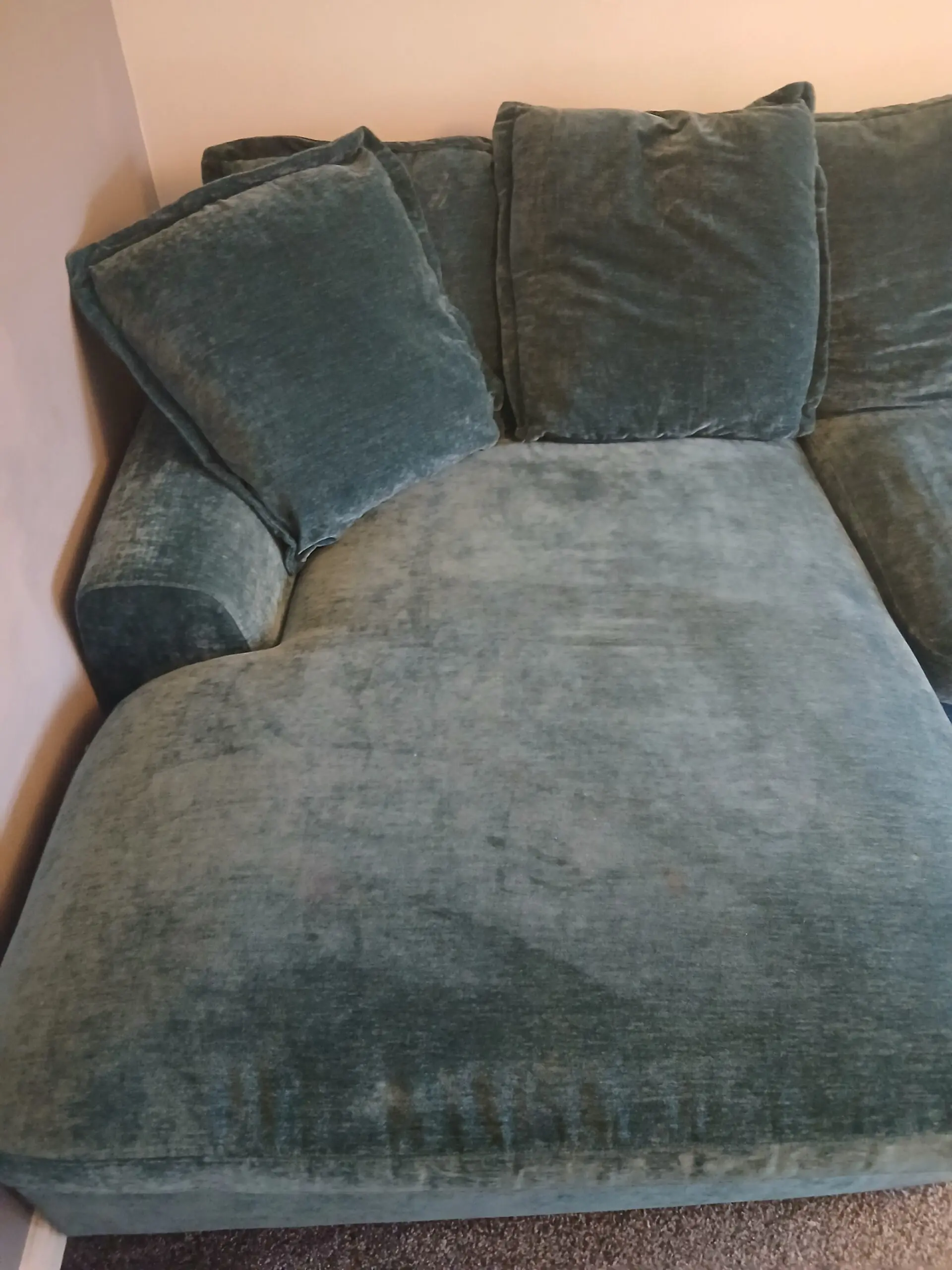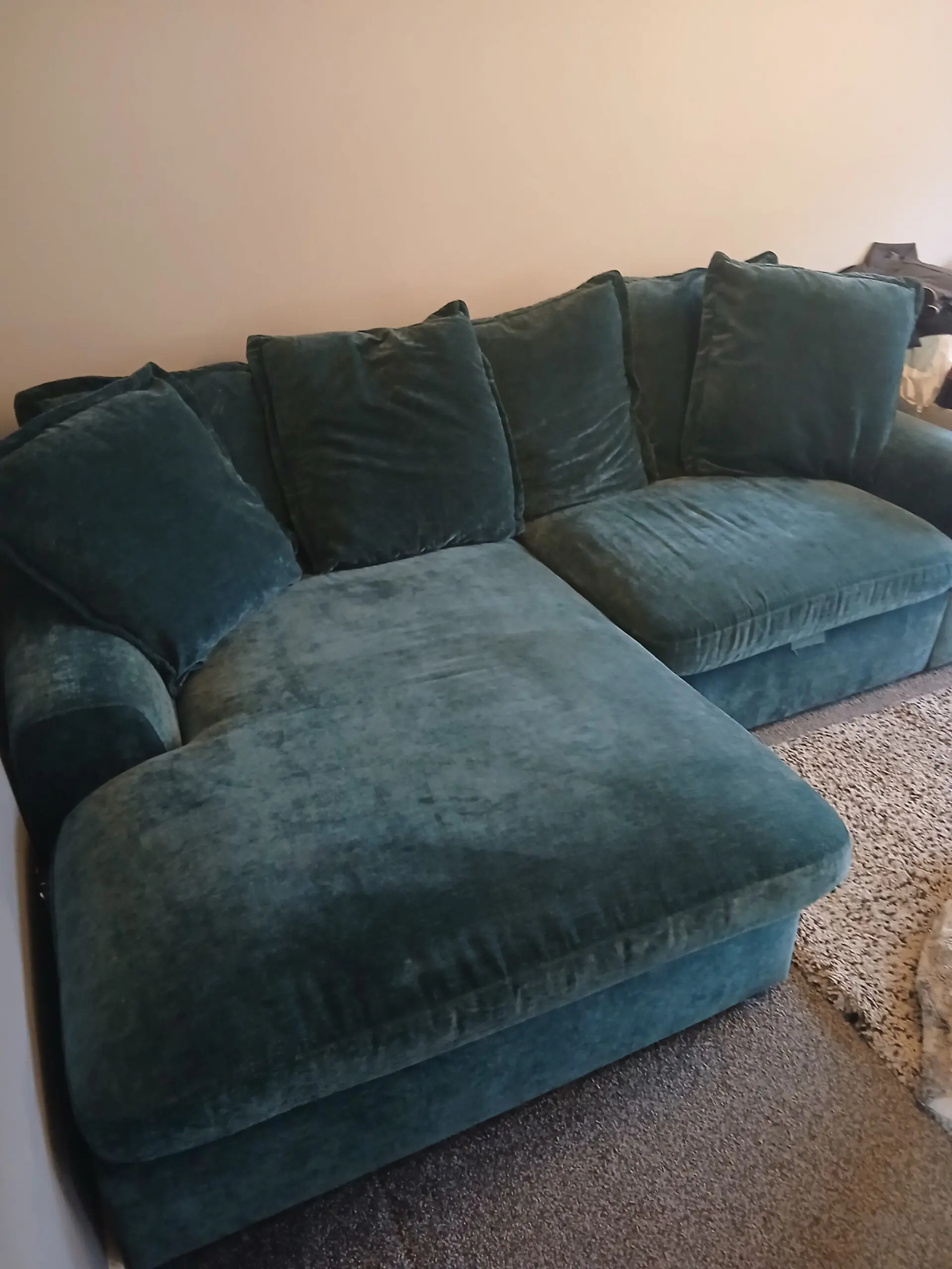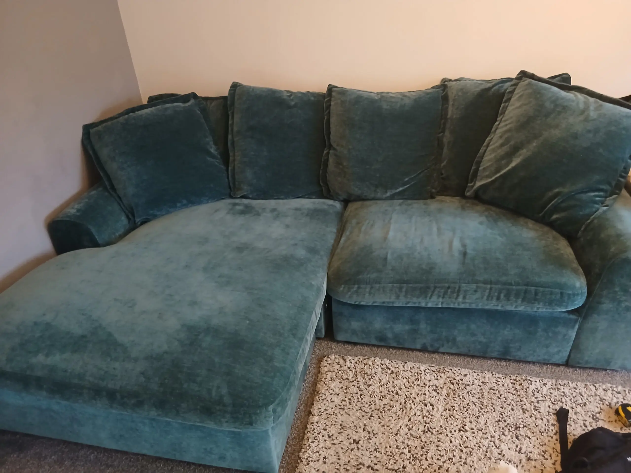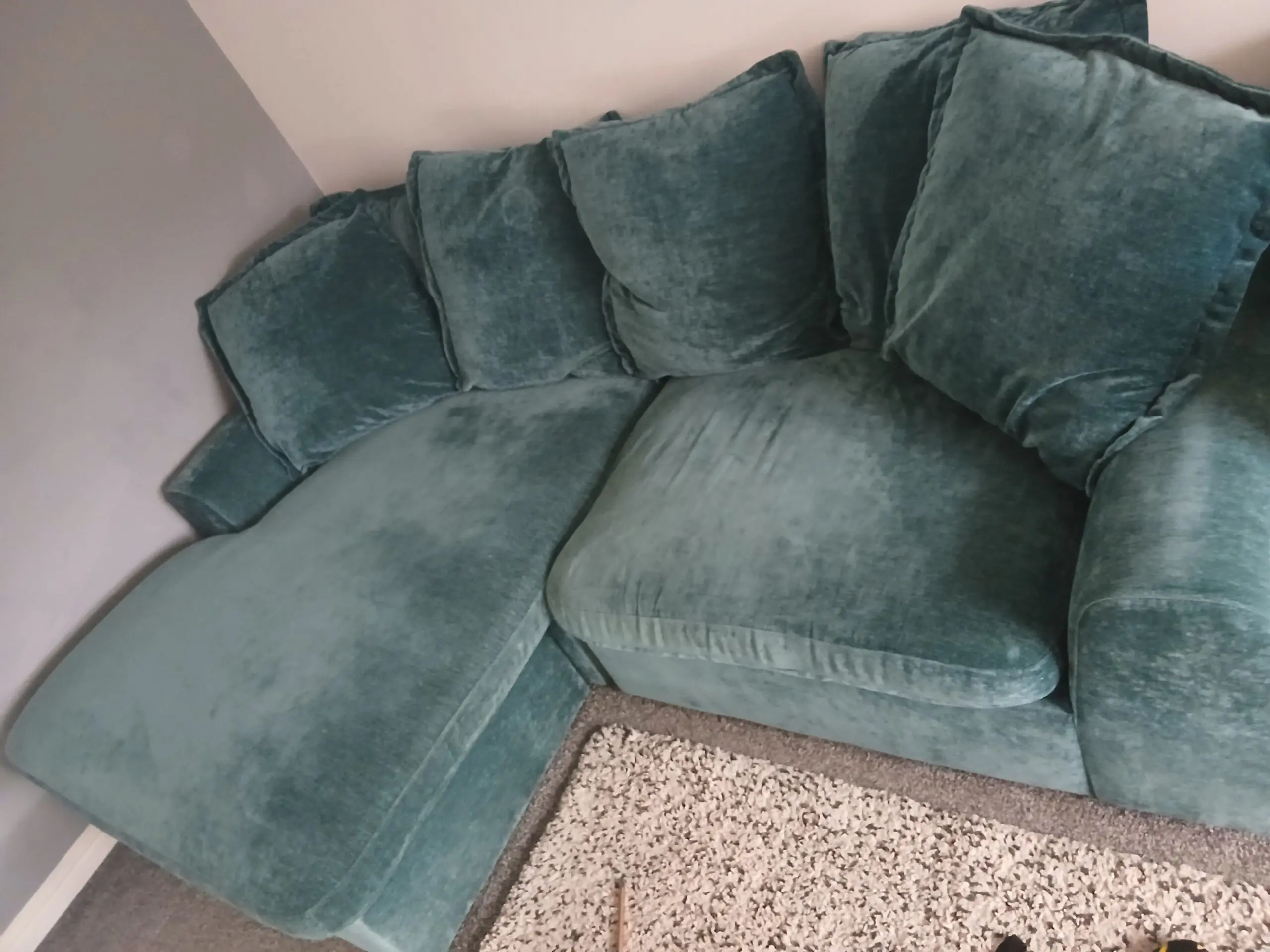 Only had for 6 months excellent condition. Cost £850 new. Very comfortable sofa and great quality so non of the sagging in the cushions like alot of sofas. Will make a great addition to any room to add that pop of colour. Do have a dog and cat but always kept them off it and always had throws on for protection. Coming from a very clean home. Teal velvet