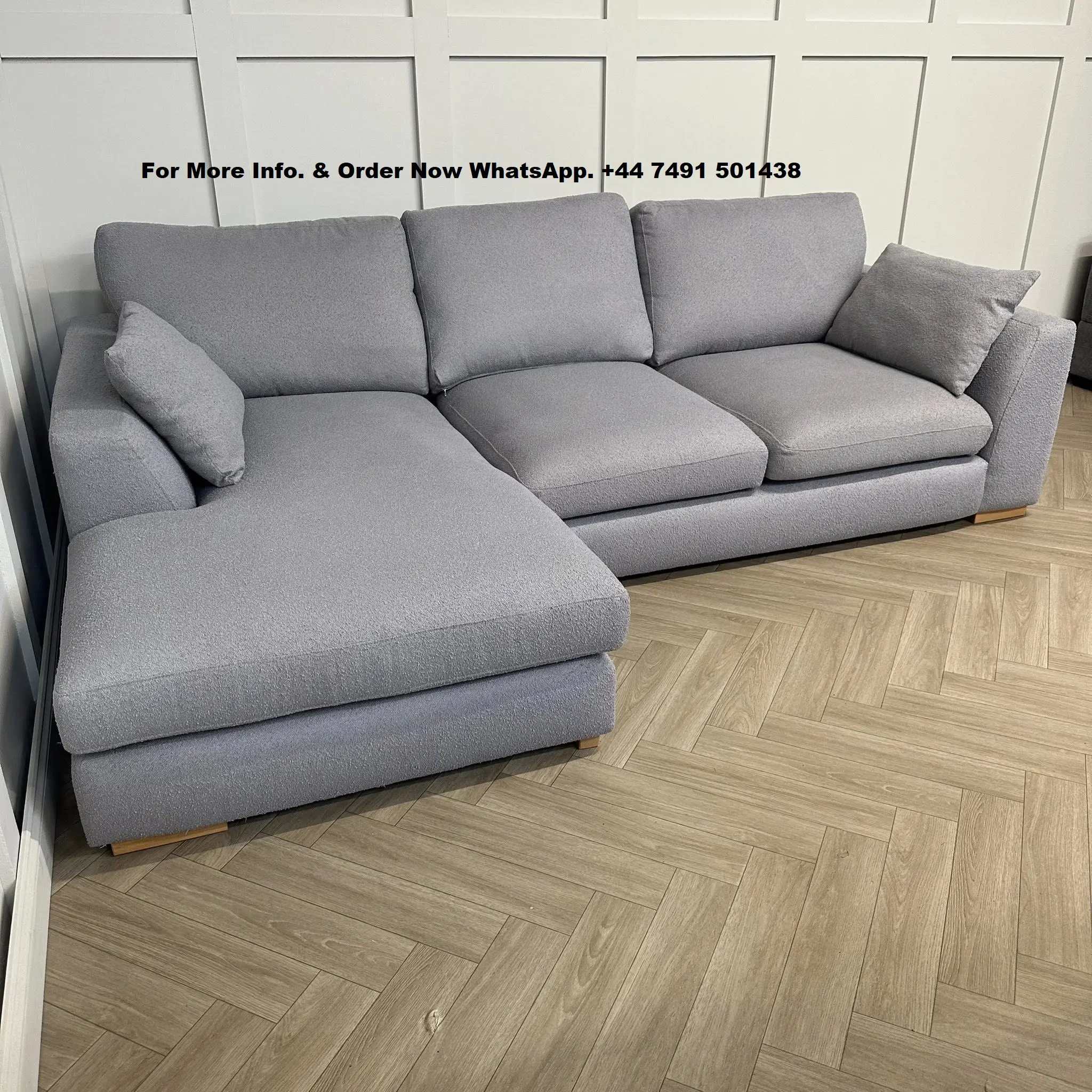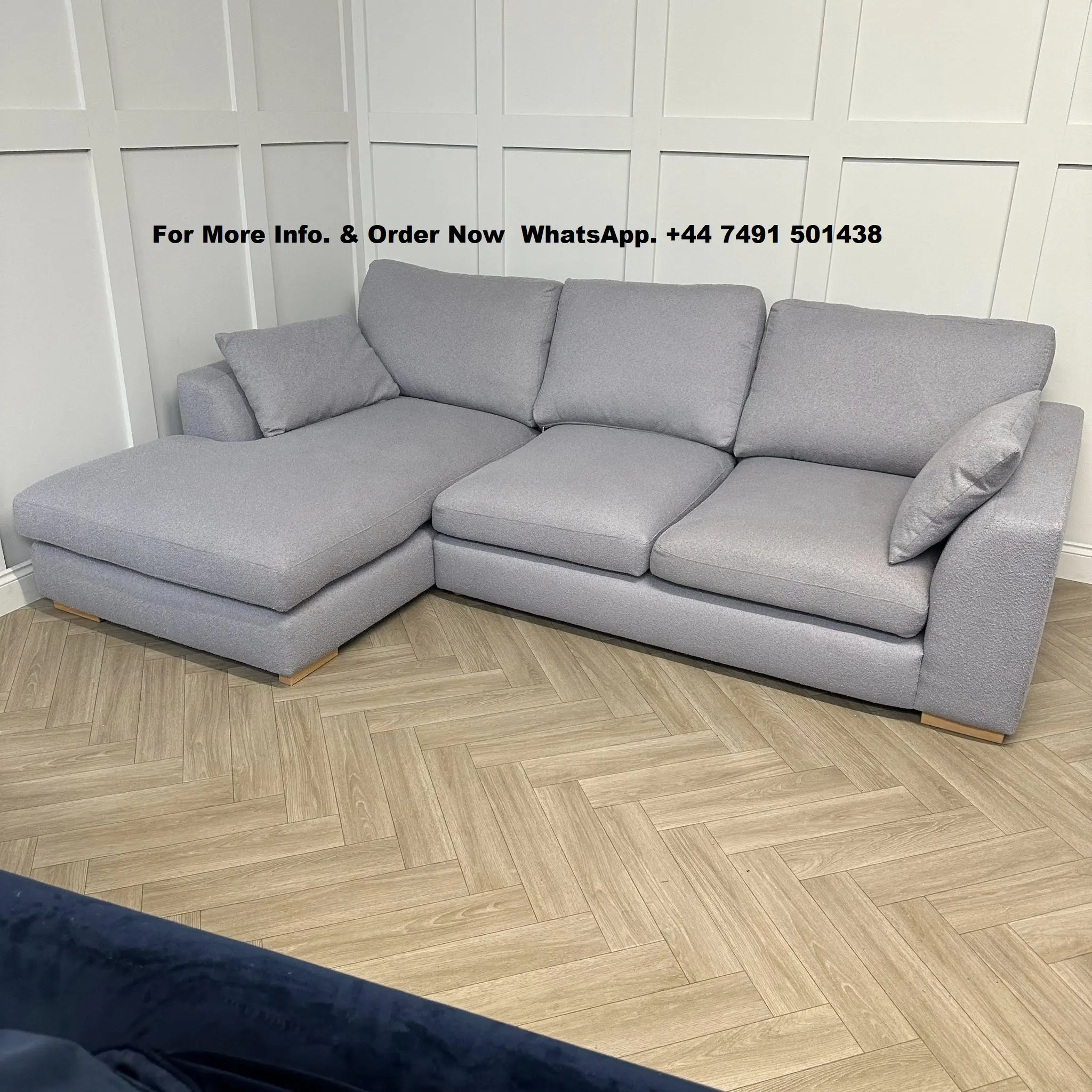 A gorgeous DFS chaise sofa. This sofa has been upholstered in a beautiful grey velvet fabric. This sofa has fibre seat cushions and fibre filled back and side cushions. This sofa is a lounge sofa and so its seats are low to the ground.