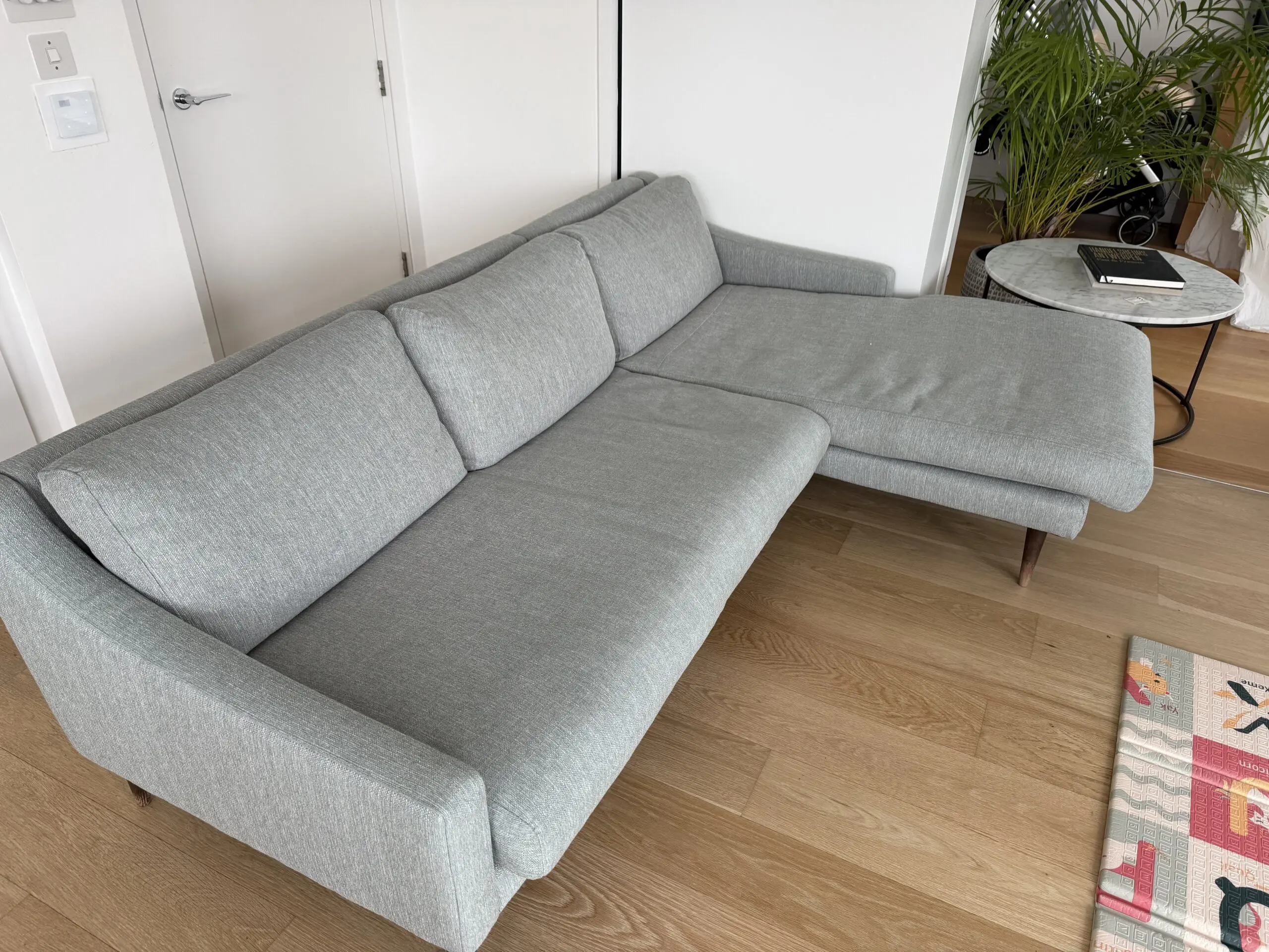 Chic and classic grey marl corner sofa with L-shape chaise longue on the left side.