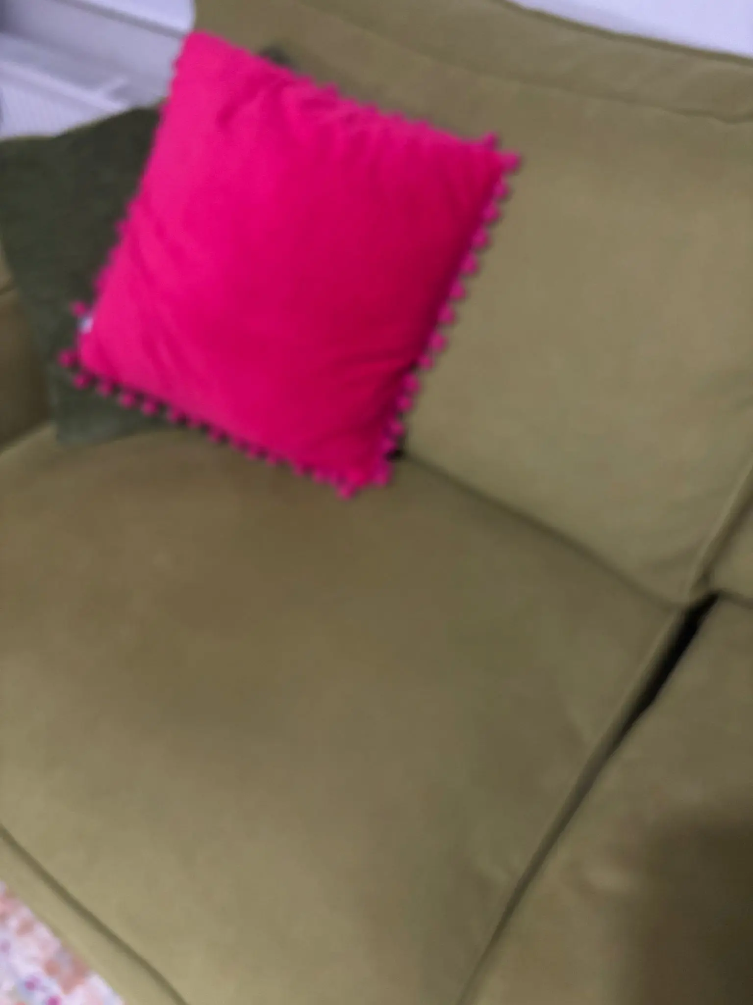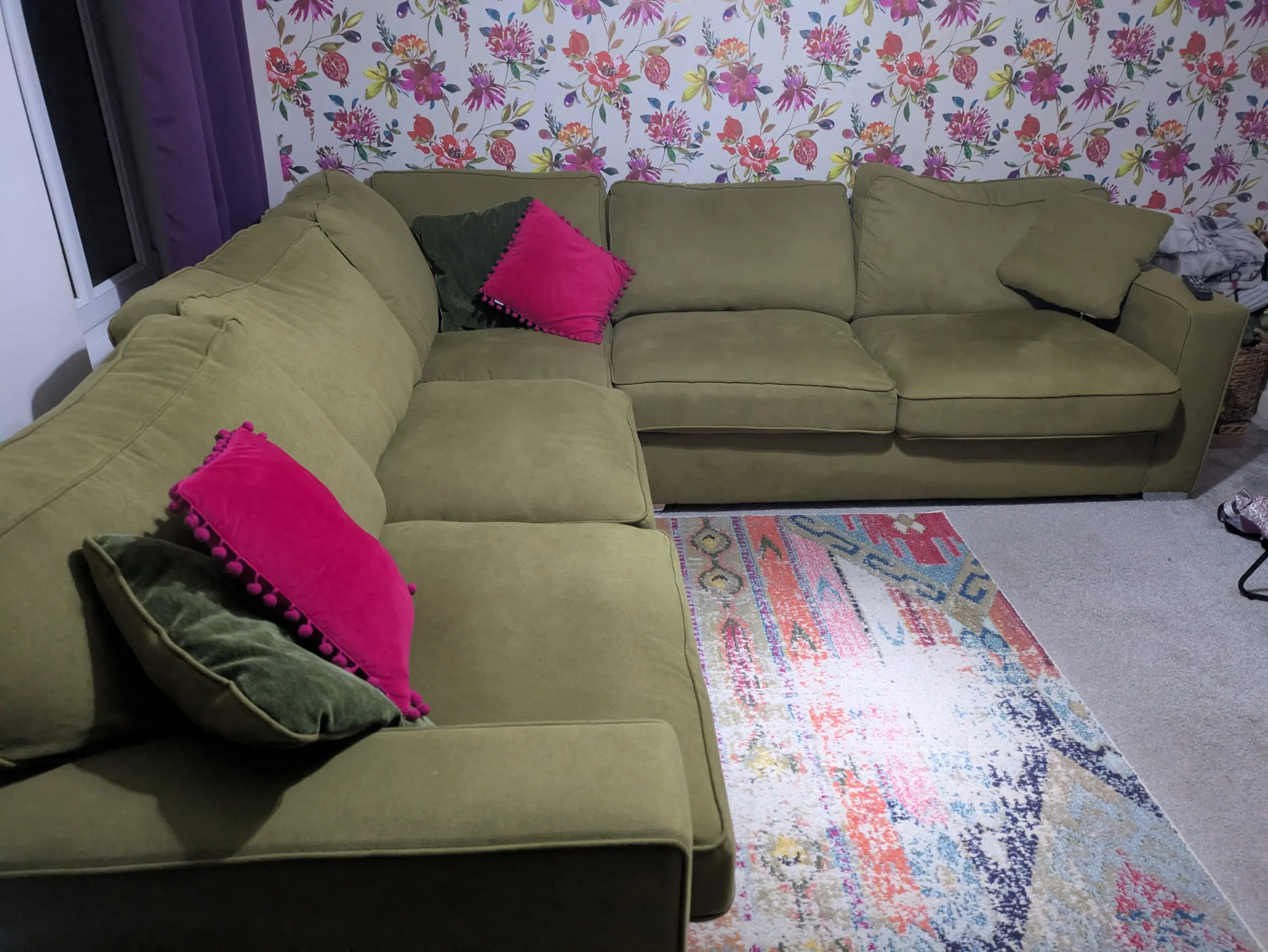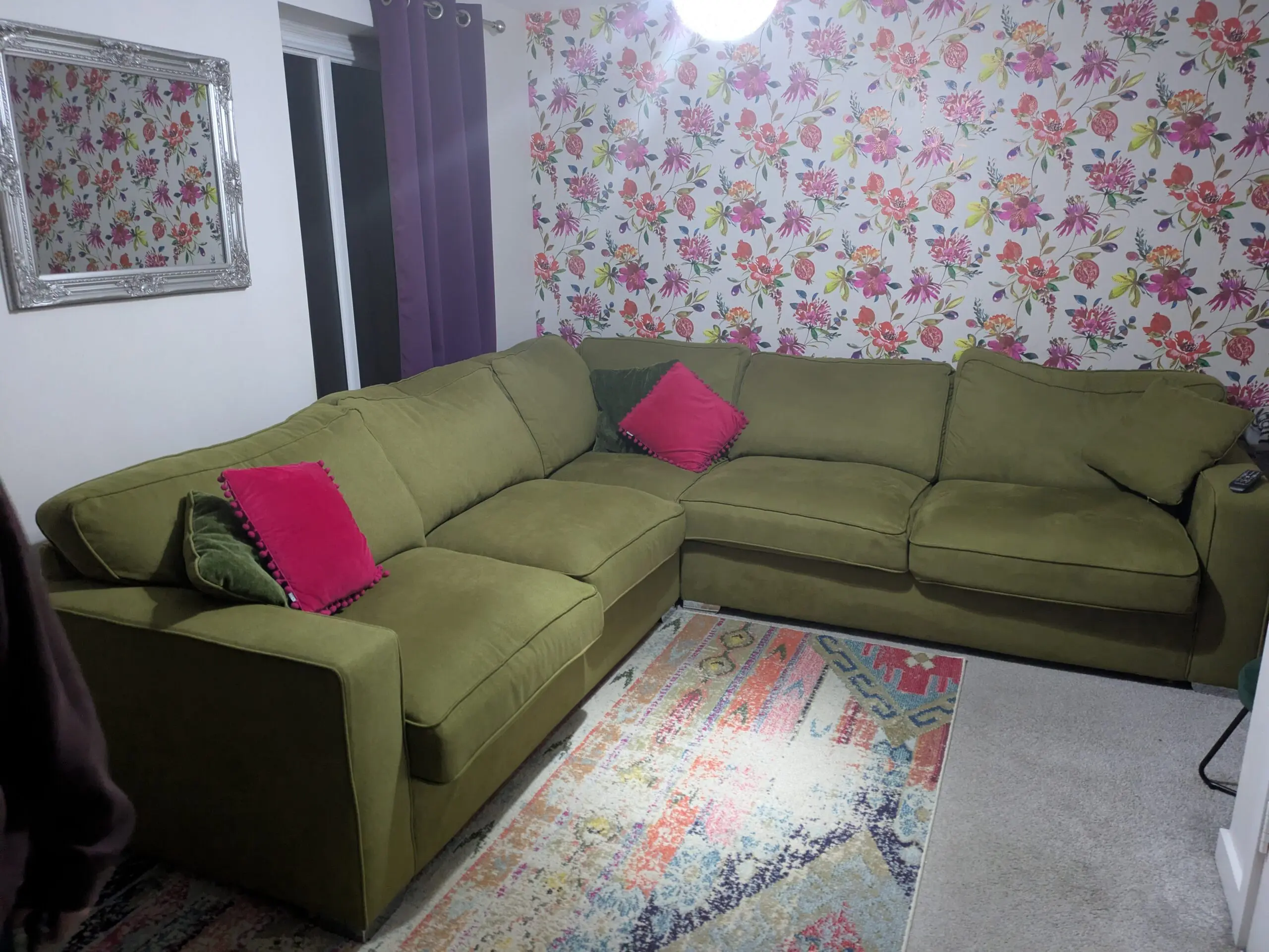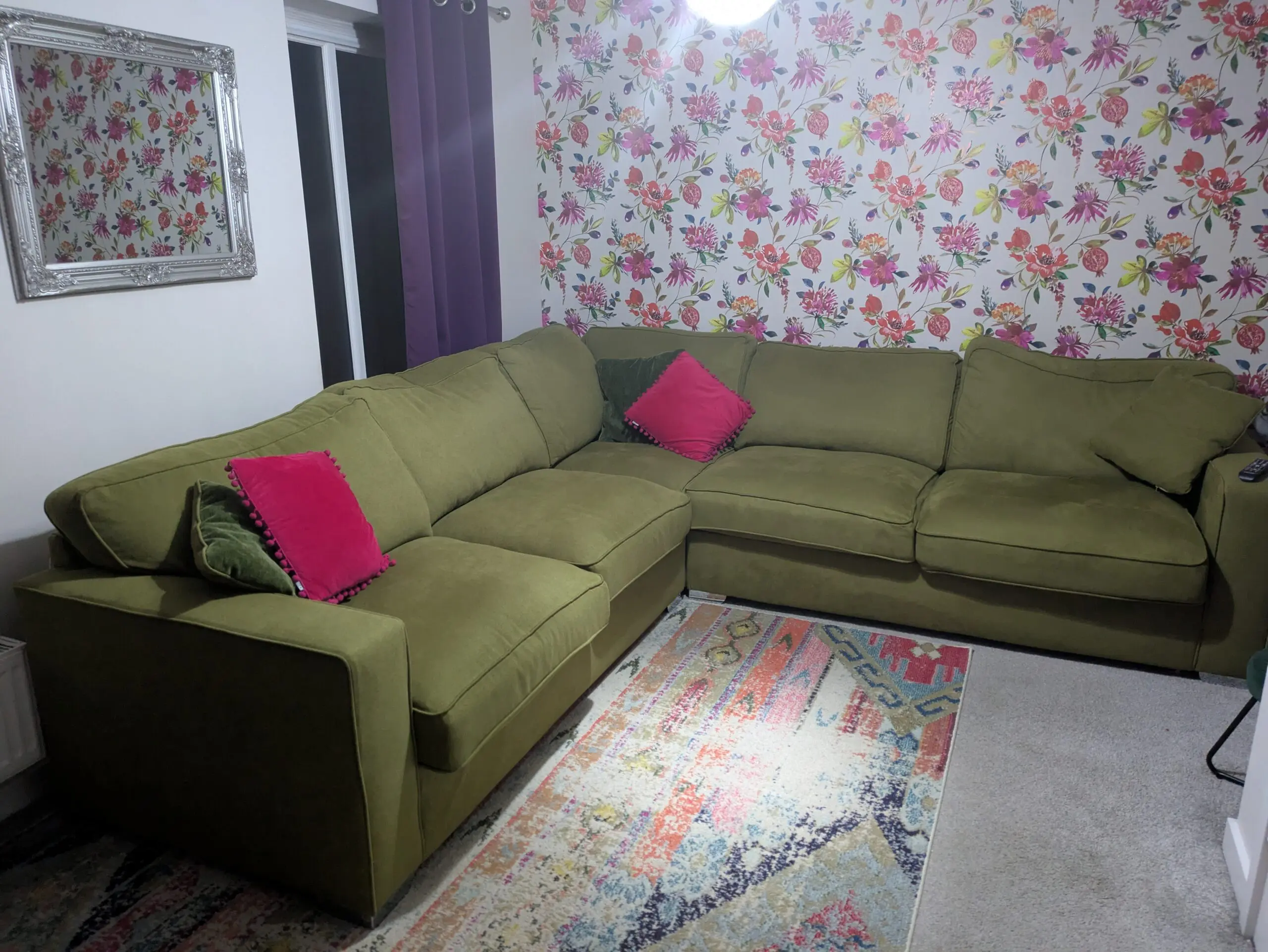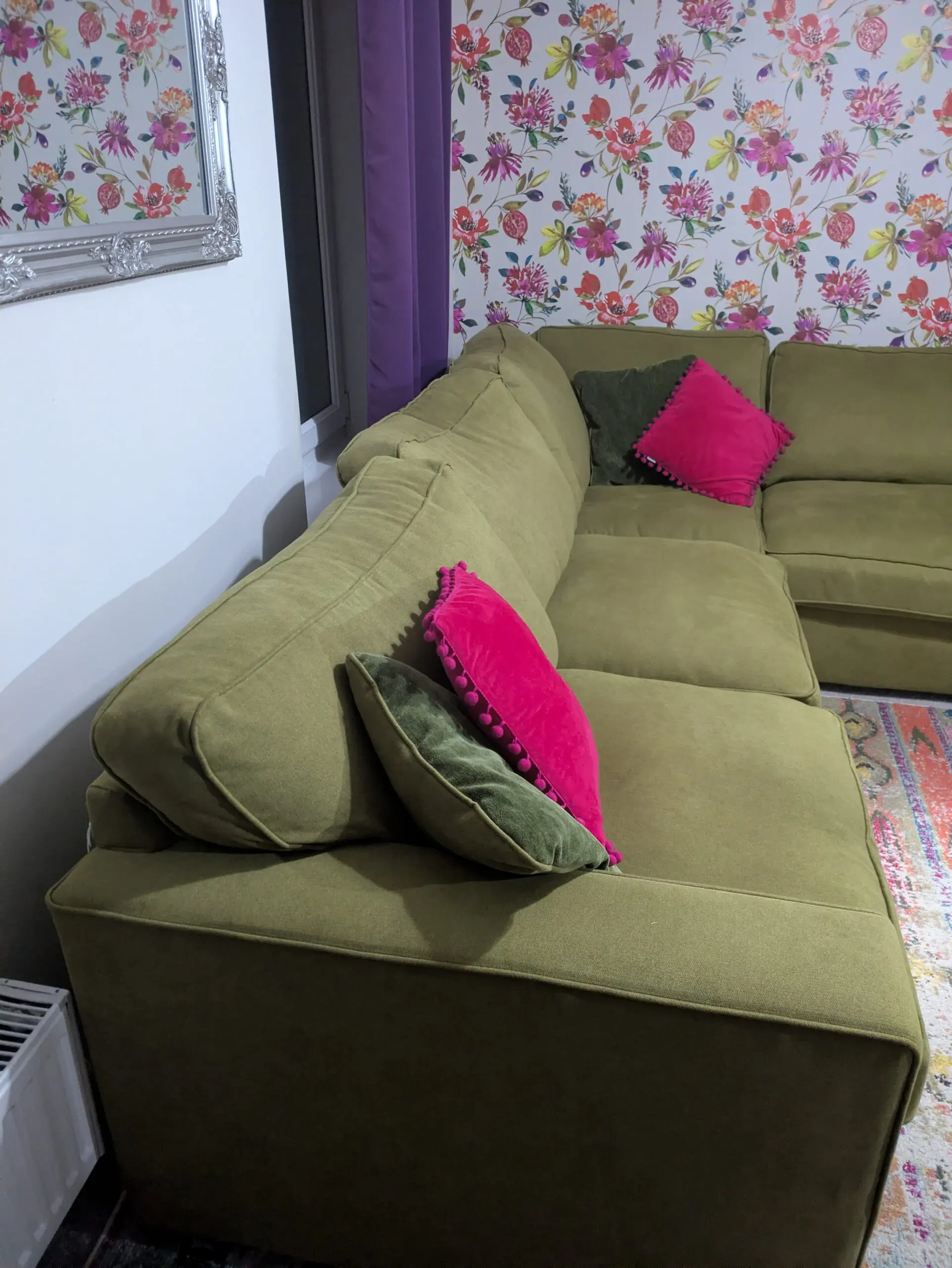 Green corner sofa from Fab Furniture has green and pink Cushions, chrome feet and measures 270 x 283 cm in the L Shape, width from back of the sofa to the edge of the arm is 95cm and the height is 70cm to the back and 80cm with cushions.