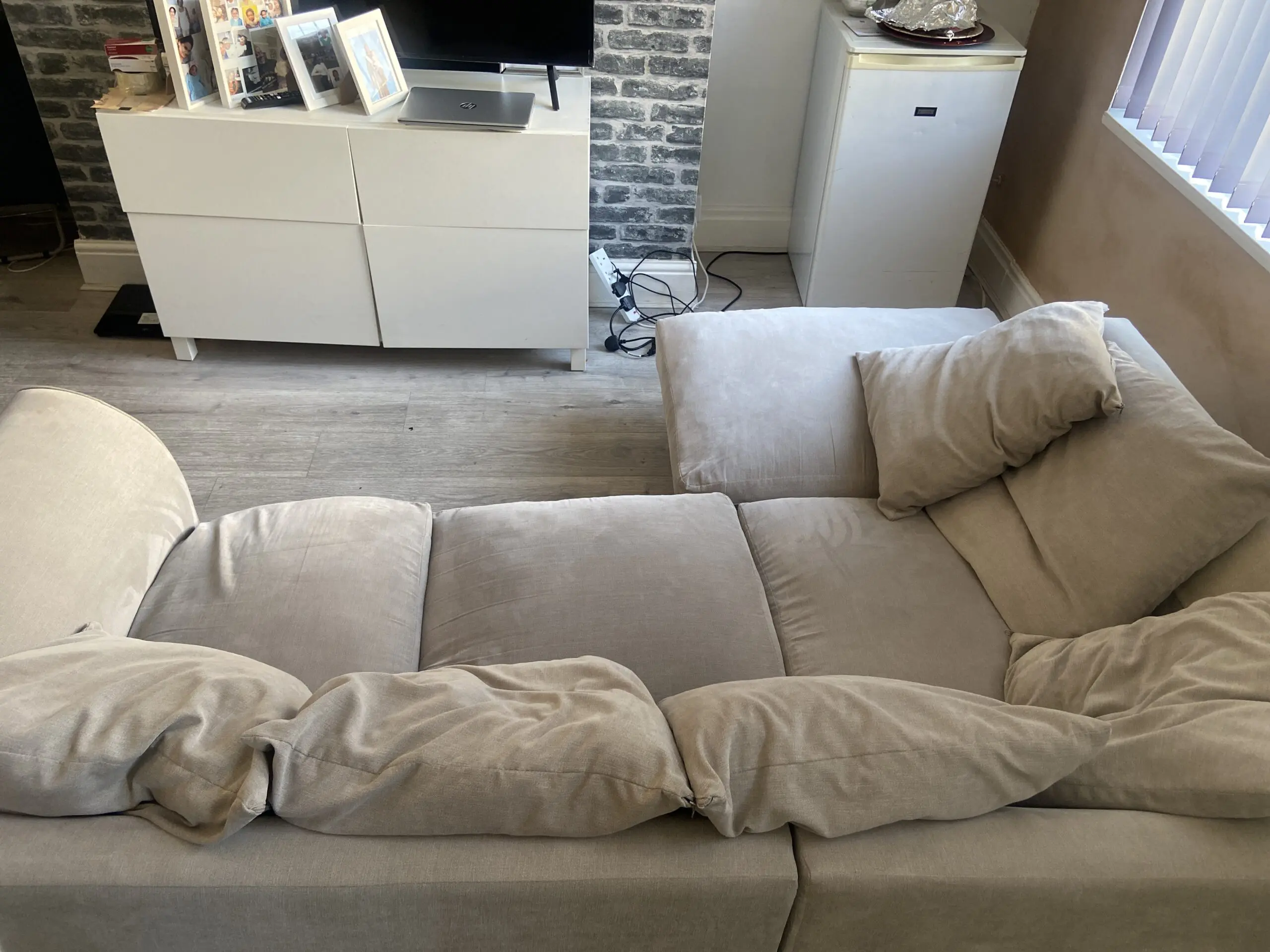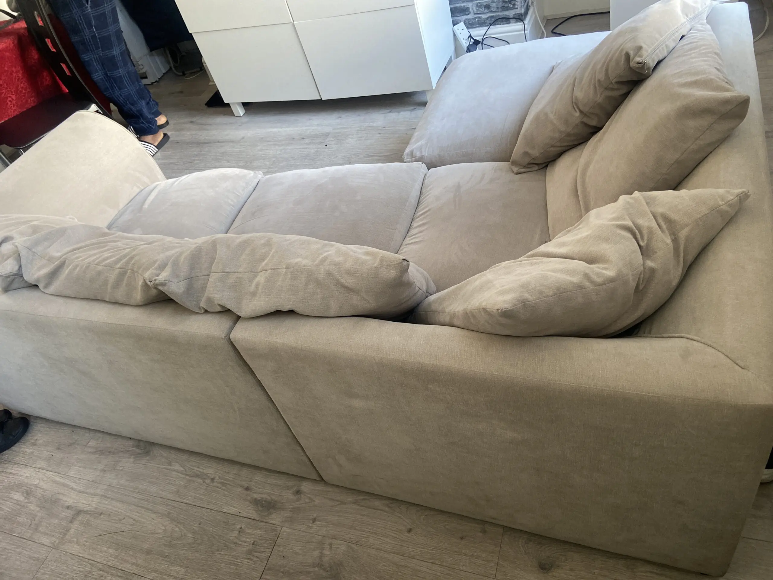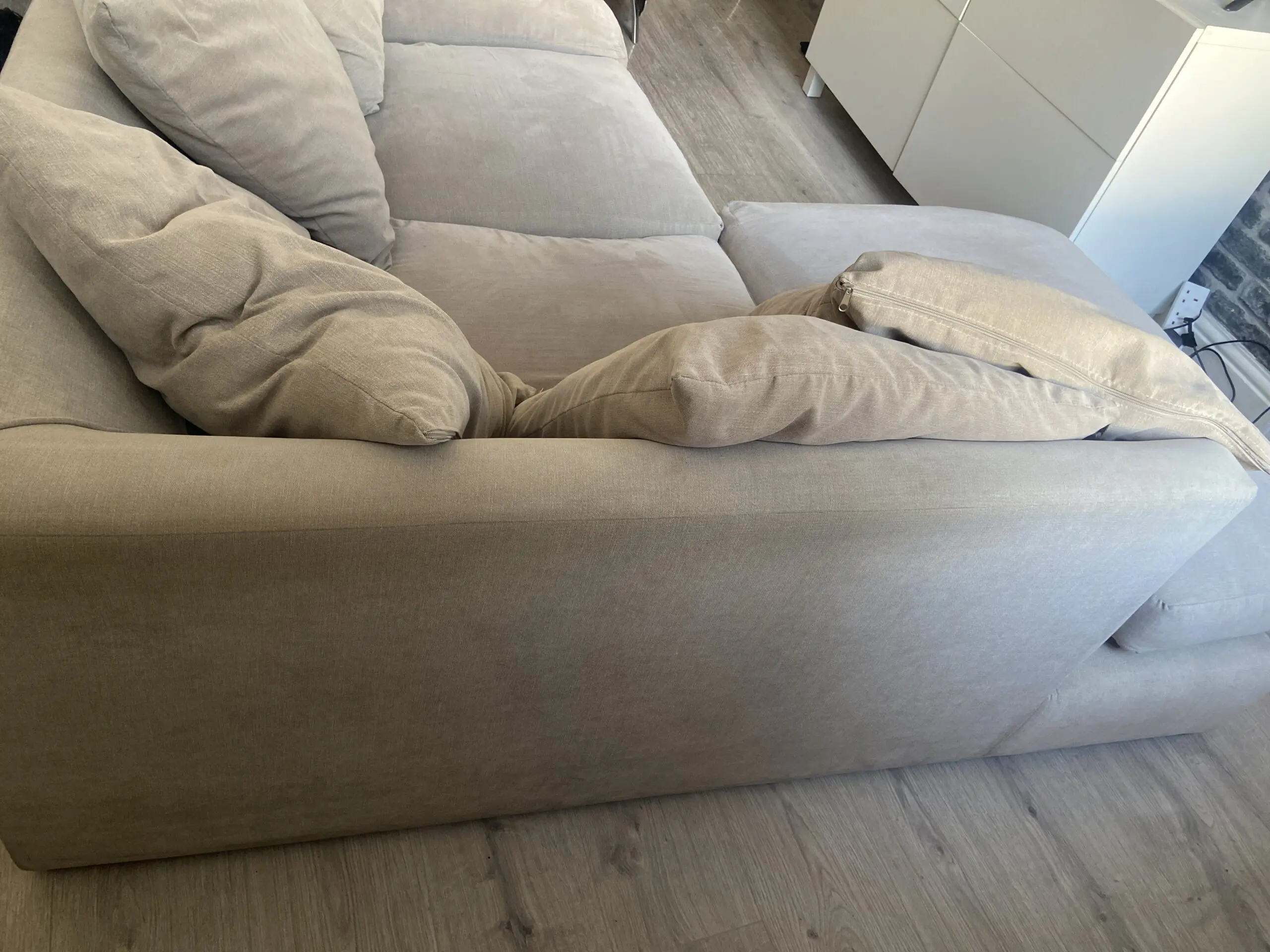 A grey corner sofa with soft fabric upholstery, plush seat cushions, and several matching loose pillows. It has a modern, comfortable design and fits neatly into the corner of the room.