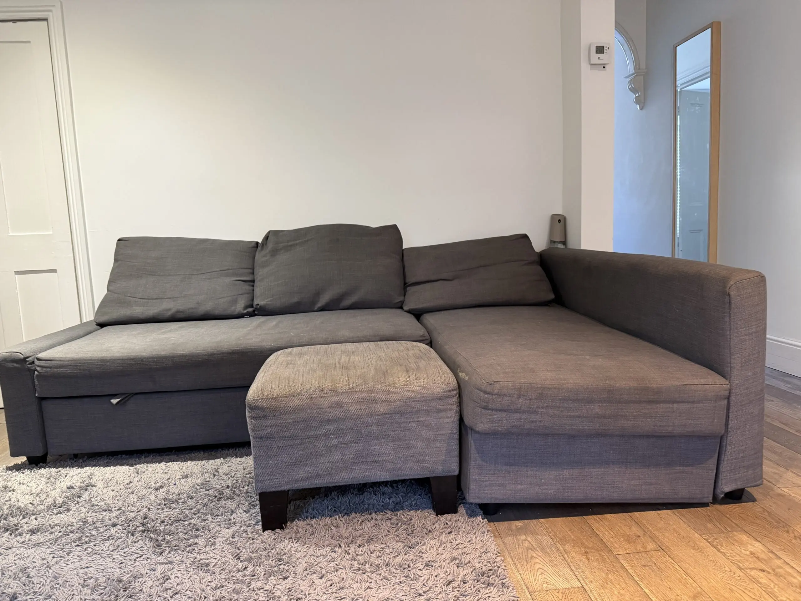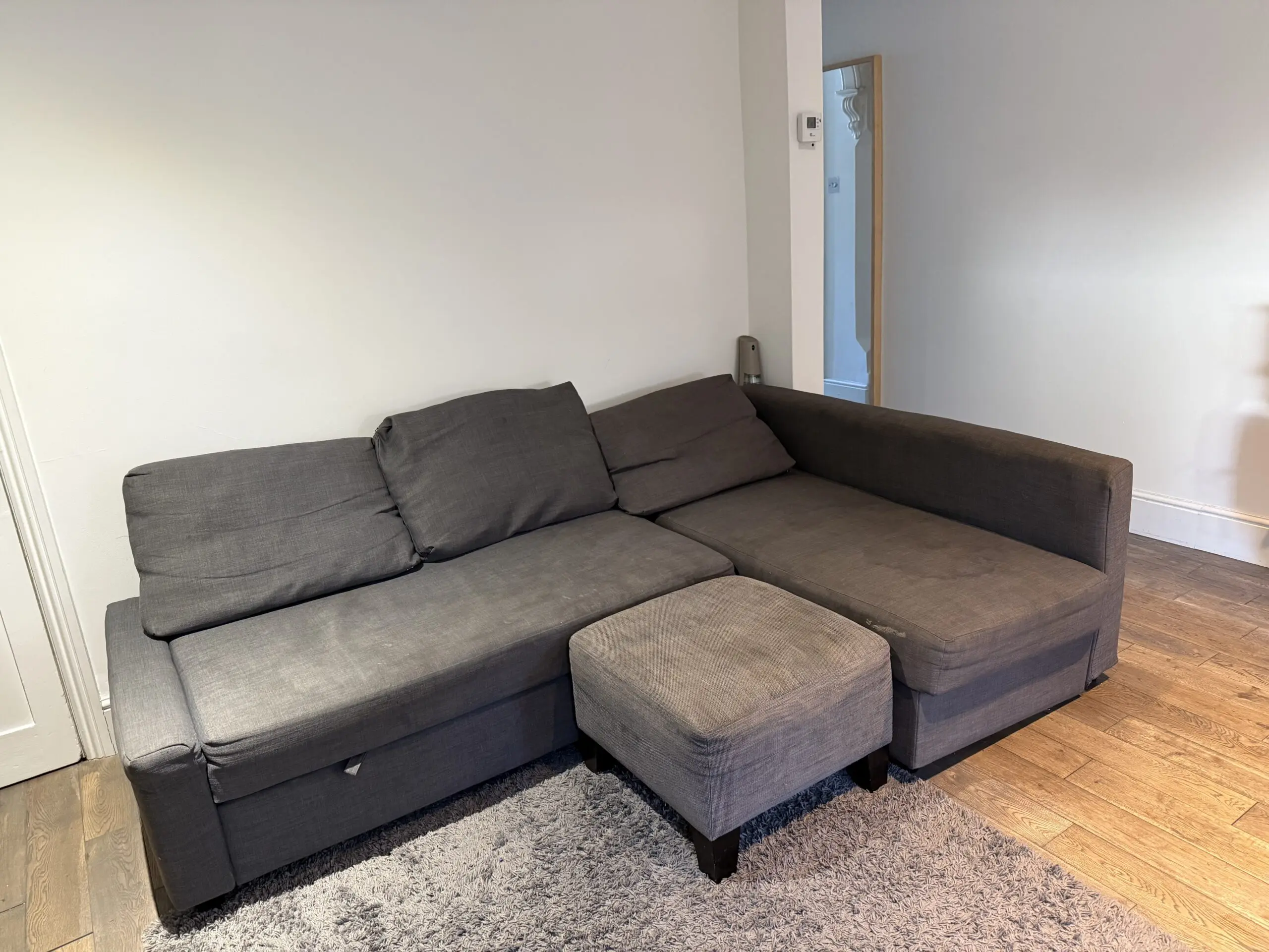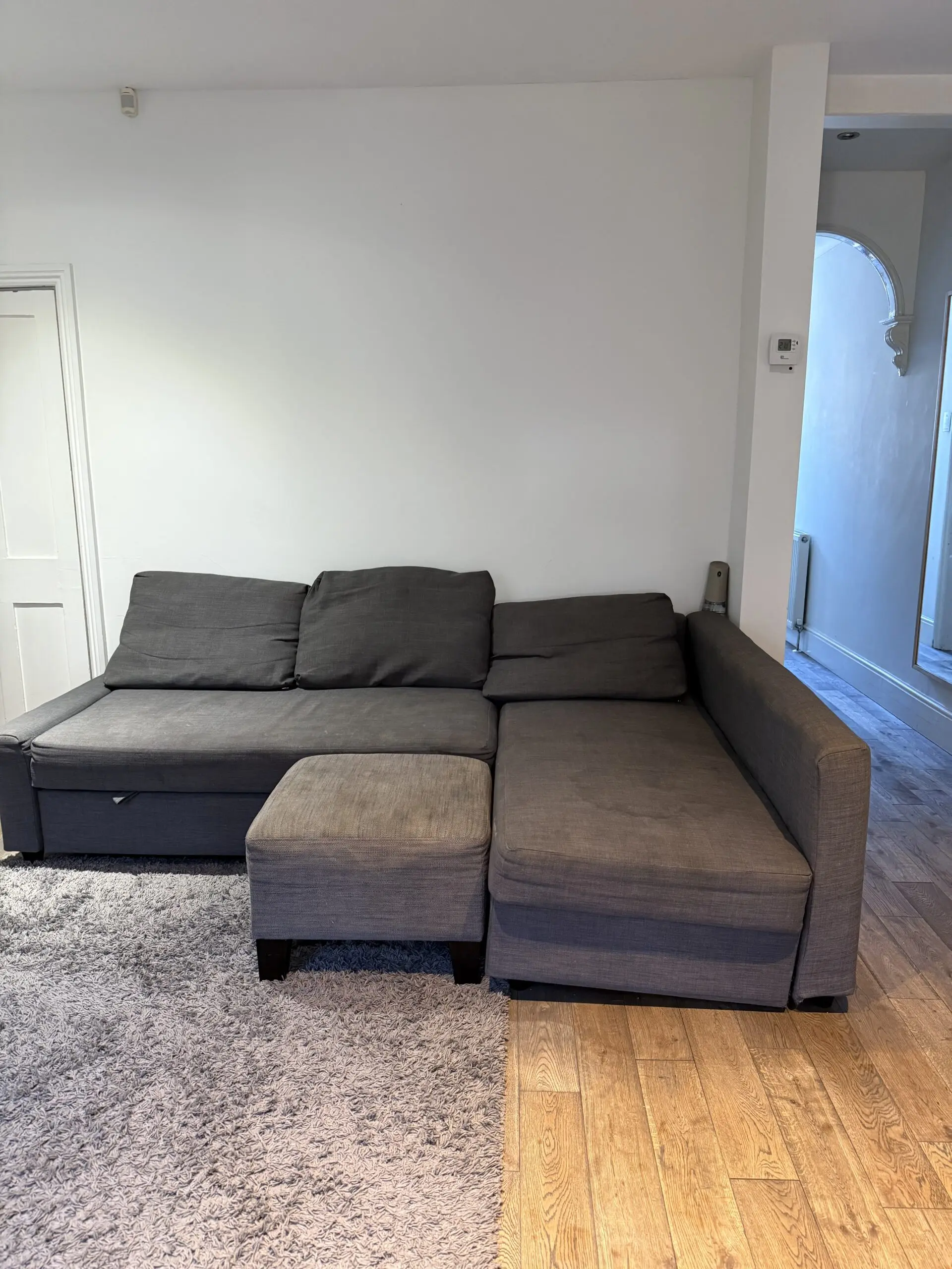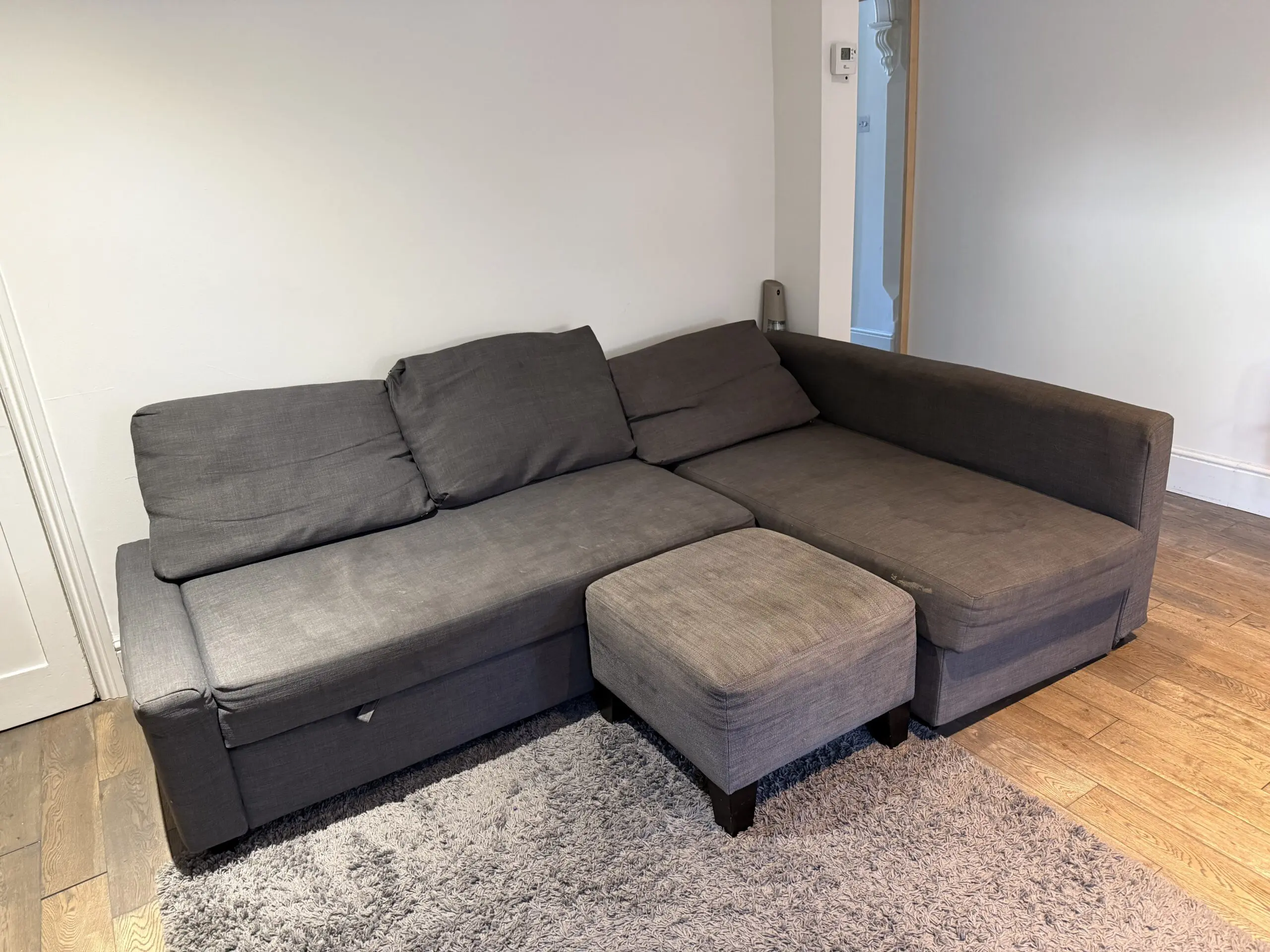 Grey corner sofa with coffee table. In good condition but has some small visible stains which can be washed off.