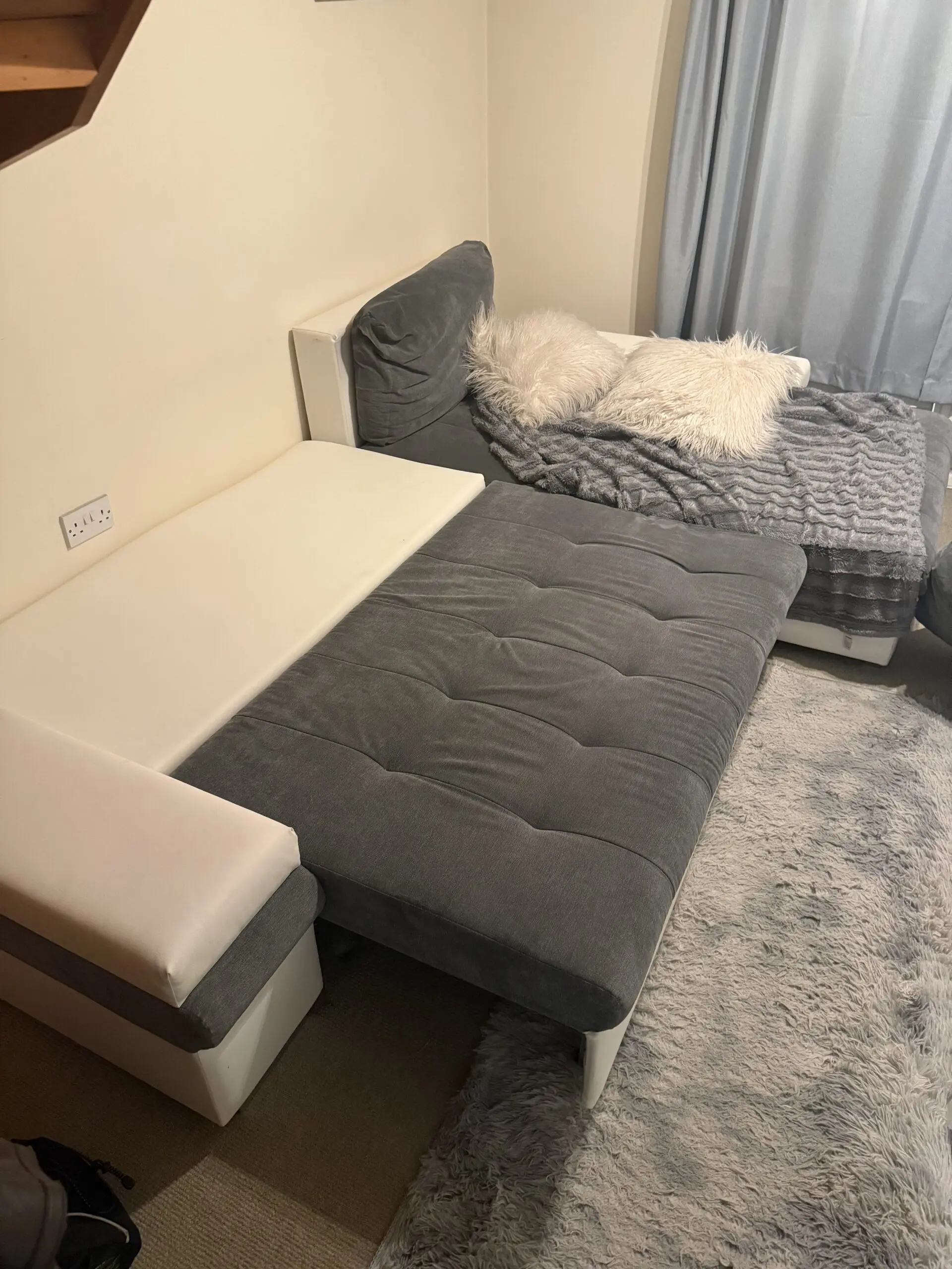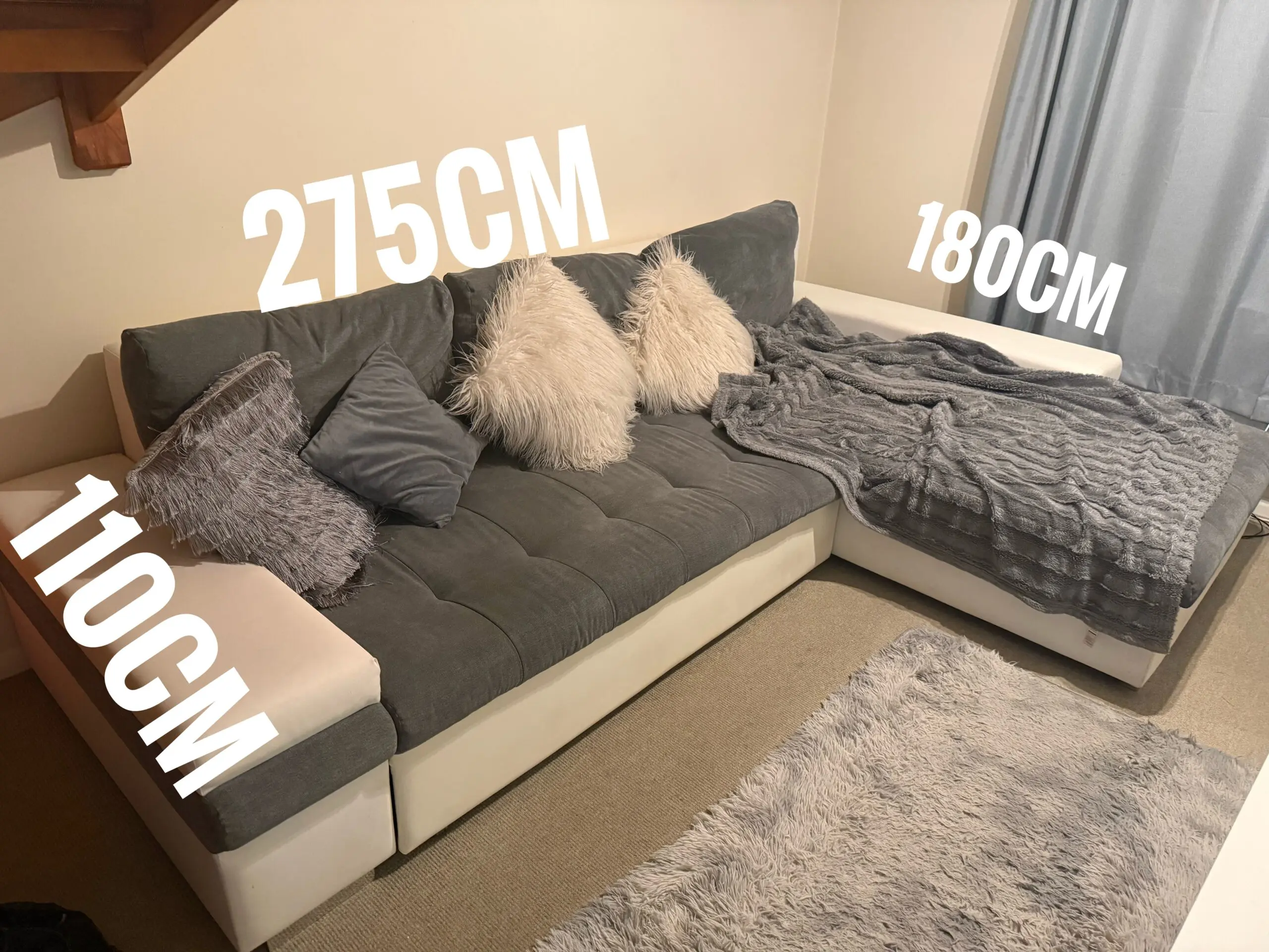 Grey/white corner sofa , has underneath storage , can make it into bed for your guests.