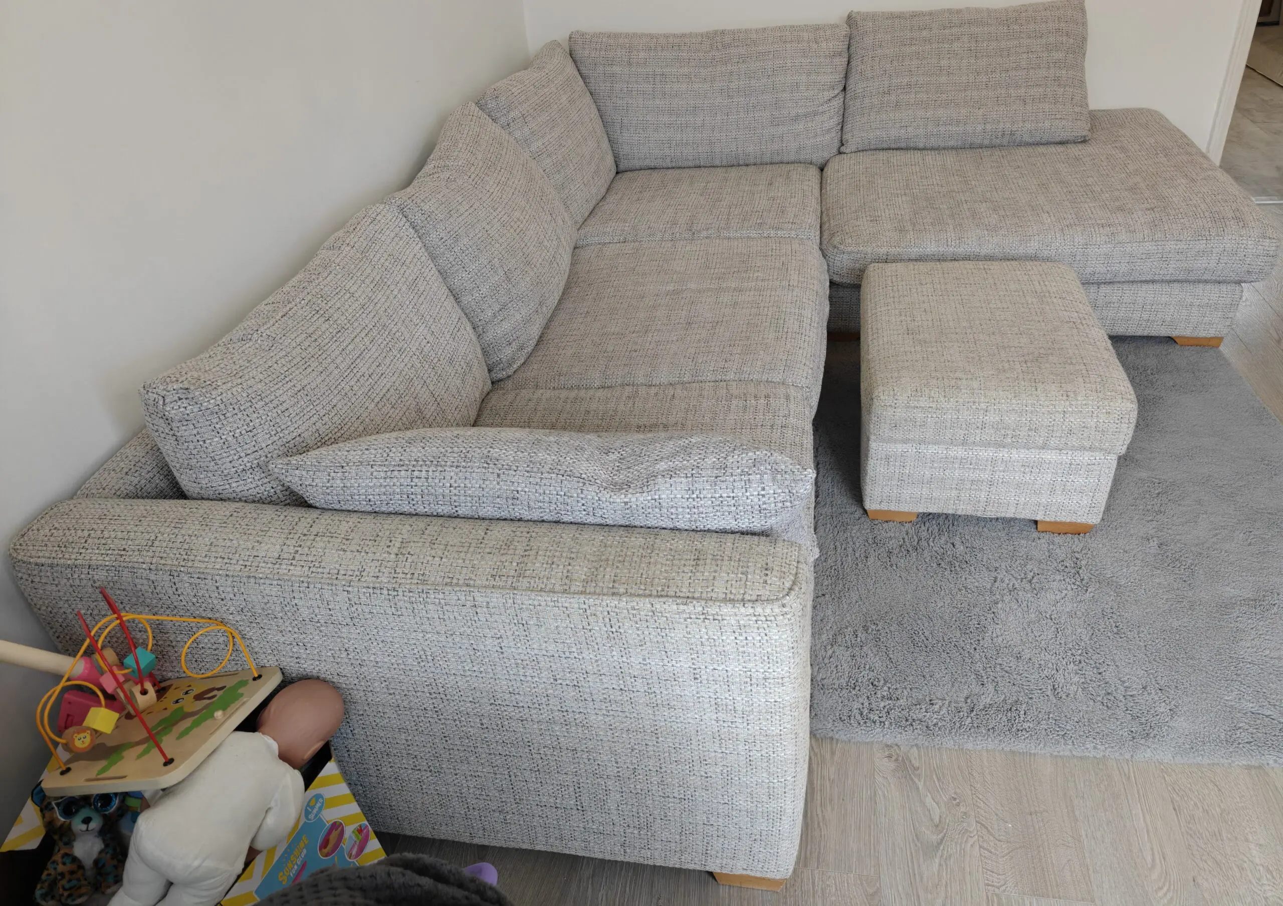 Cosy corner sofa with removable cushion covers, easy to wash. Sofa is cut into 3 parts so easy to take in and out the house without difficulty. Matching pouffe is included in price.