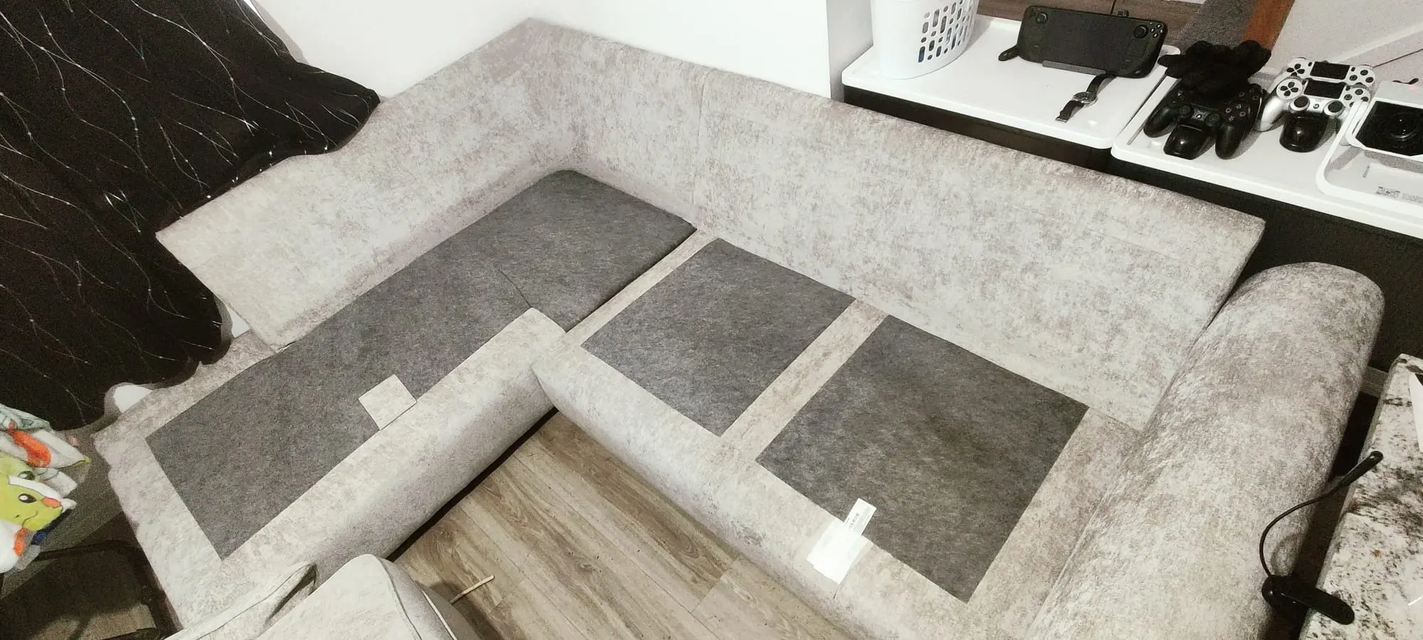 A grey coloured corner sofa with foam cushioning. The cloth fabric is removable and washable.