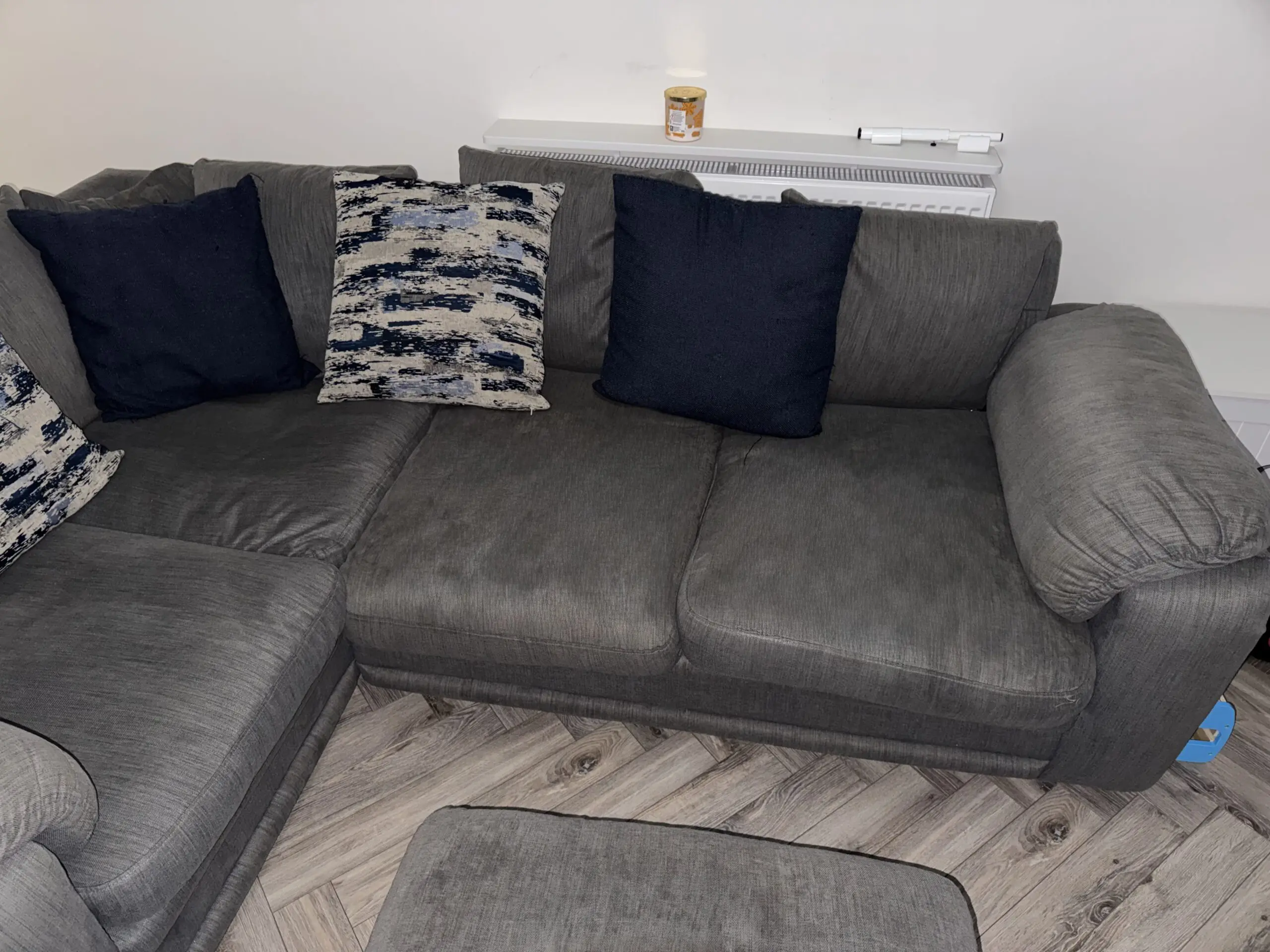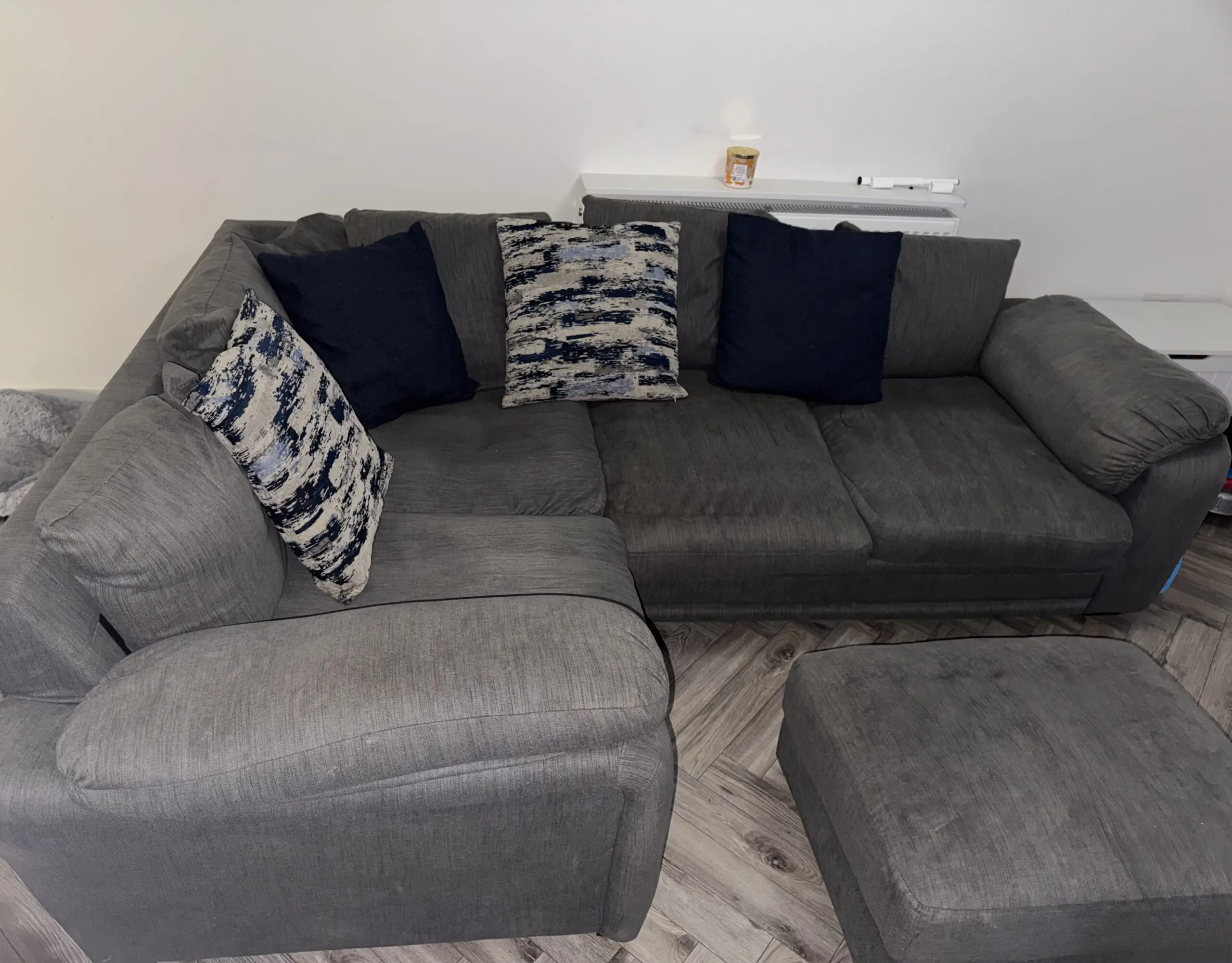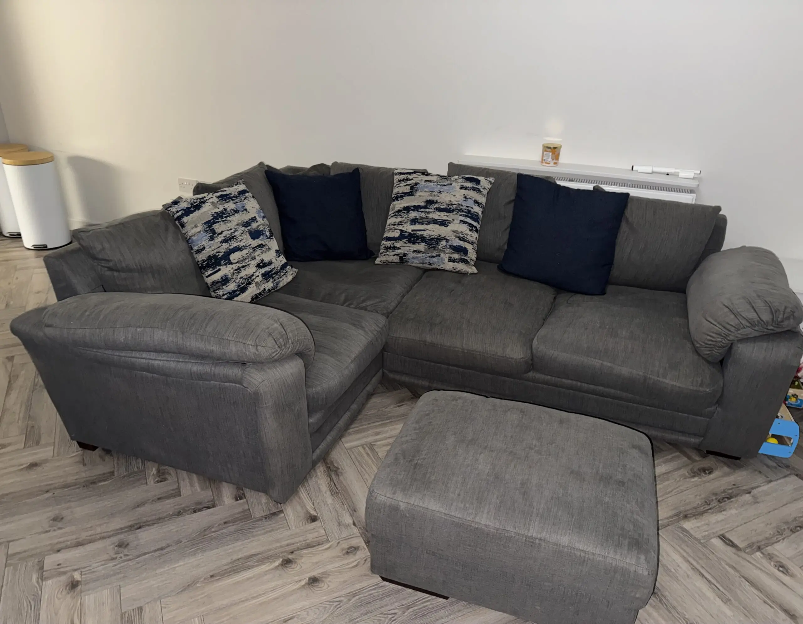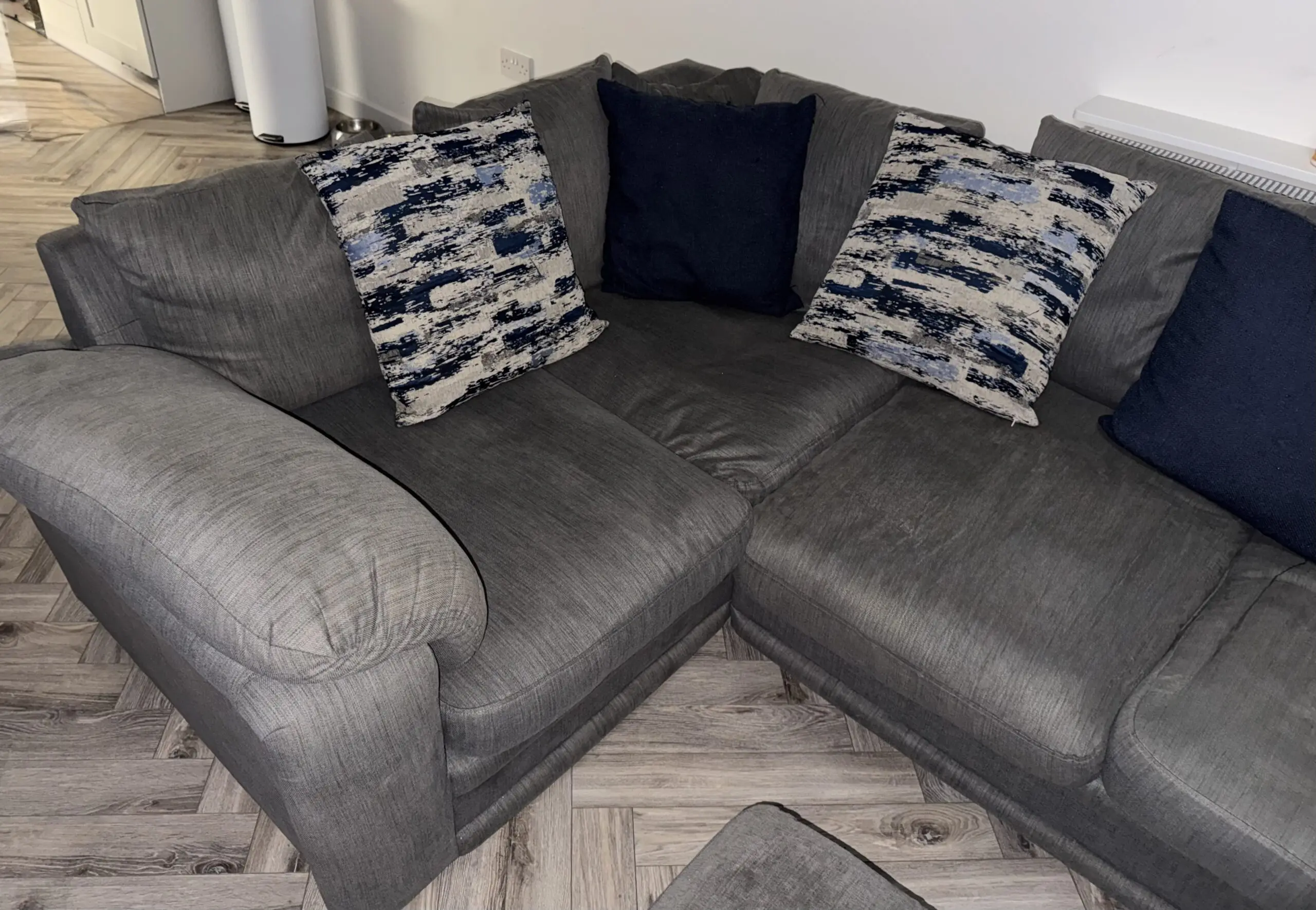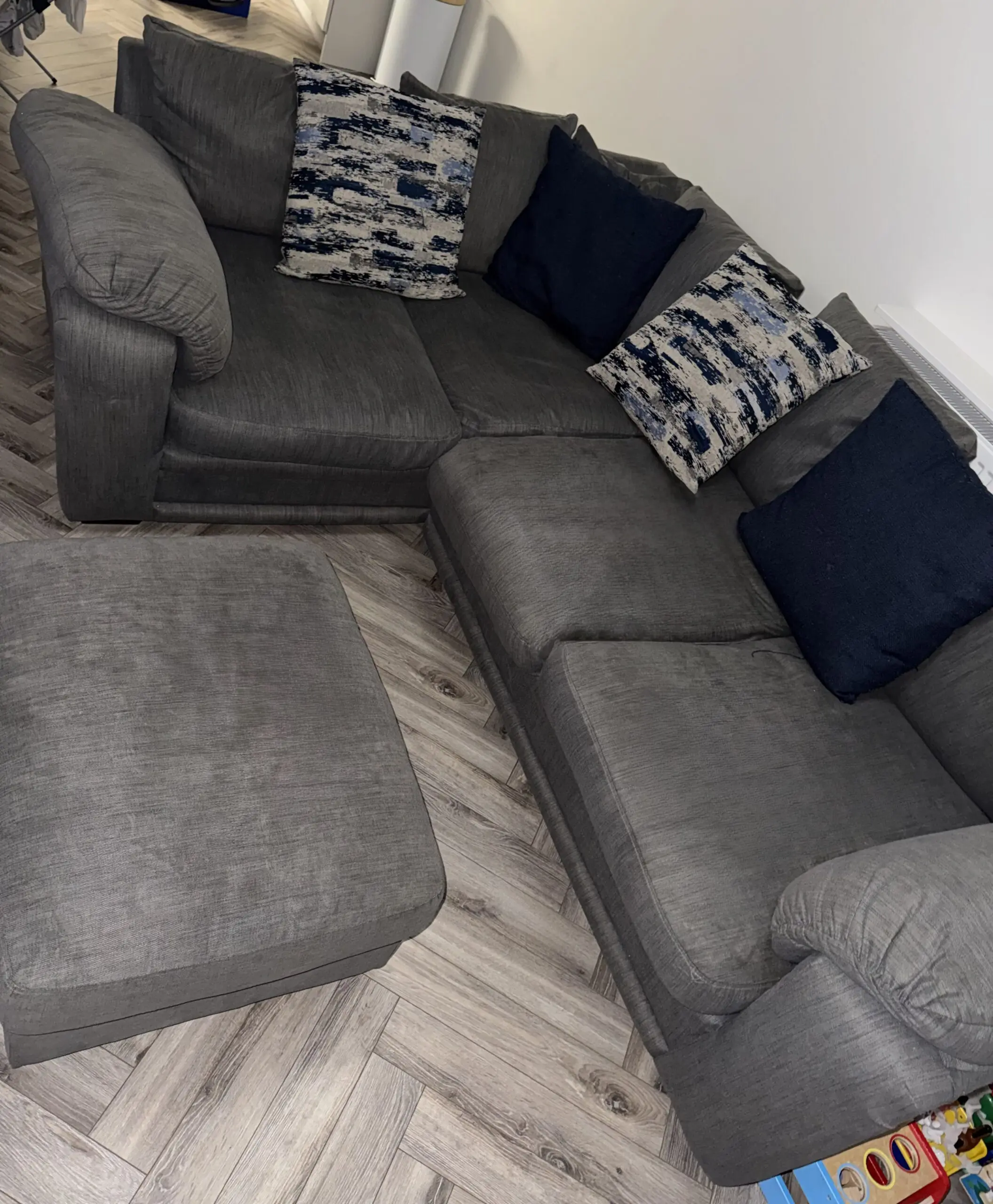 4 seater grey corner sofa with footrest that has storage underneath.