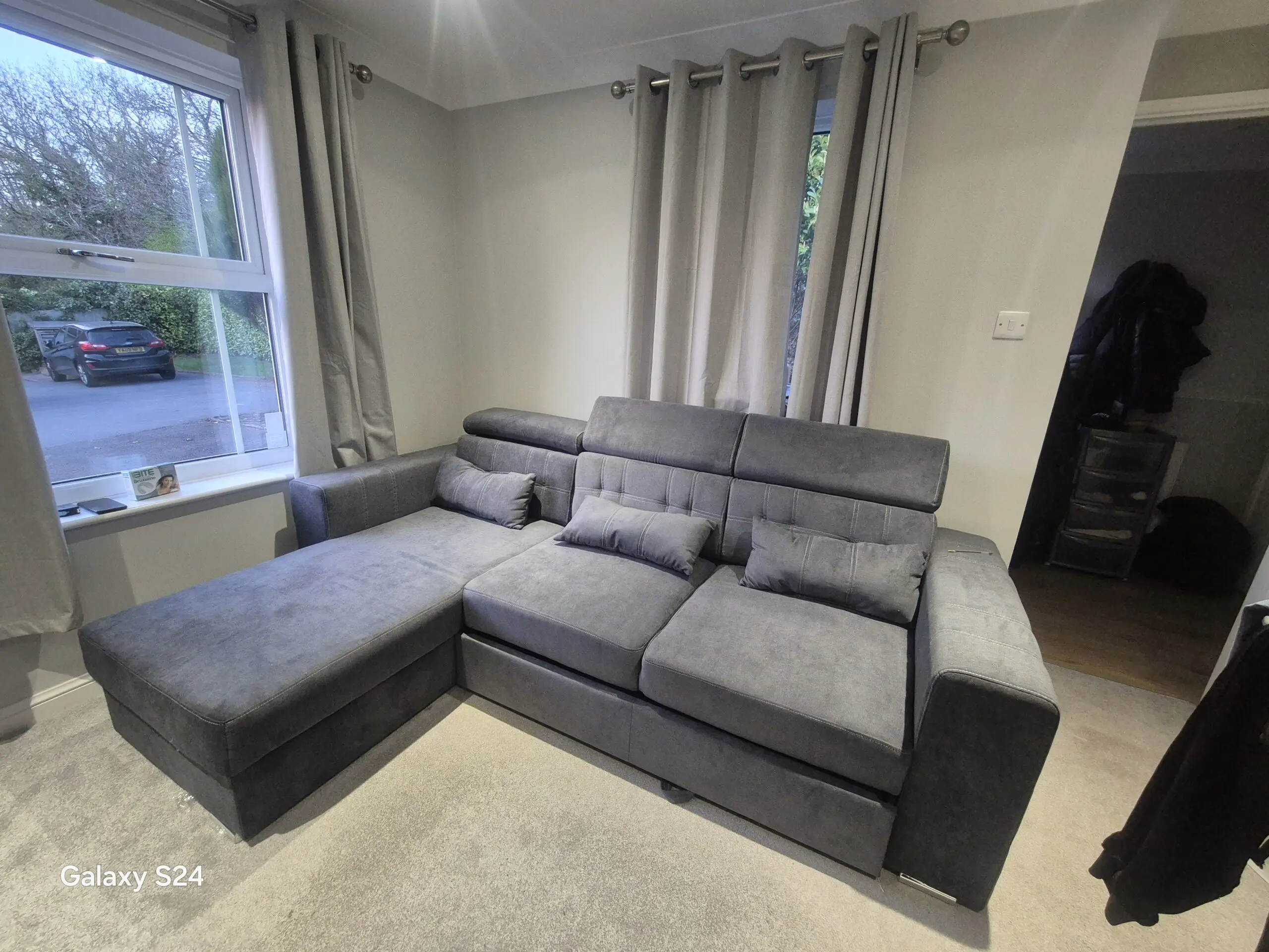 Grey L-shaped corner sofa with storage. Expandable for extra space. Used for less than a year. Kept good as new.