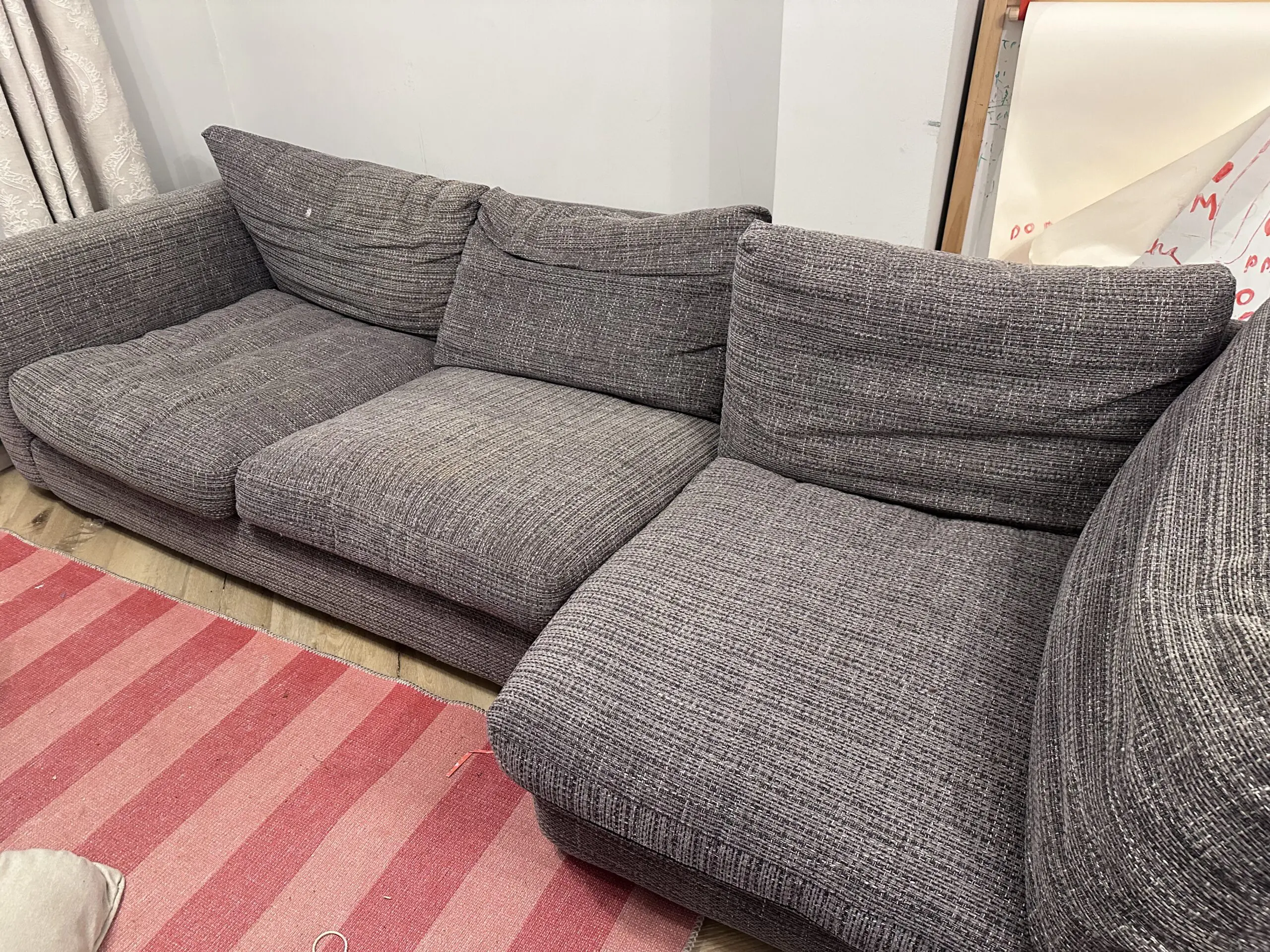 Removable cushions for easy cleaning. Grey DFS corner sofa. Very deep seats for relaxing. Easily fits 5 adults.