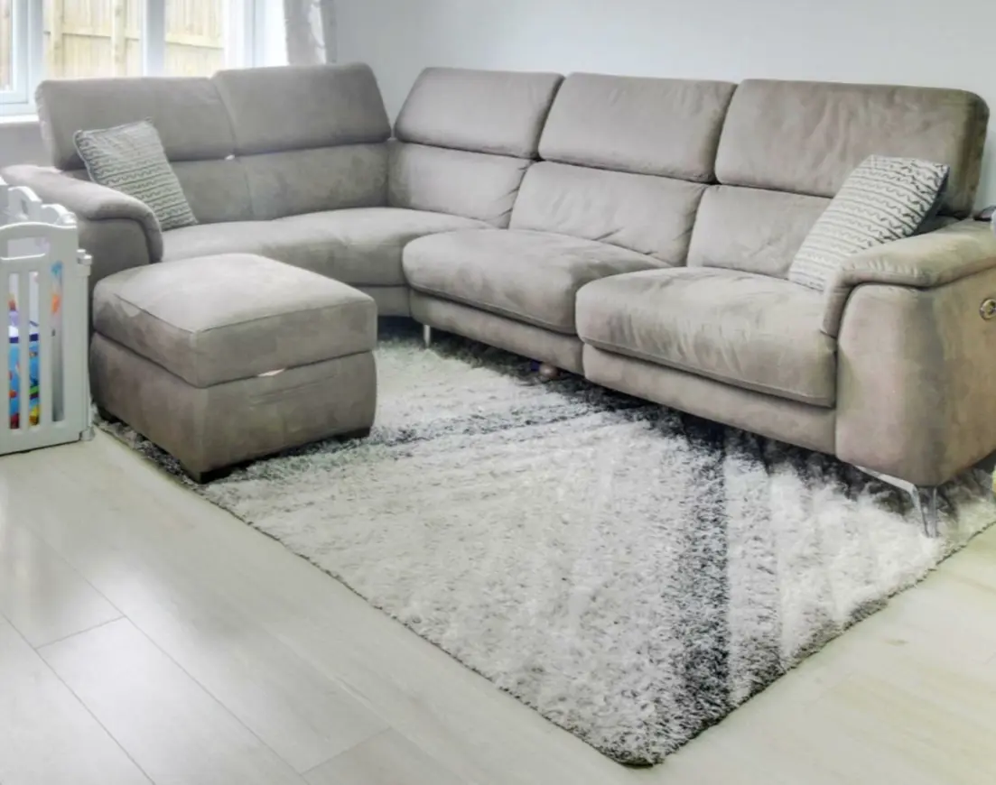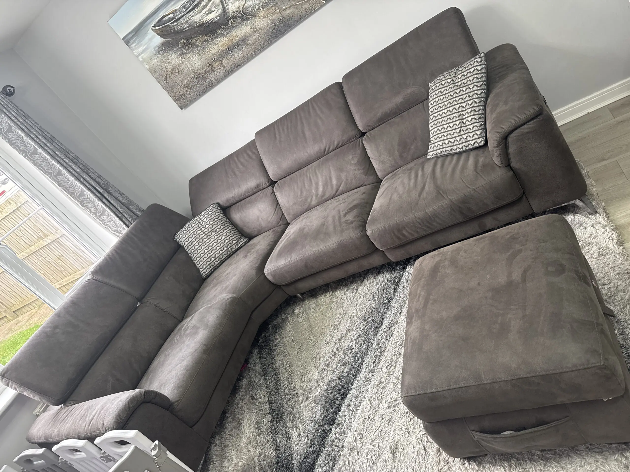 Grey suede corner sofa from dfs, in brilliant condition, also comes with storage stool