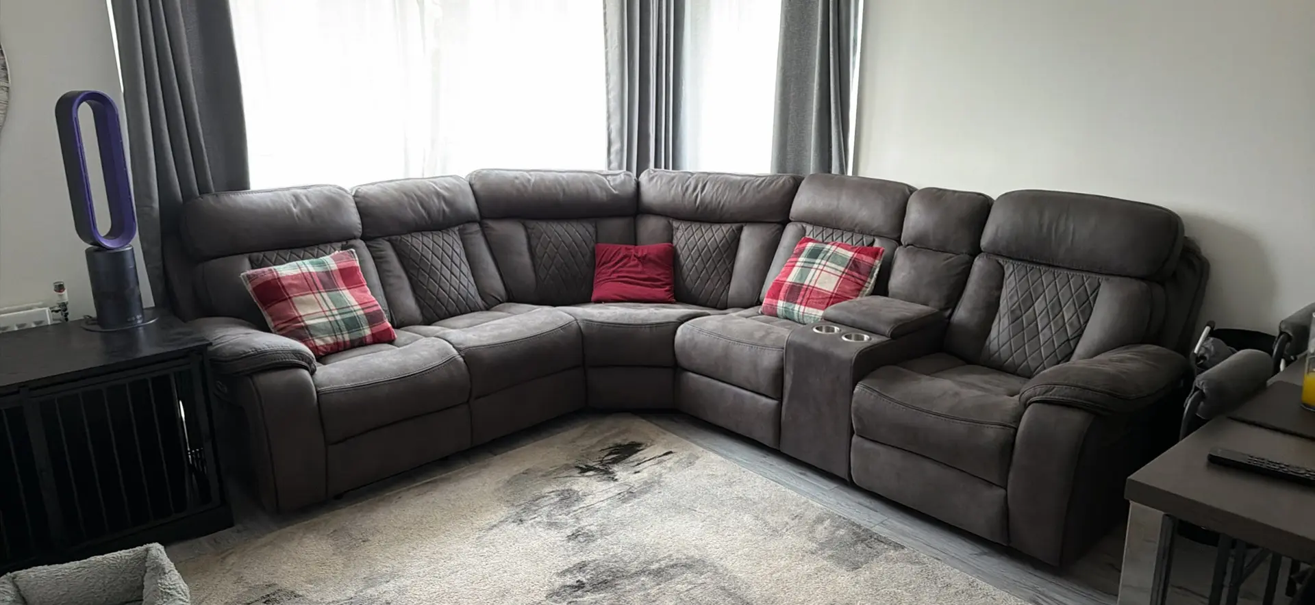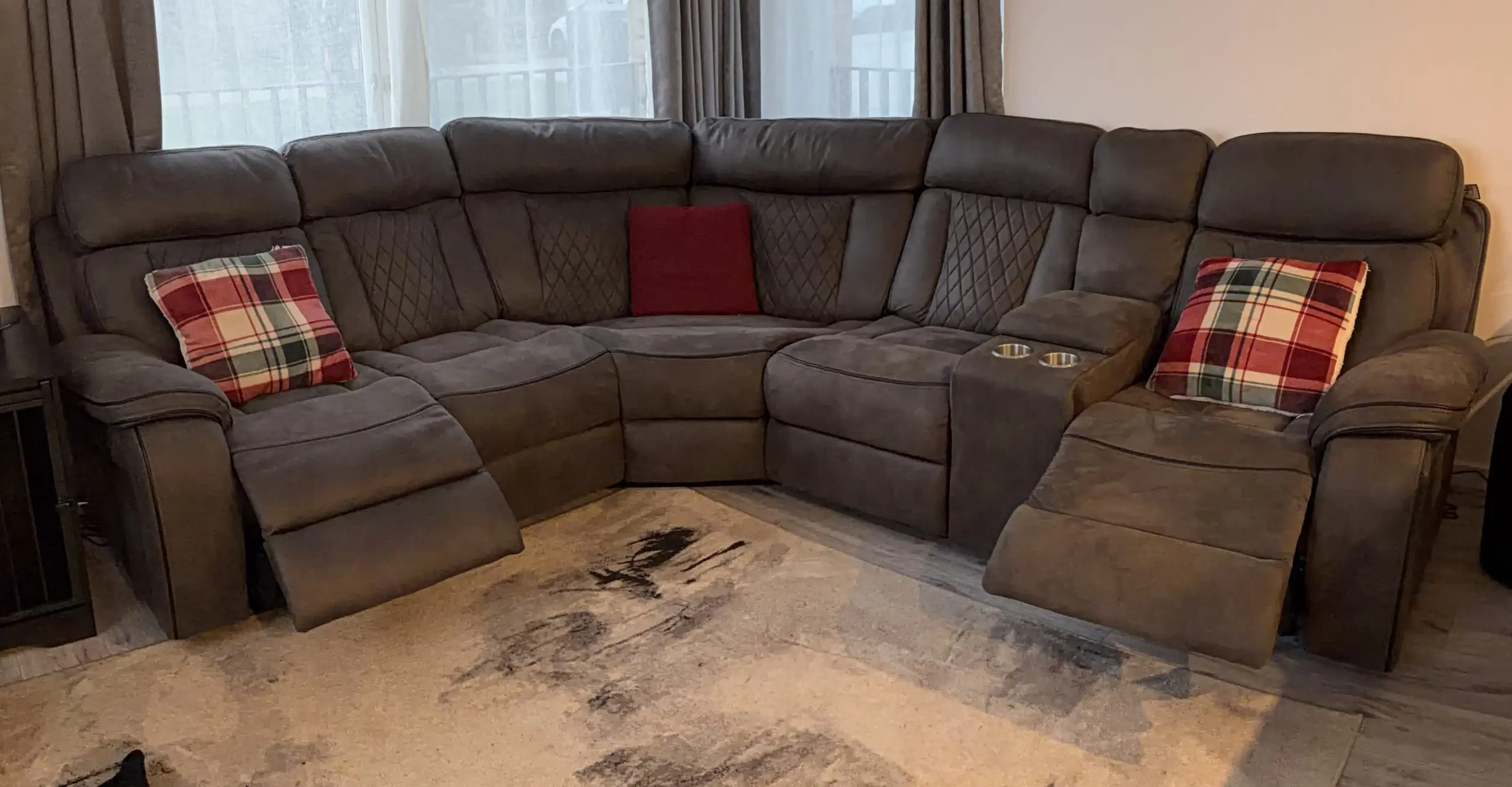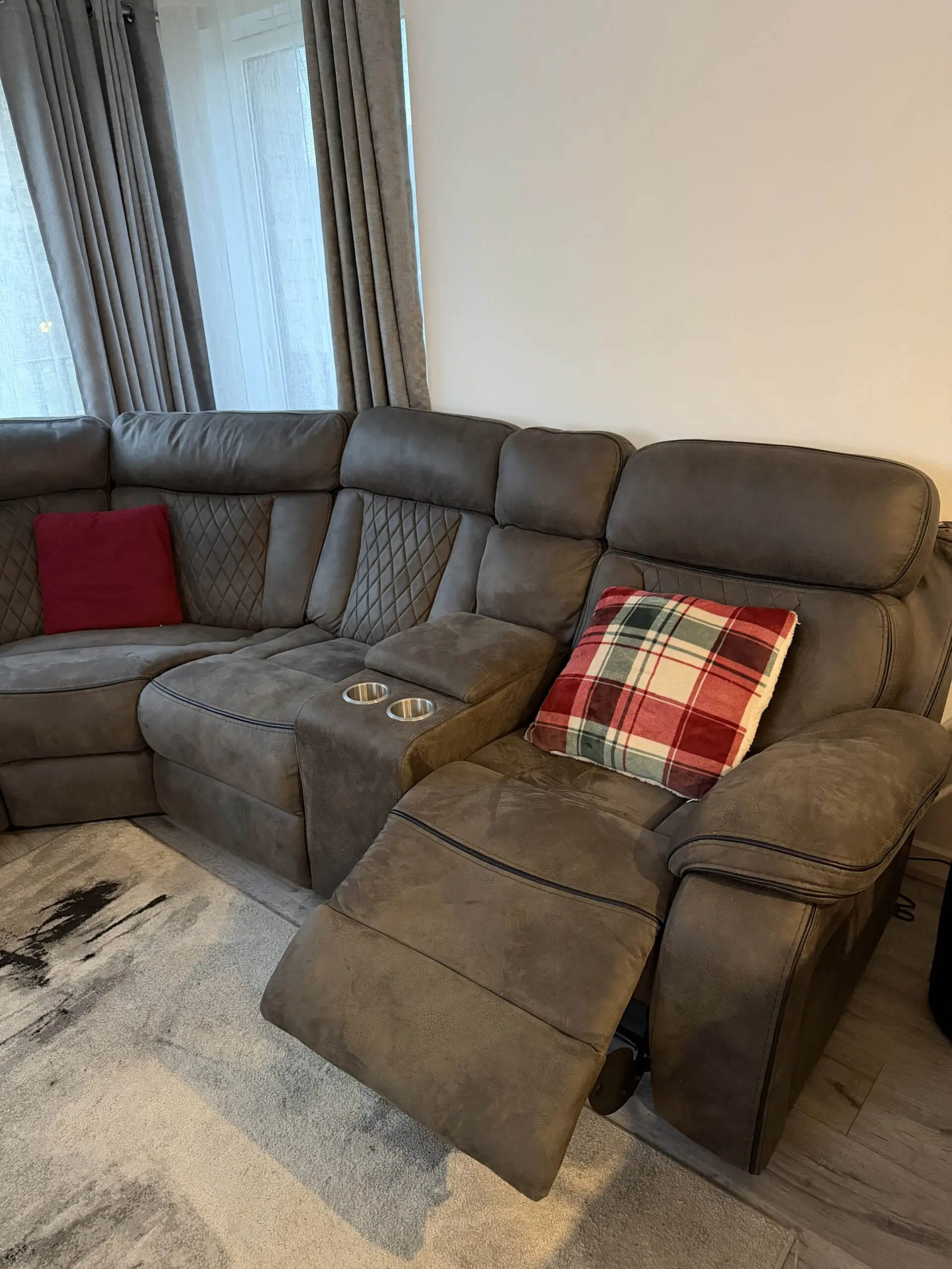 Kobe collection corner sofa with 2 recliners at each end and a cup holder with storage module