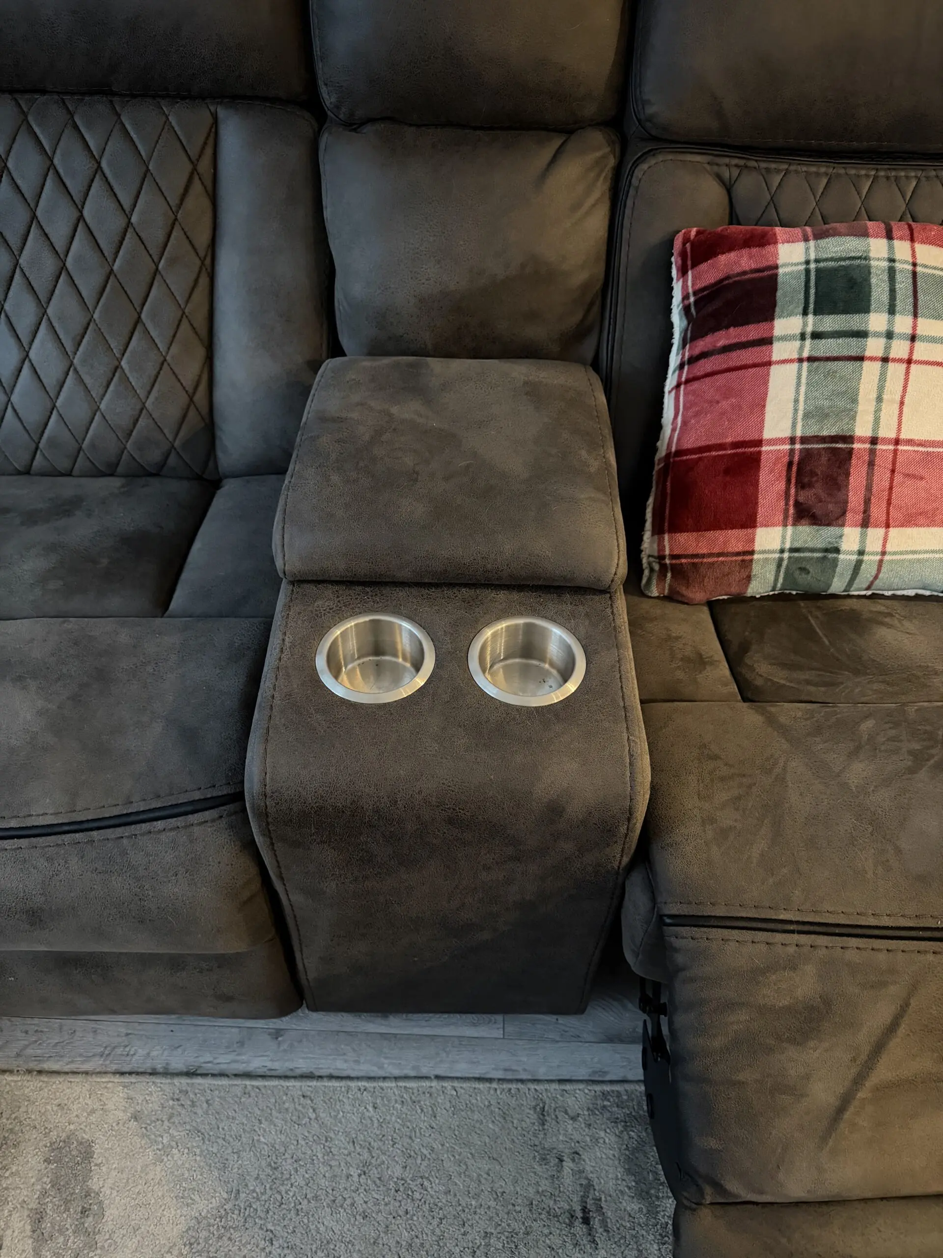 Listed as charcoal but it’s more brown with black piping around edges etc