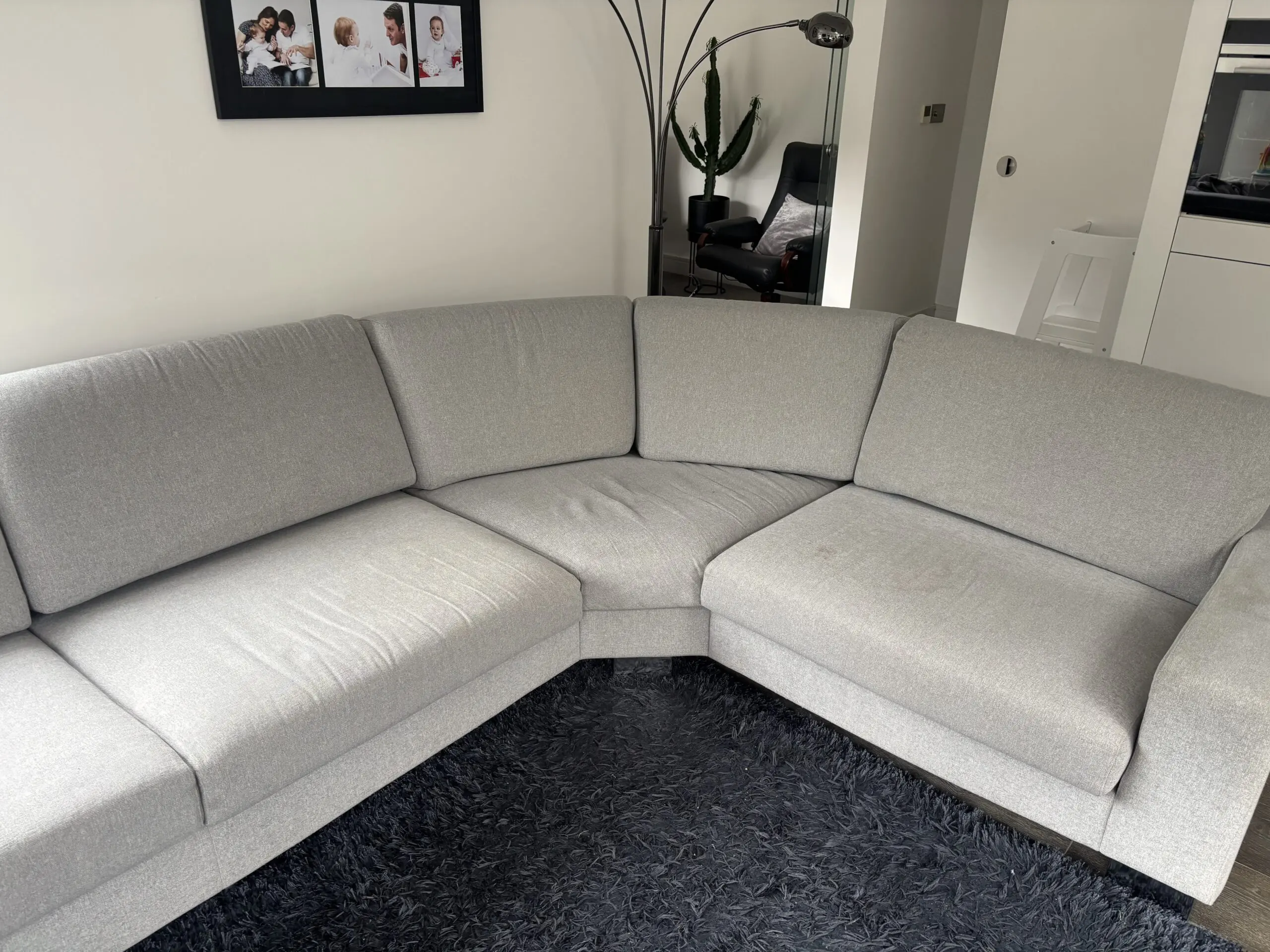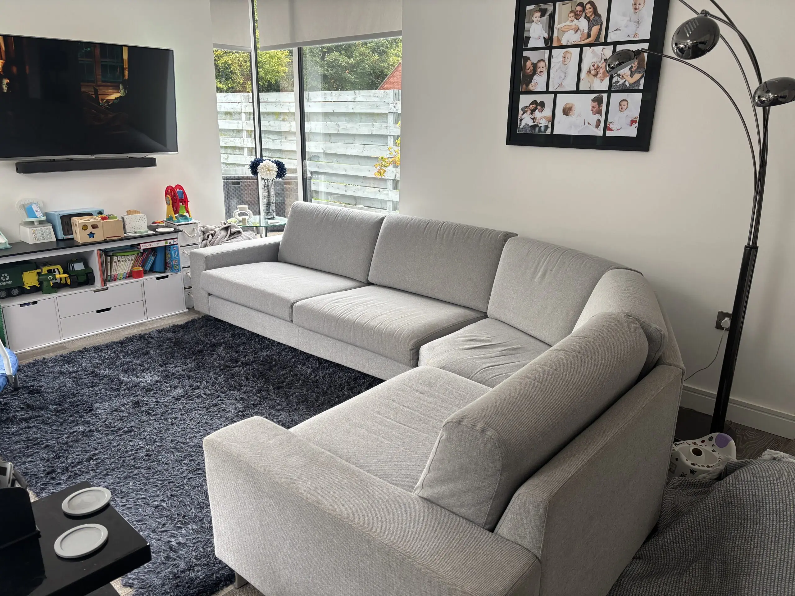 L shape bespoke made grey fabric sofa with hexagonal corner