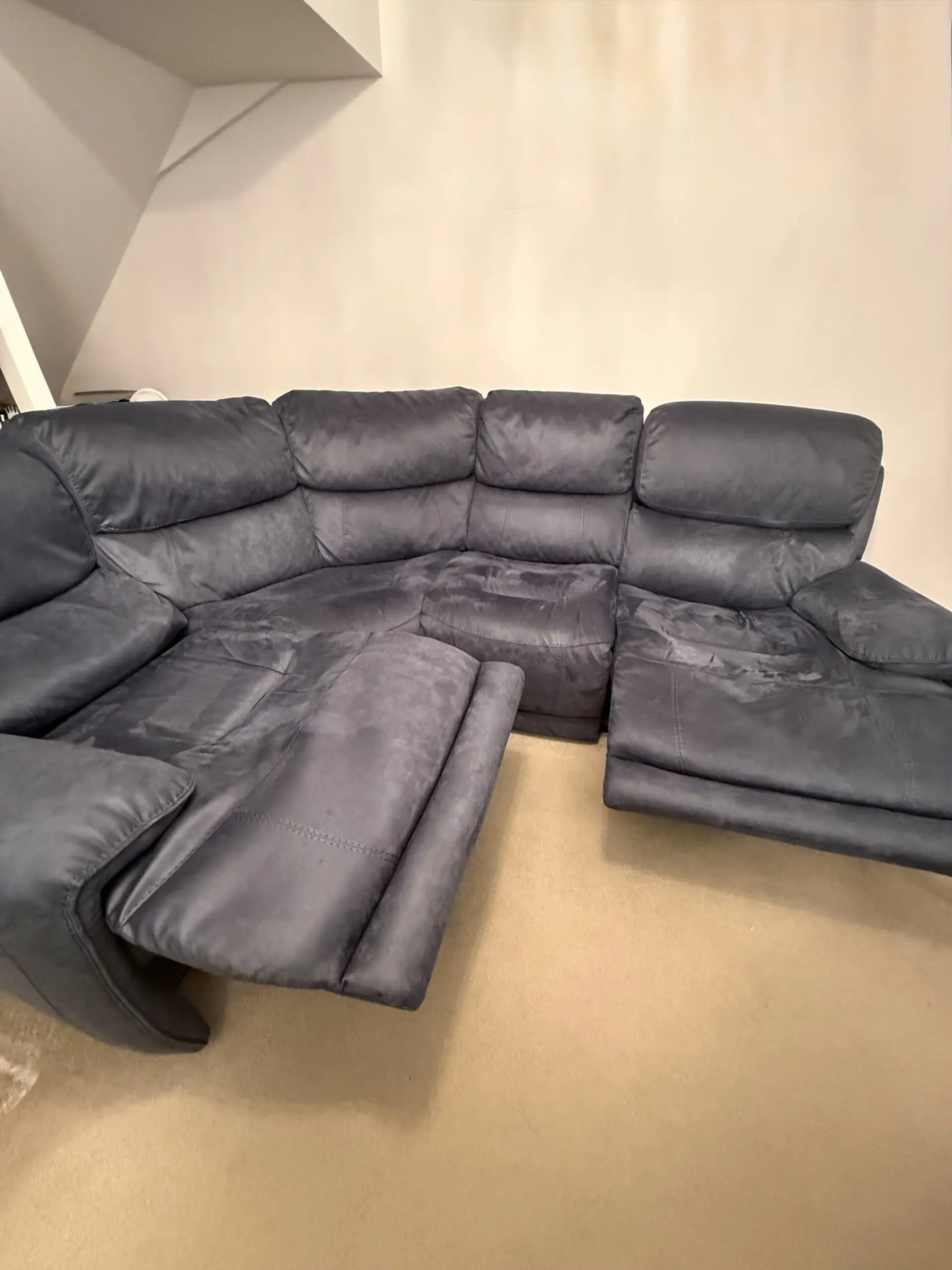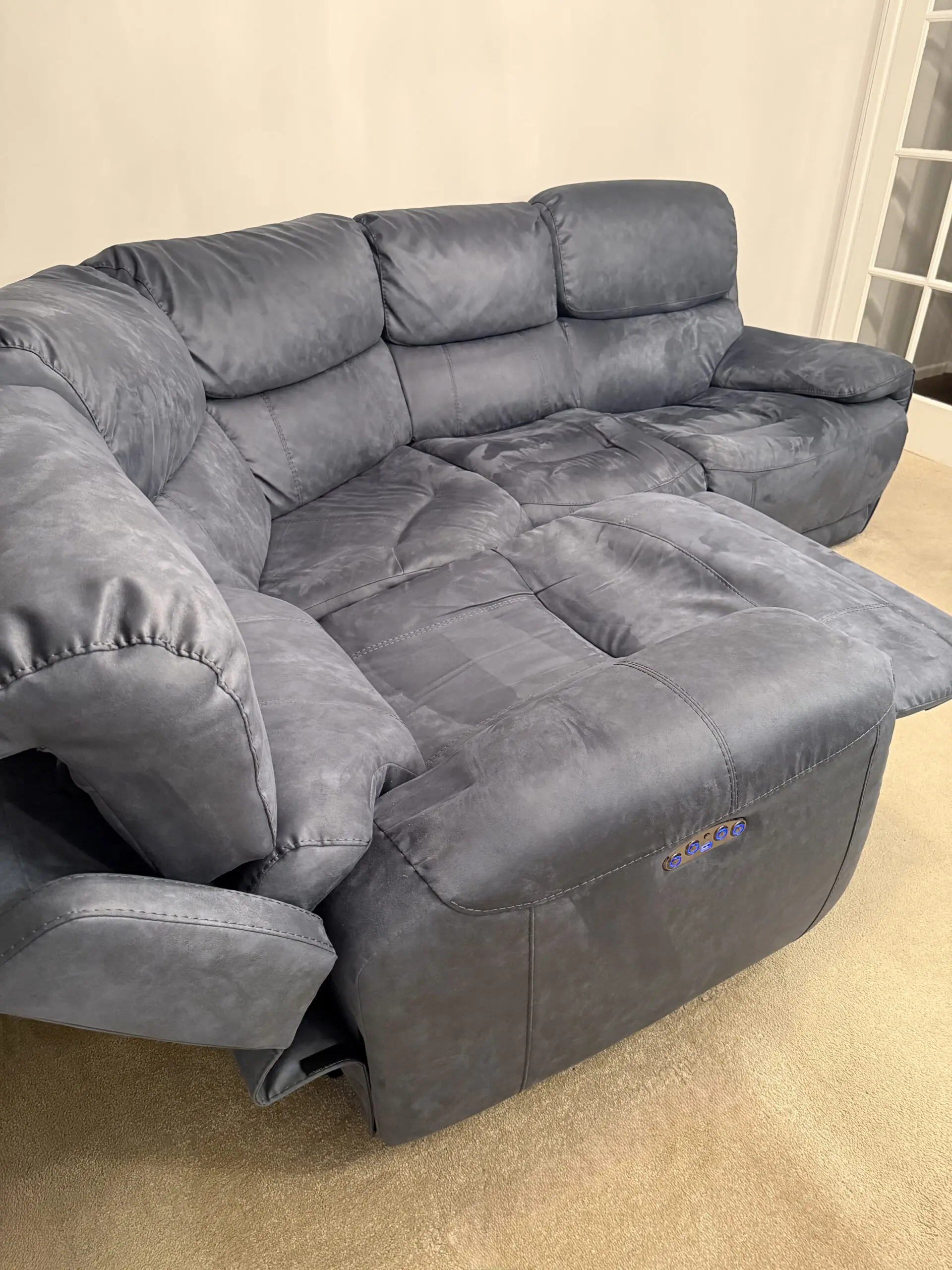 Deep blue modular corner sofa in like-new condition, from a smoke-free and pet-free home. Bought from Furniture Village just 18 months ago for £2,685.