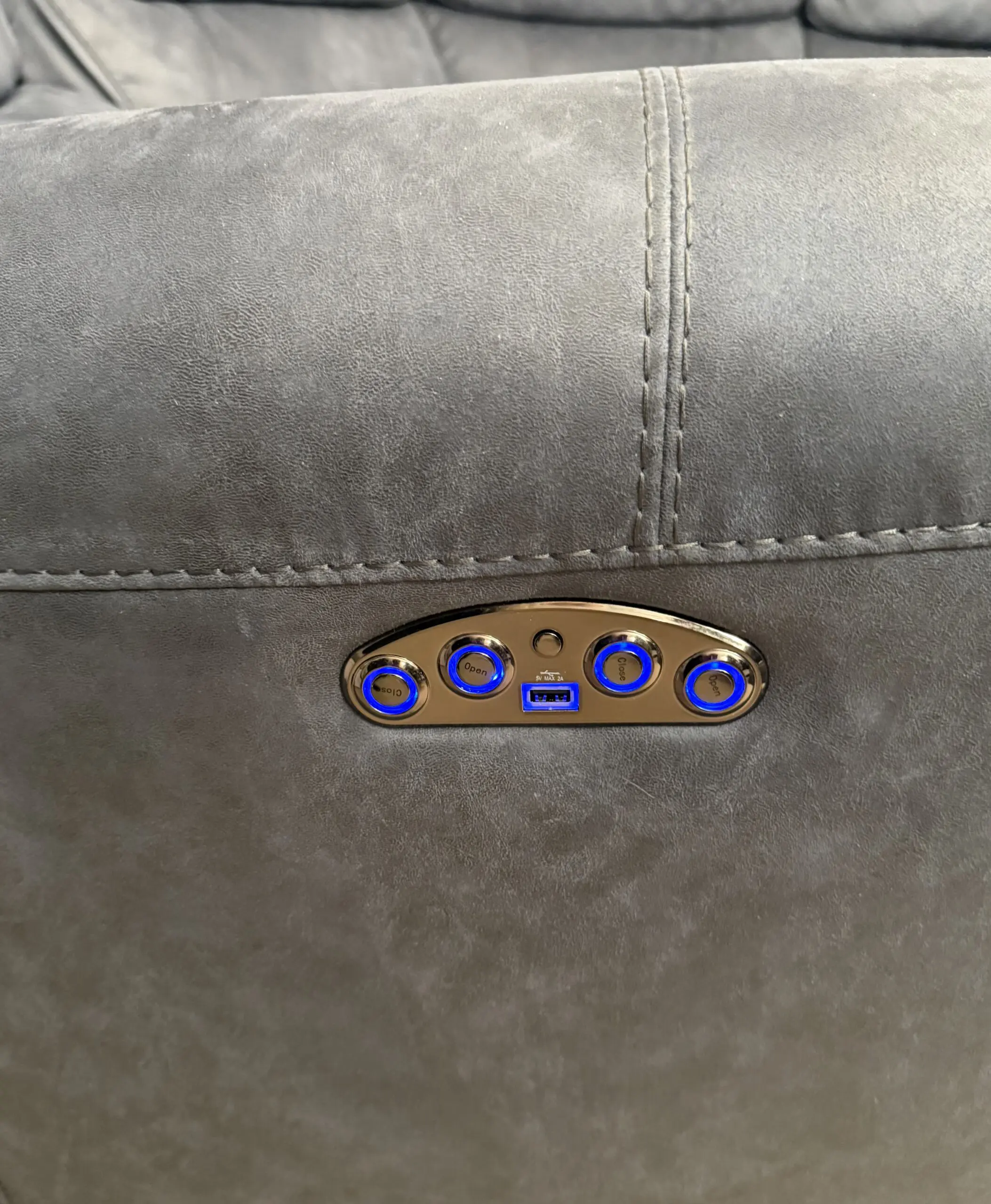 The two end seats have power recliners and power headrests (middle seats are fixed), operated by easy-to-use side controls. There are also built-in USB ports, perfect for charging phones or tablets.
