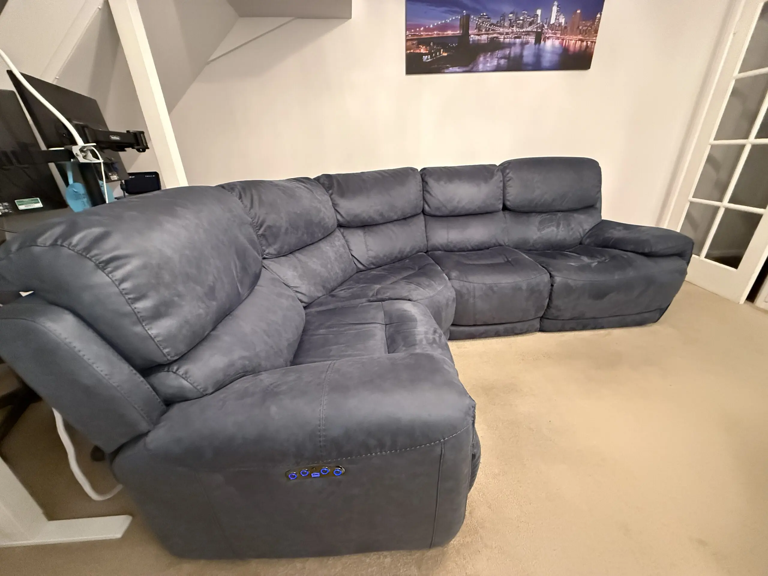 This is a 3-piece modular sofa, making it much easier to move and get through doorways. It’s very roomy and extremely comfortable, with deep seats and well-padded arms and headrests.