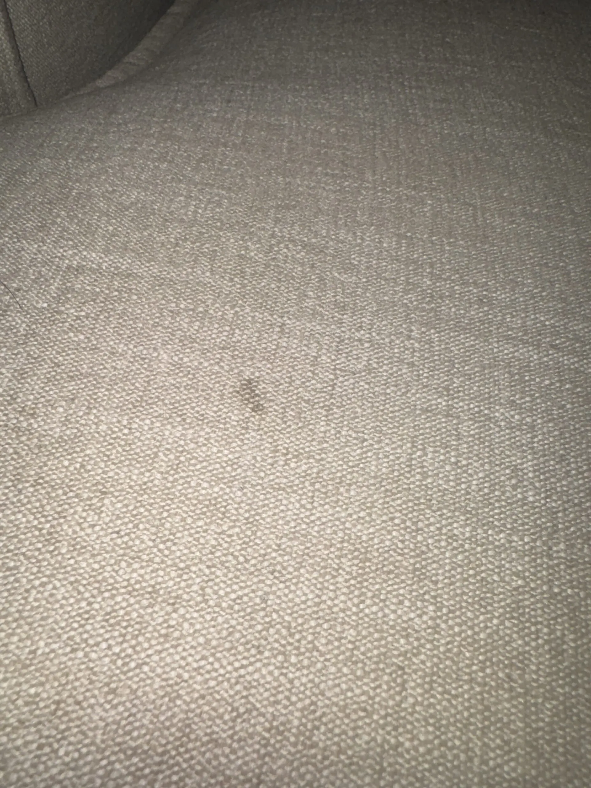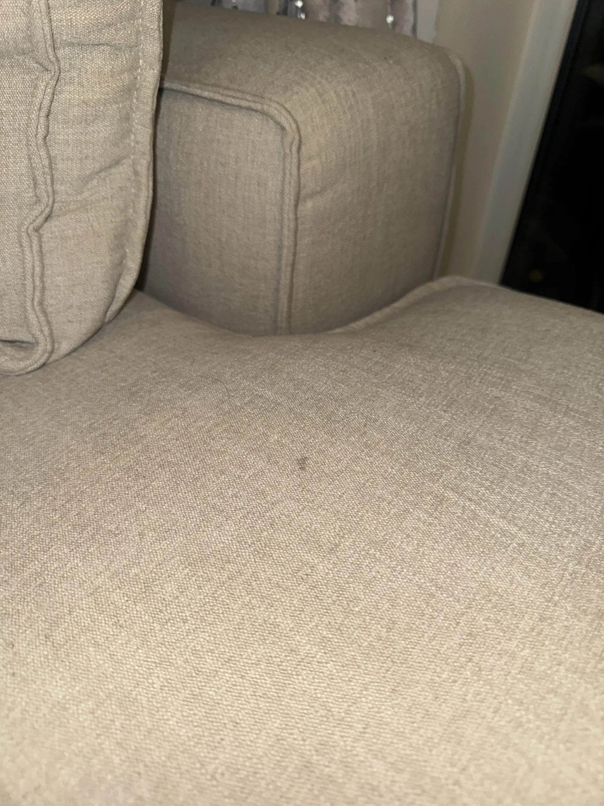 Comfortable foam interior spacious chaise sofa in a beautiful beige shade. Right-hand facing design. Lightly used, one small stain rest of sofa good condition