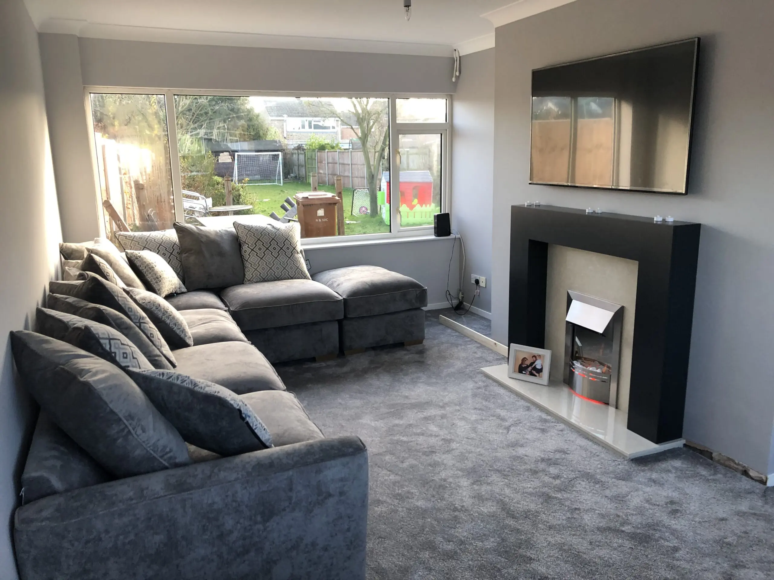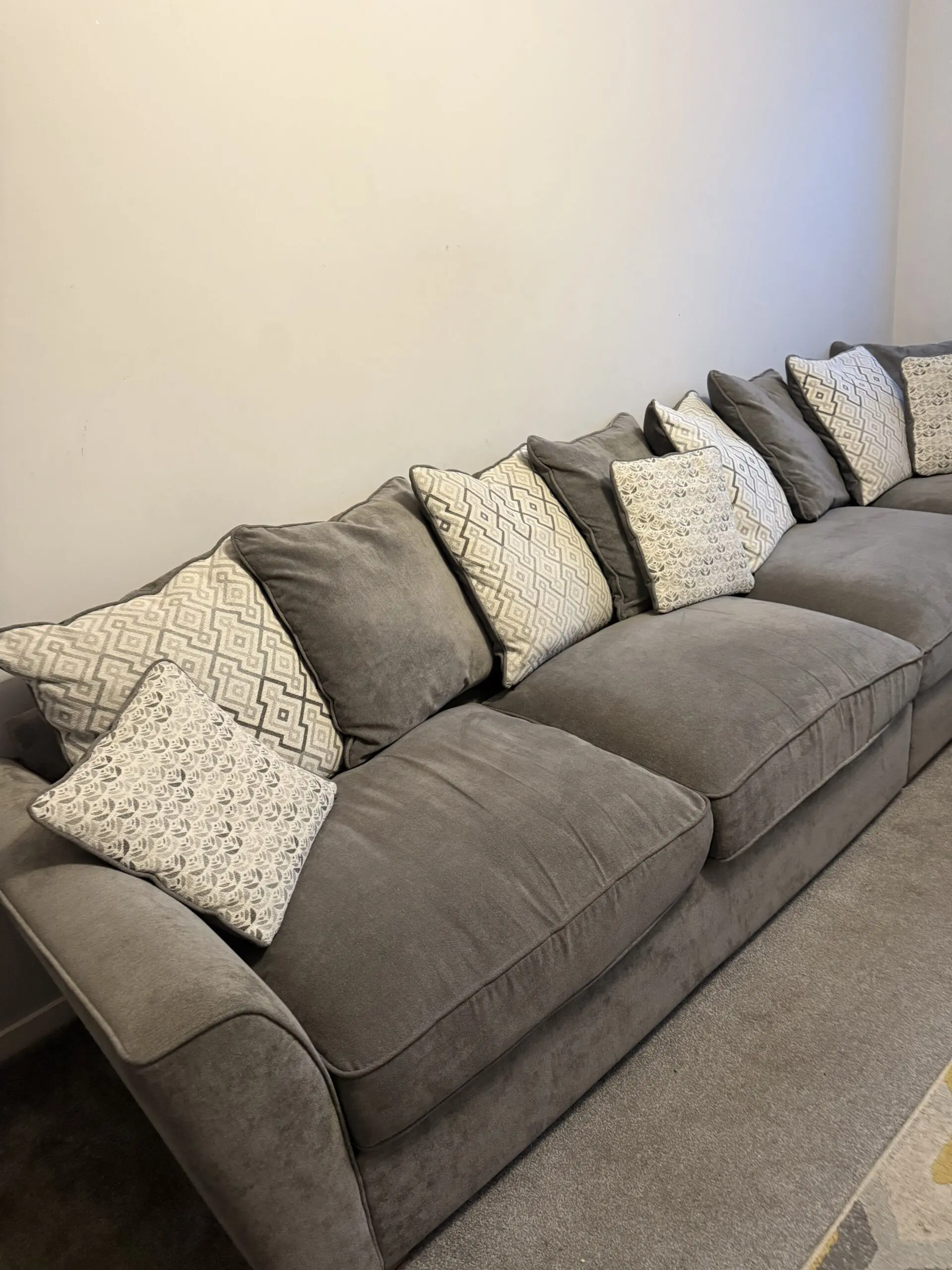 Beautiful and comfortable Pillow Back Corner Chaise Sofa in charcoal grey, complete with matching footstool and snuggle chair. Originally local furniture store however is still seen online (Buoyant Fantasia range) – known for its high quality, deep cushions, and cosy pillow back design.