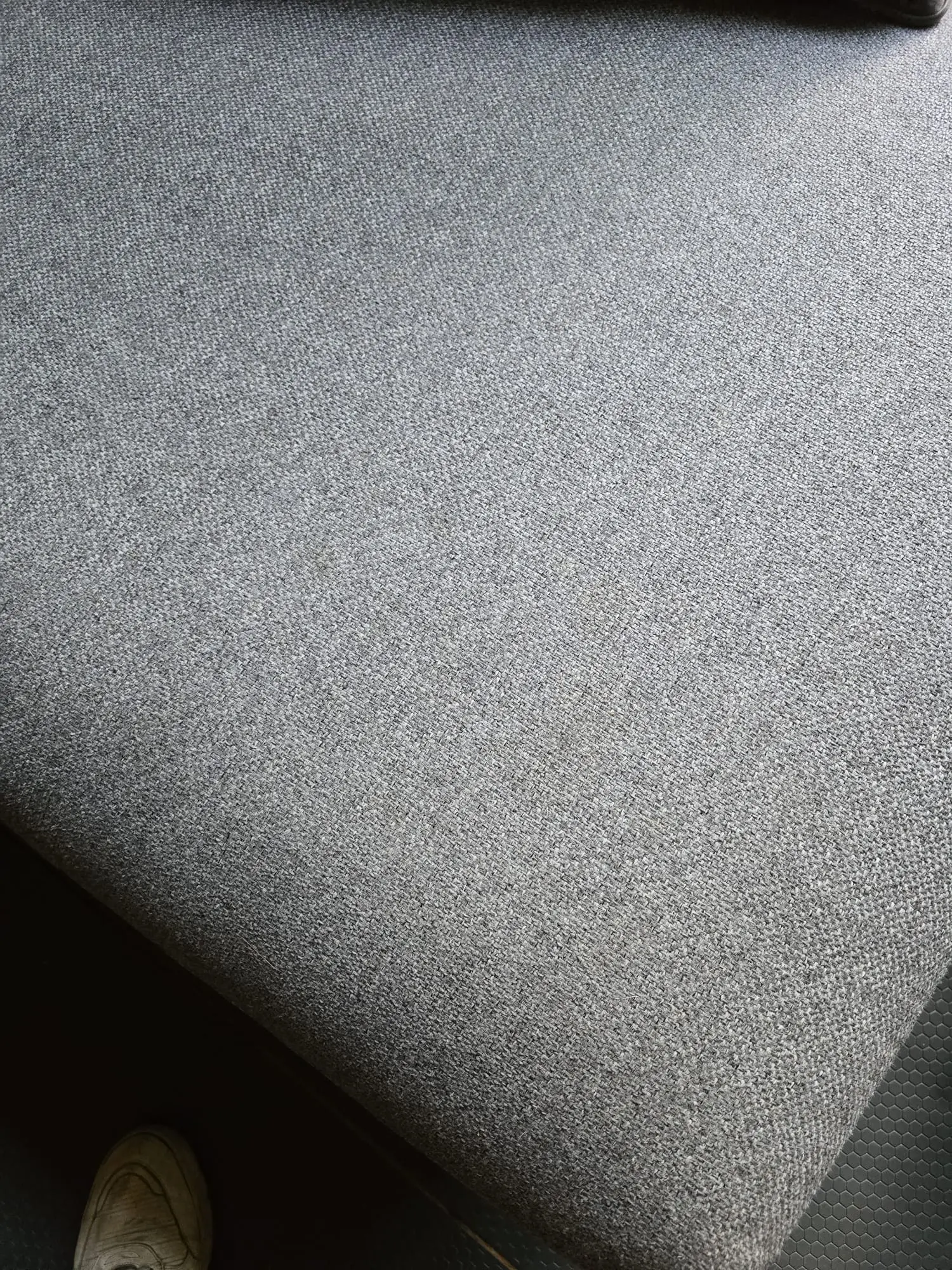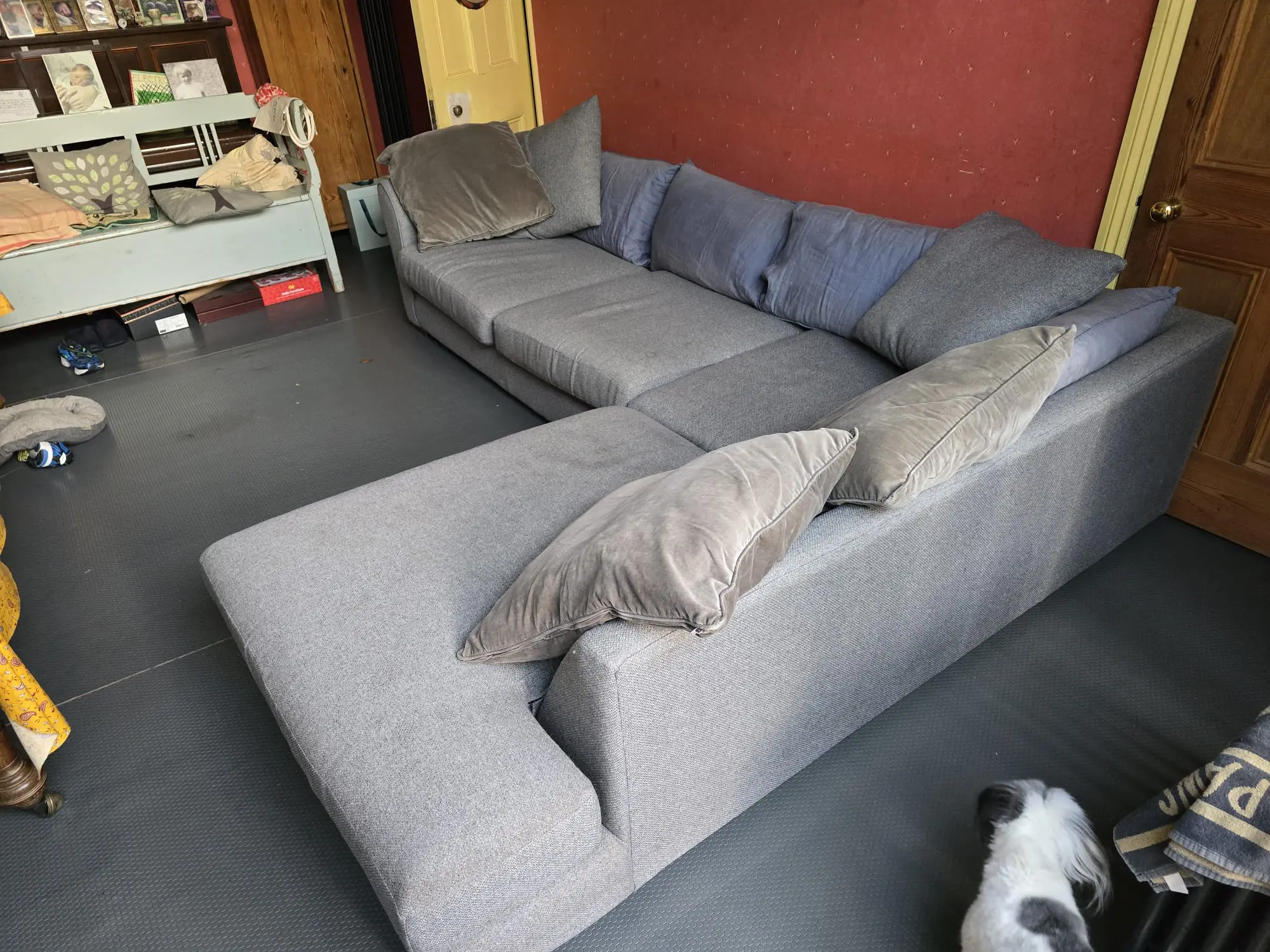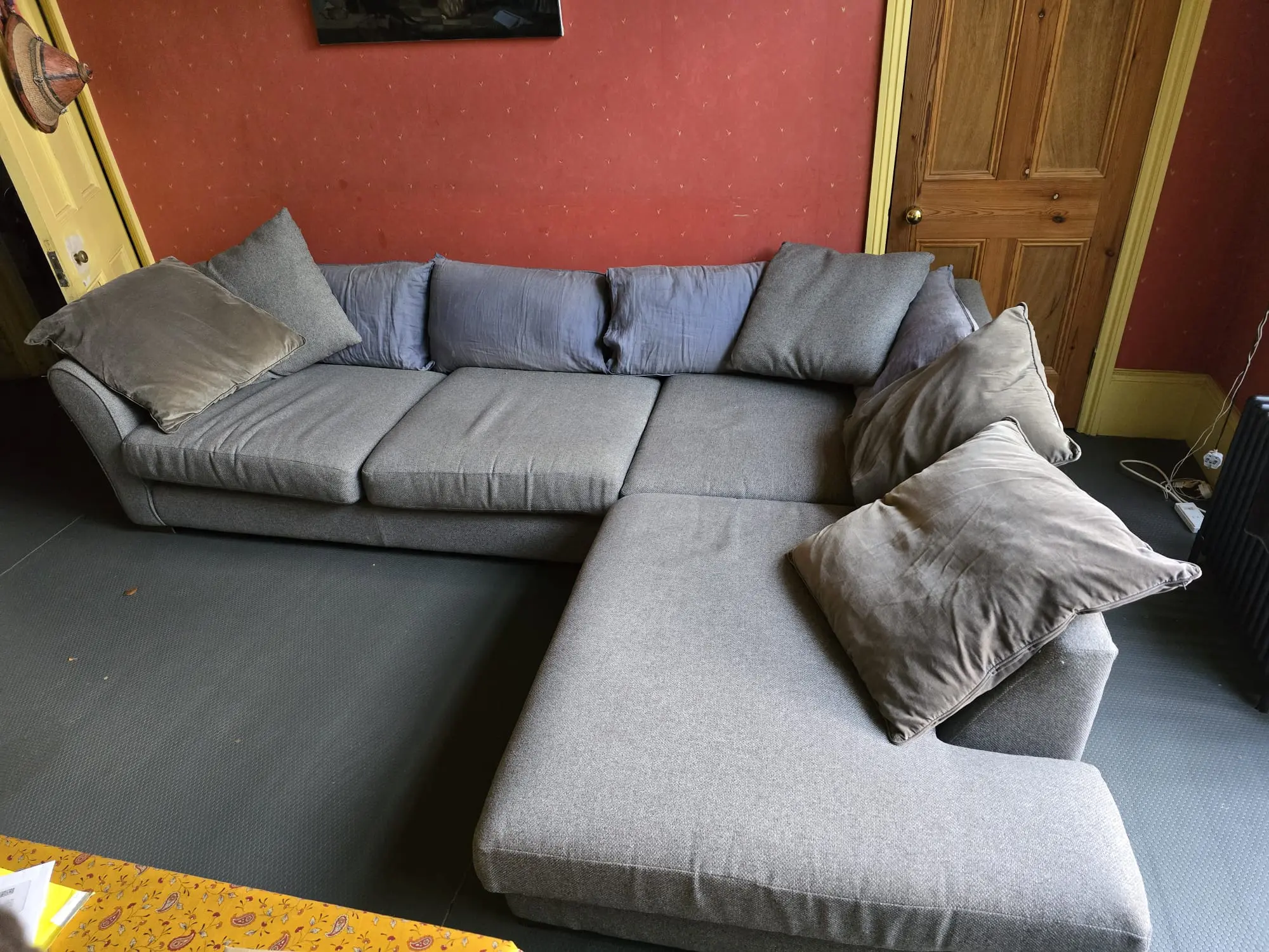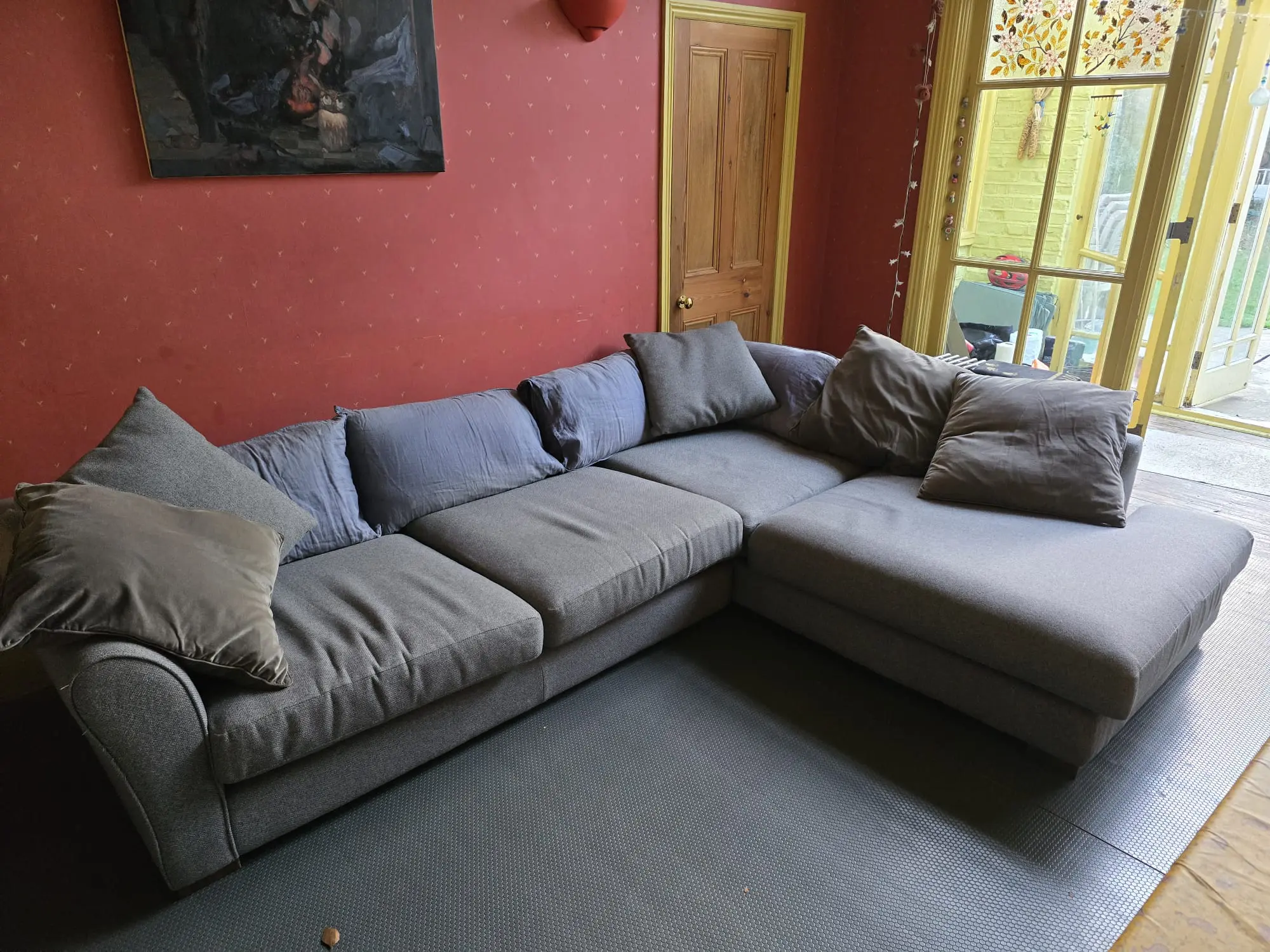 This is a large comfortable family sofa in good condition. Strong fabric on the base and foam cushions. Some fading to pillow cushion covers. Minor cat scratching to one corner at the back.