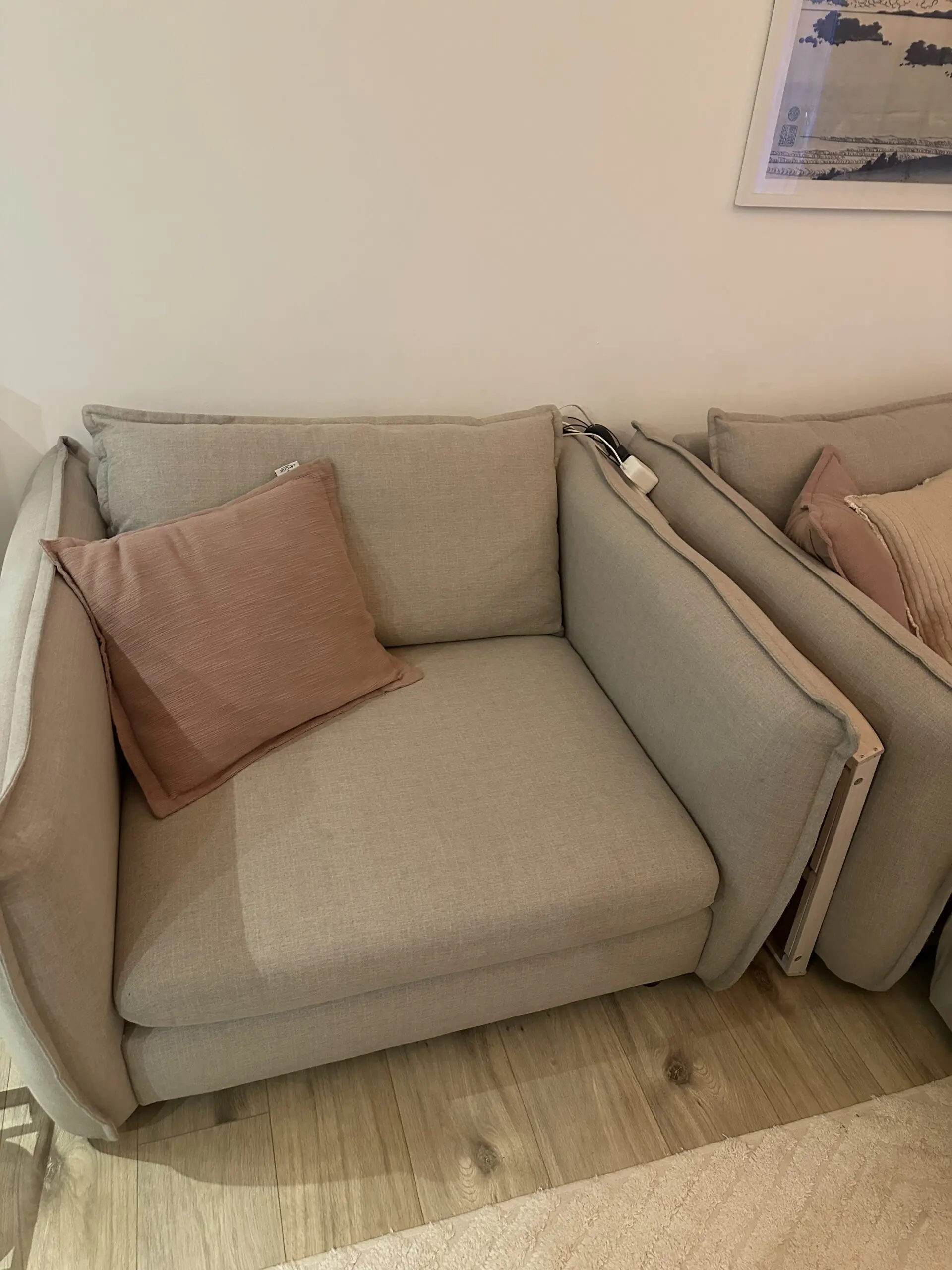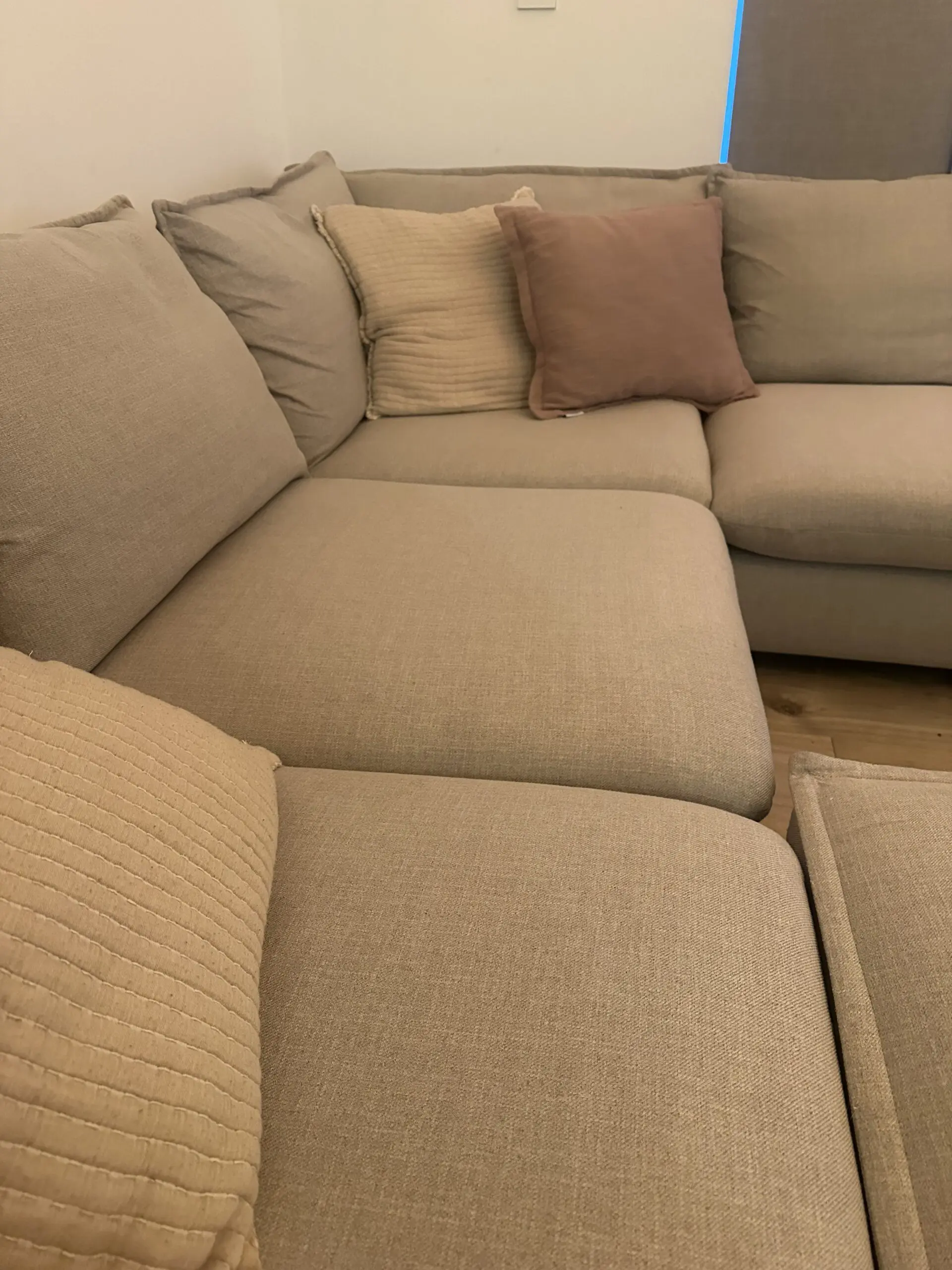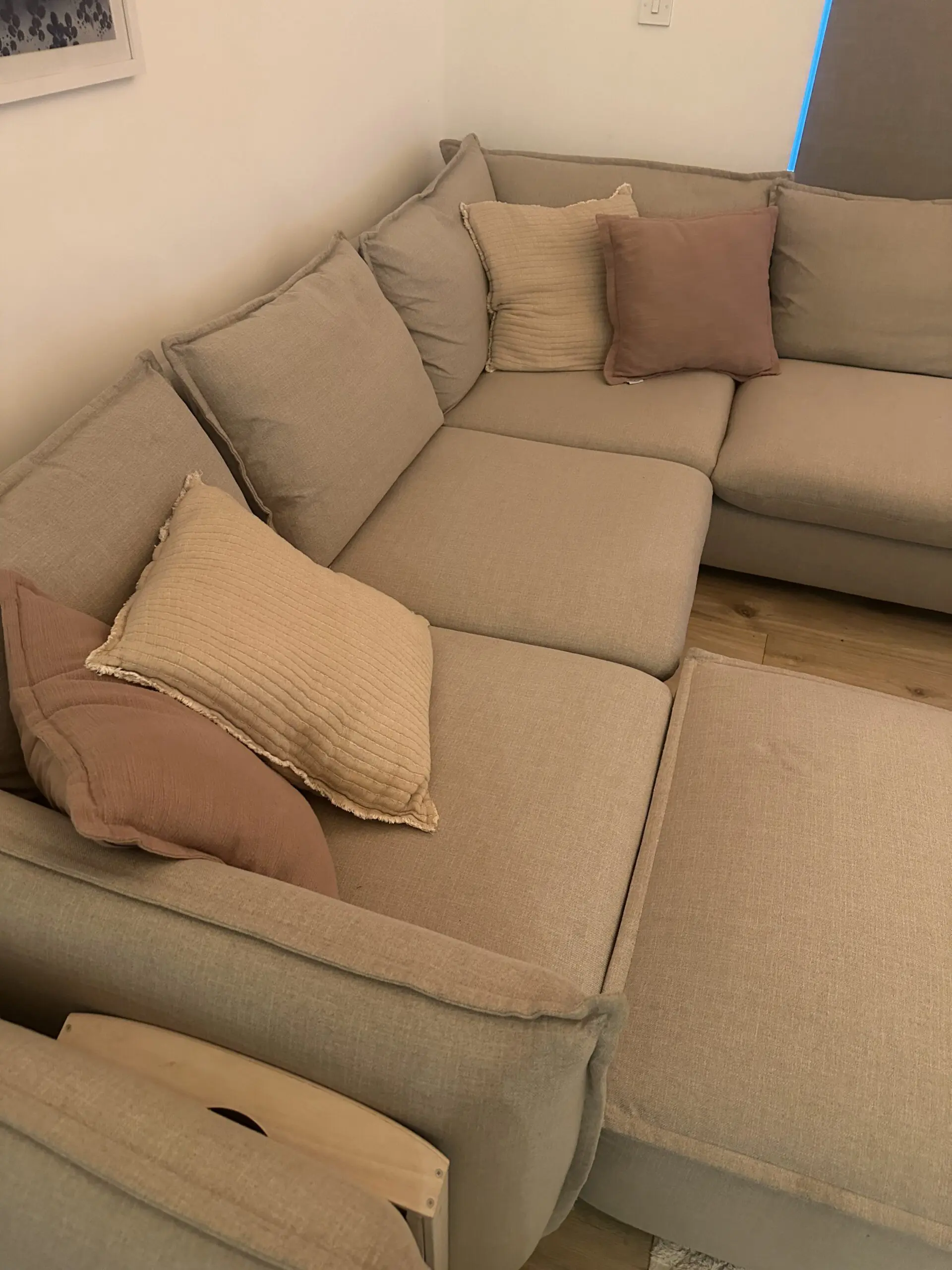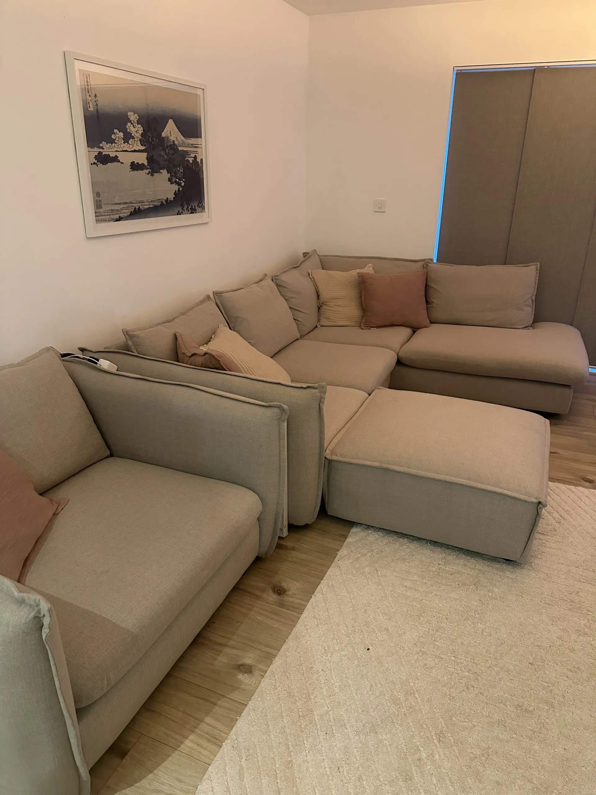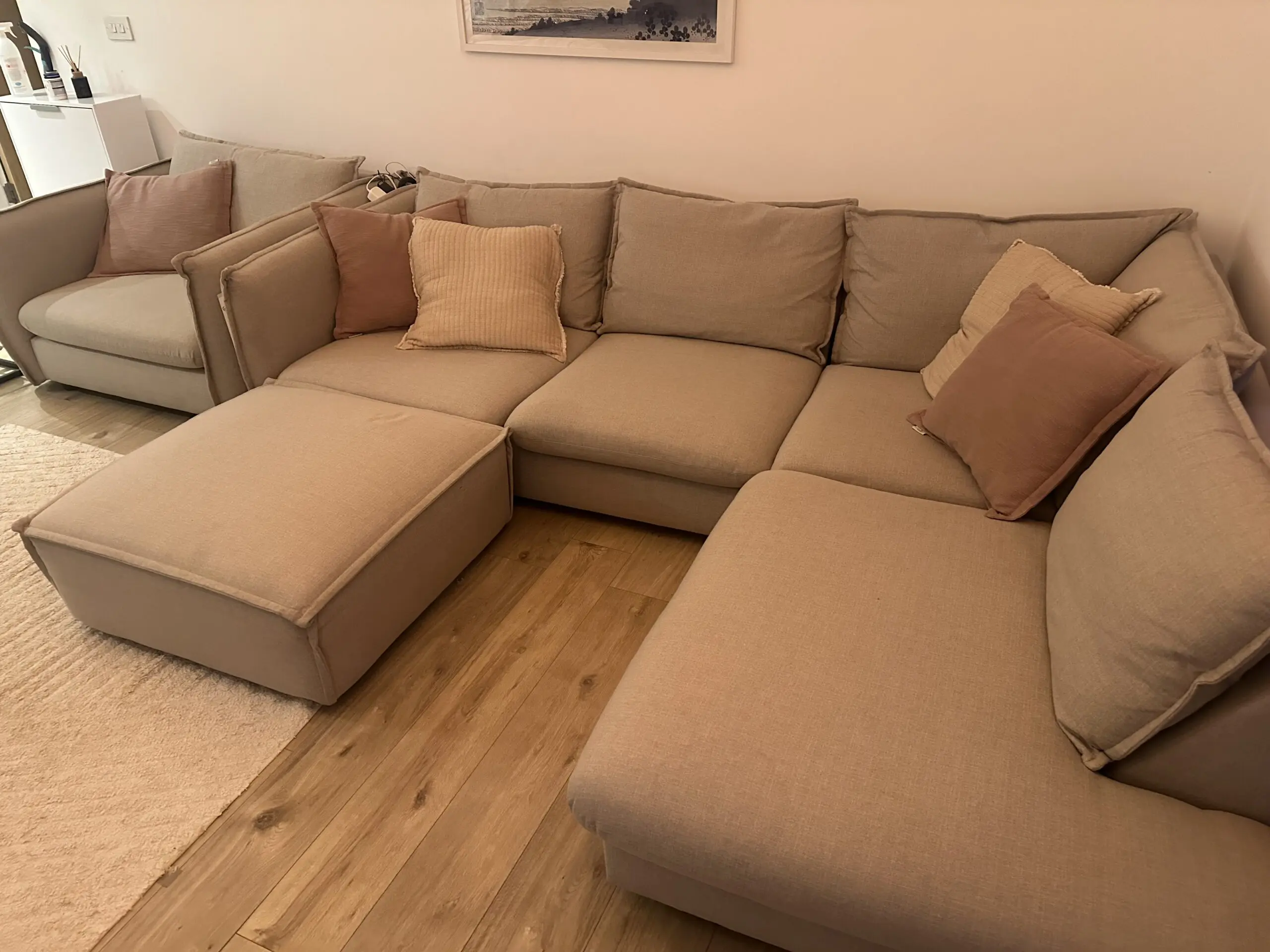 This is a large (Left side) corner sofa with a lot of space and depth, the only parts that can be detached is the cuddler sofa and the footstall, the corner cant be changed and is the same way as on the photo. It also has a large cuddler sofa, great for gatherings or just lounging watching TV, unfortunately I have to sell due to moving and the living room being to small to fit it in. Its only 4 years old and has always had throws on it so very clean also.
