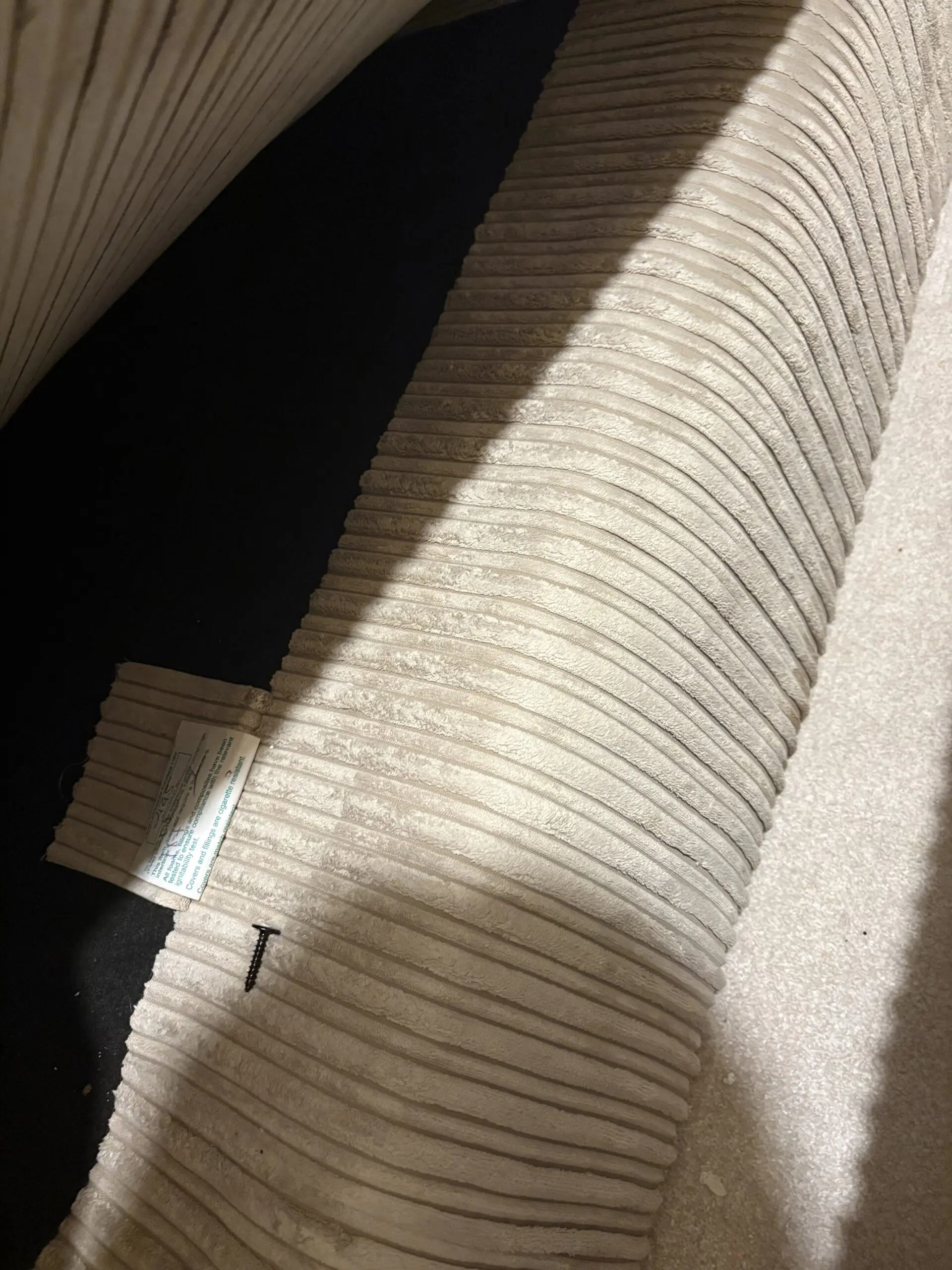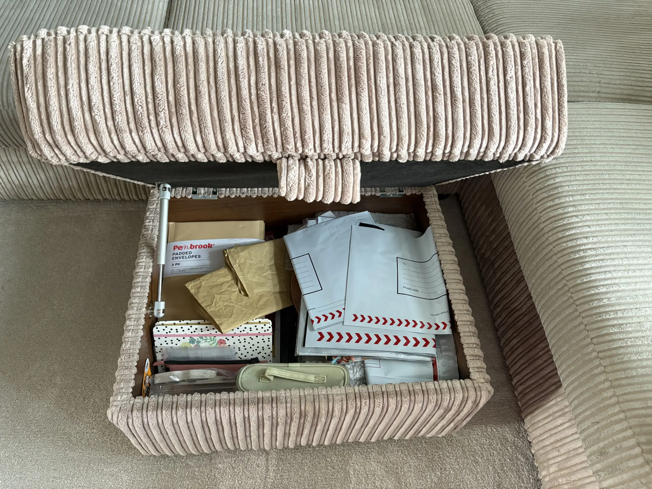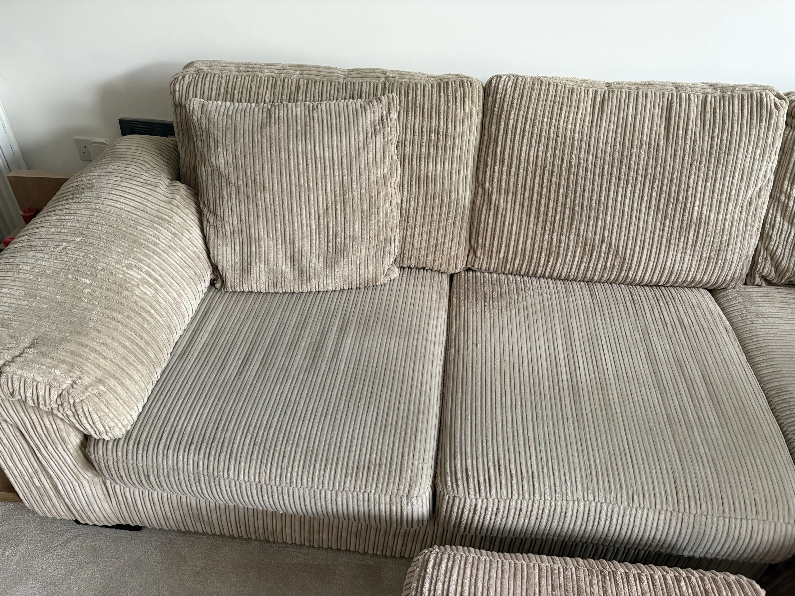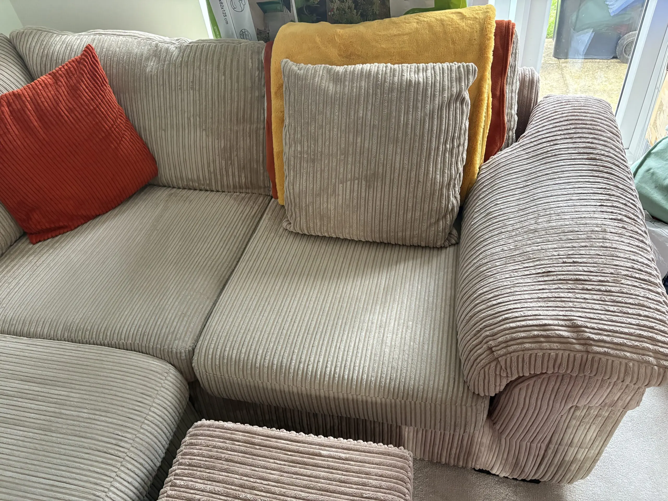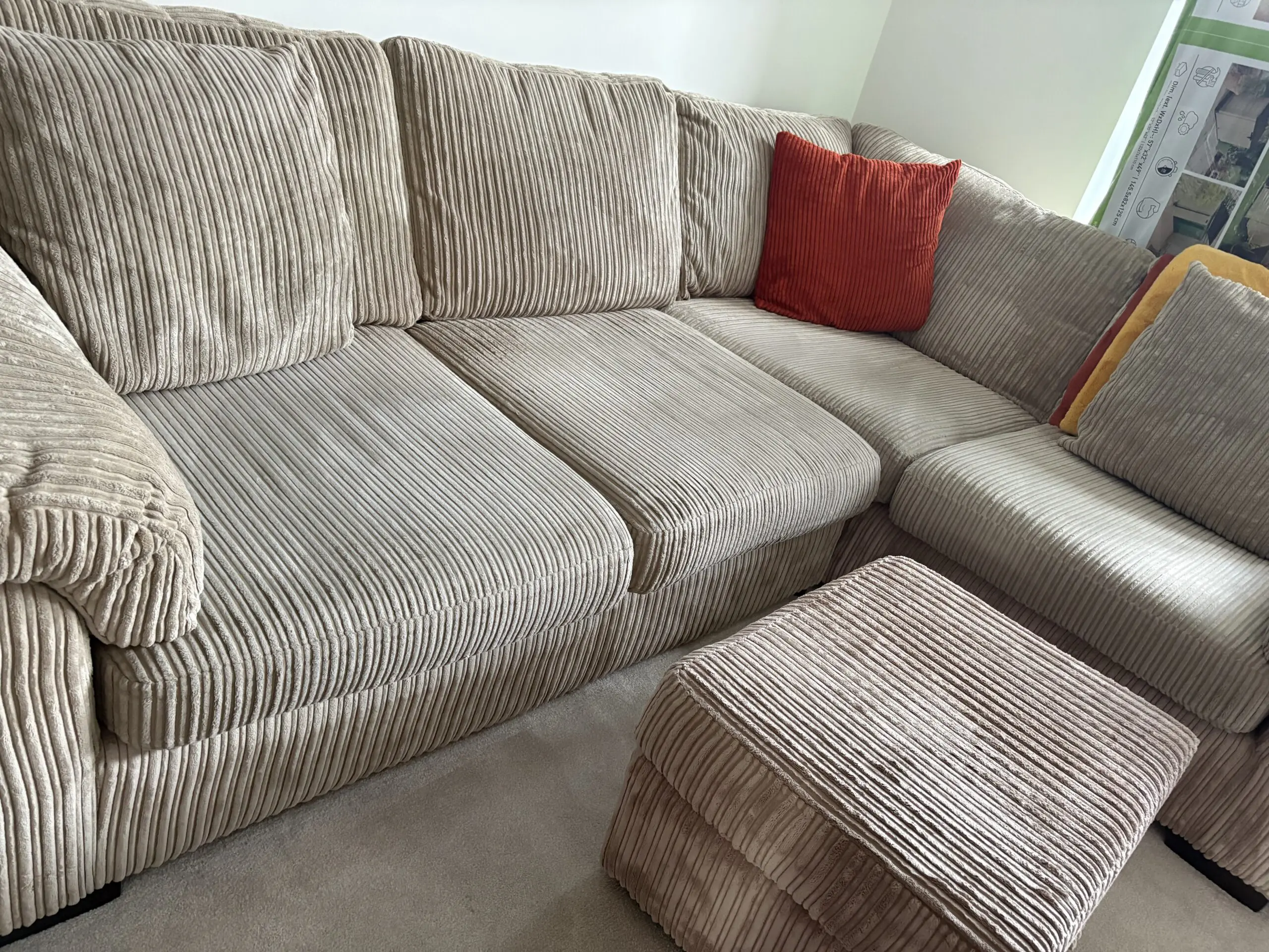 Large beige cord corner sofa, comes in 2 parts and a storage footstool, also 2 cushions included