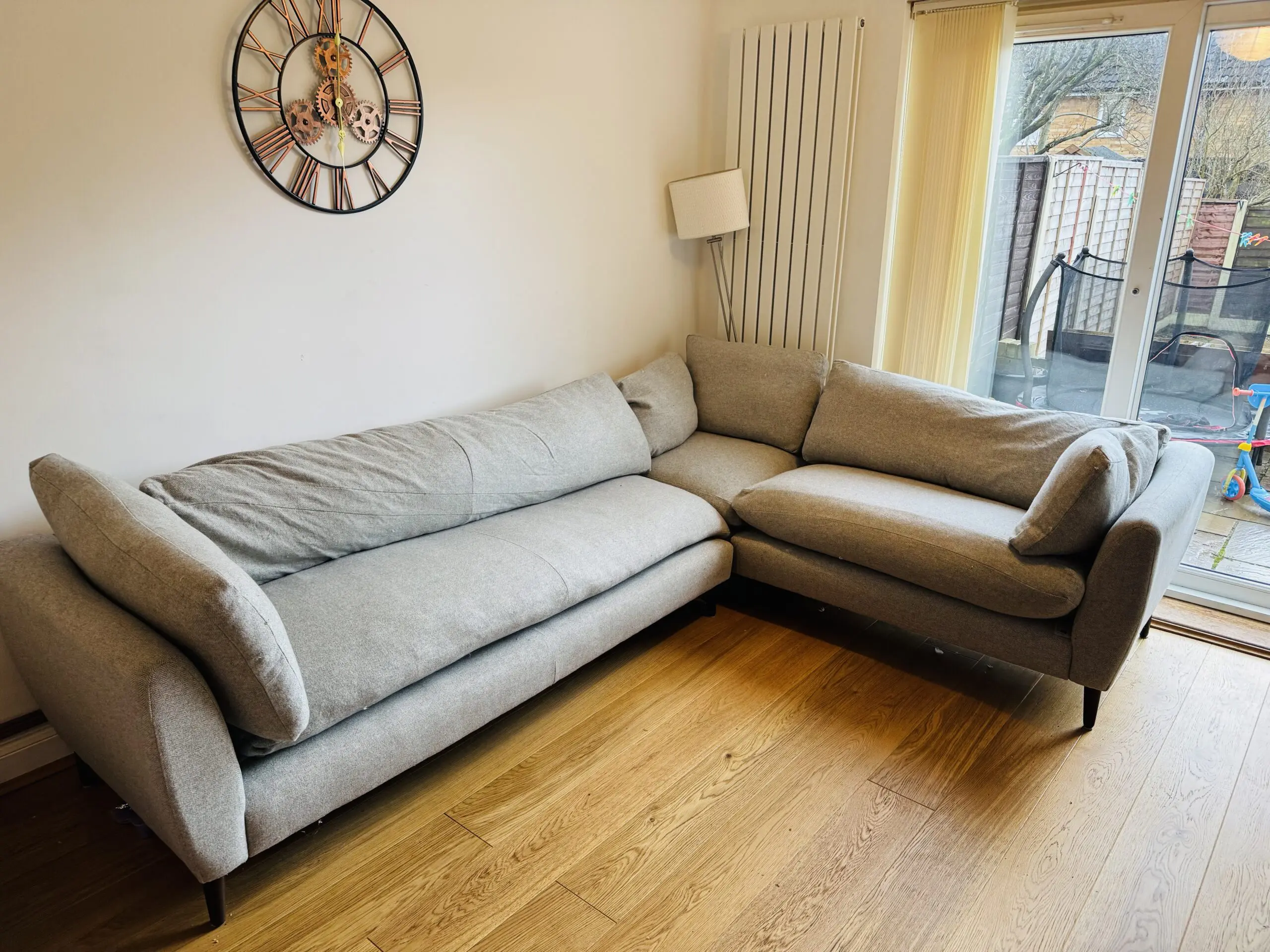 Large grey L shaped sofa, smoke and animal free household. In good shape but a little wear and tear.