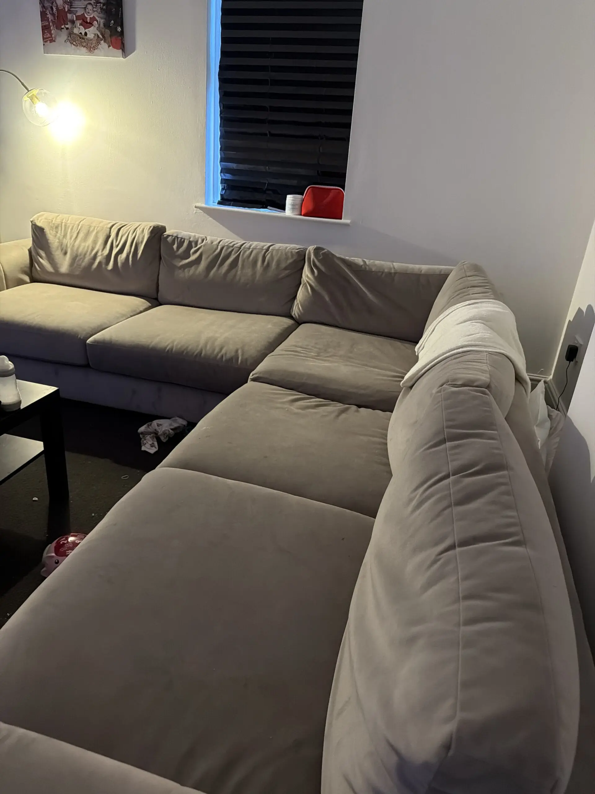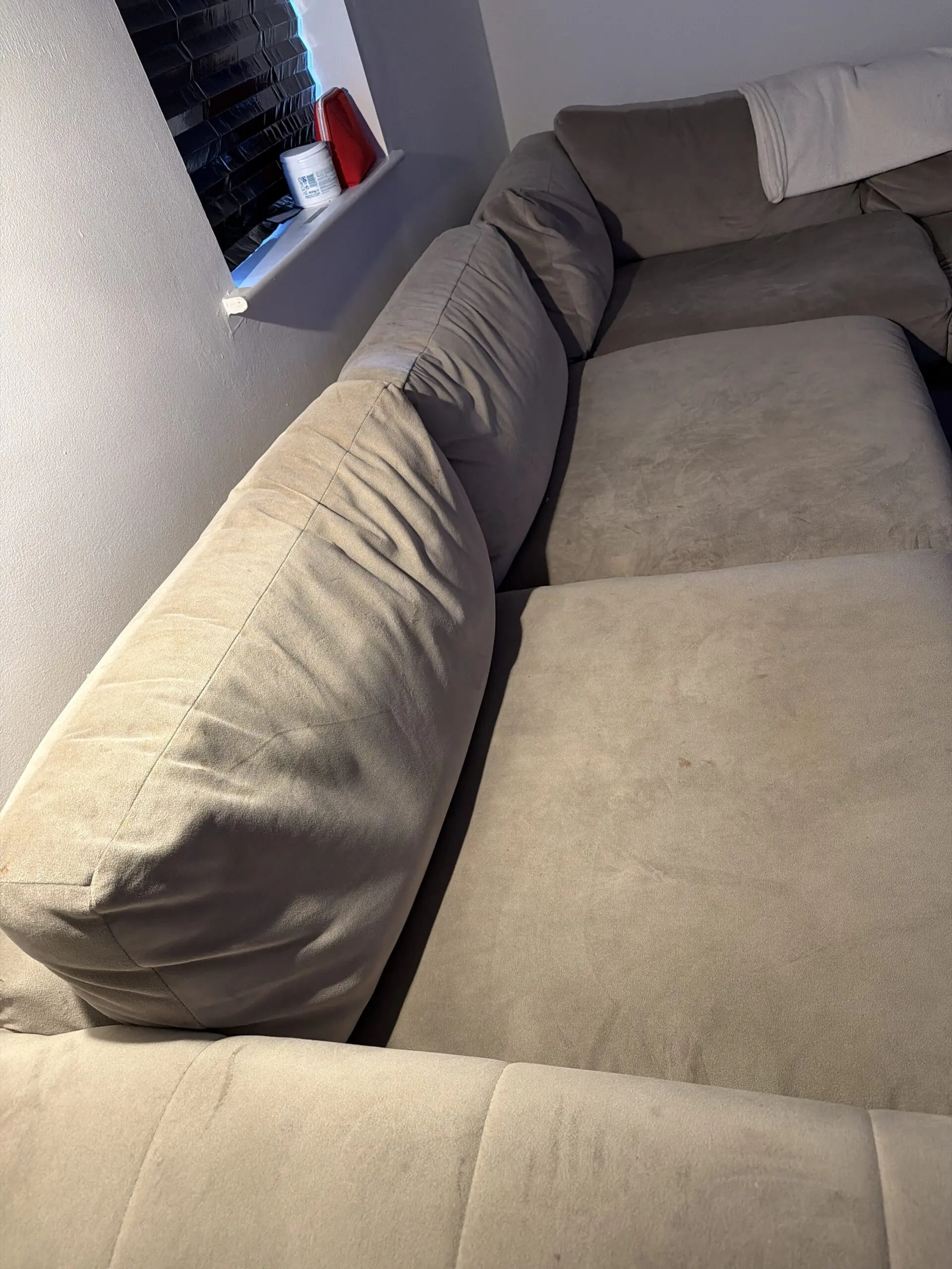 Nothing wrong with sofa. Only getting rid of due to it won’t fit in new house. easy to clean and maintain.Will do a steam clean before going with new owner.seperates into 3 sections.