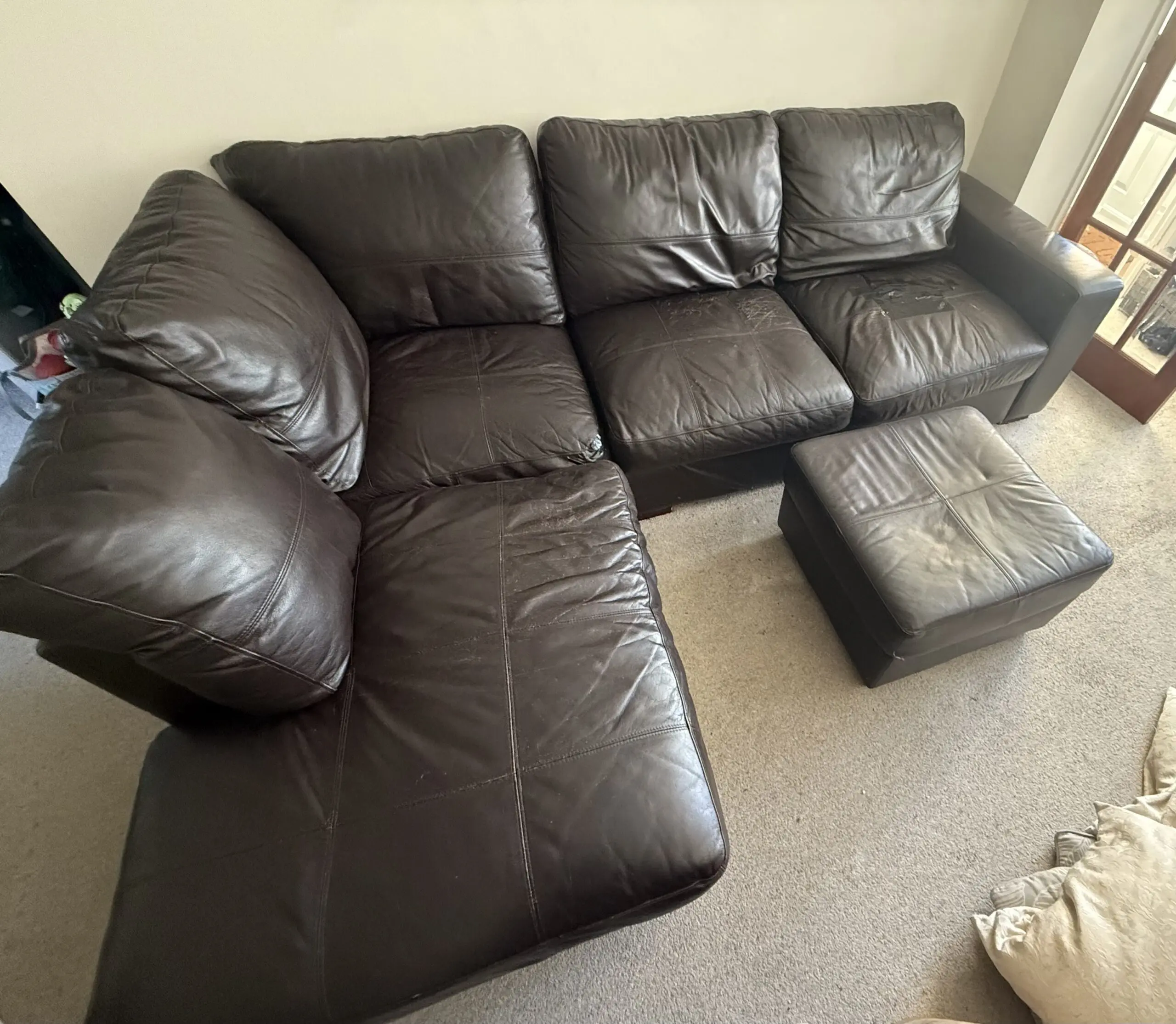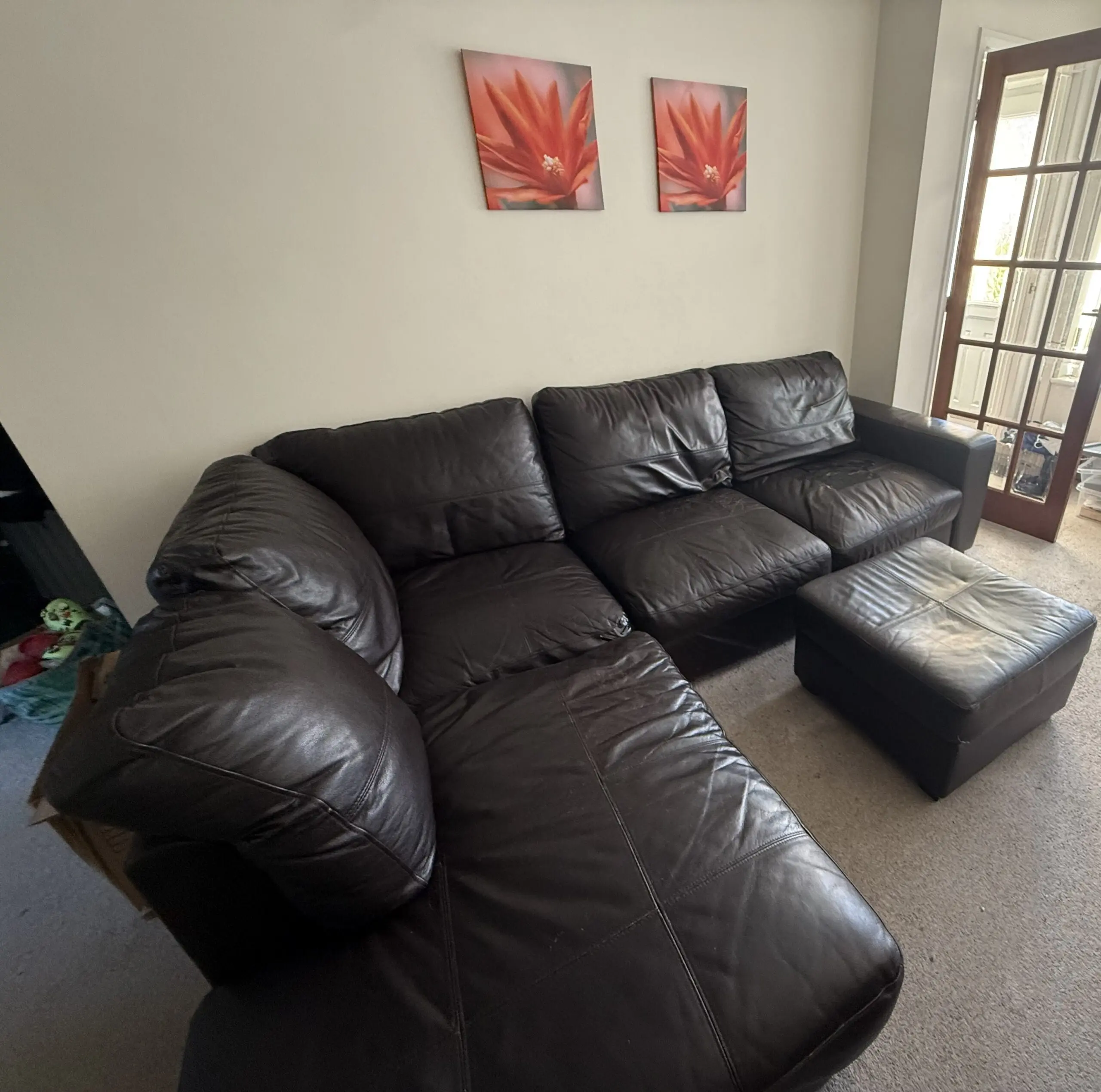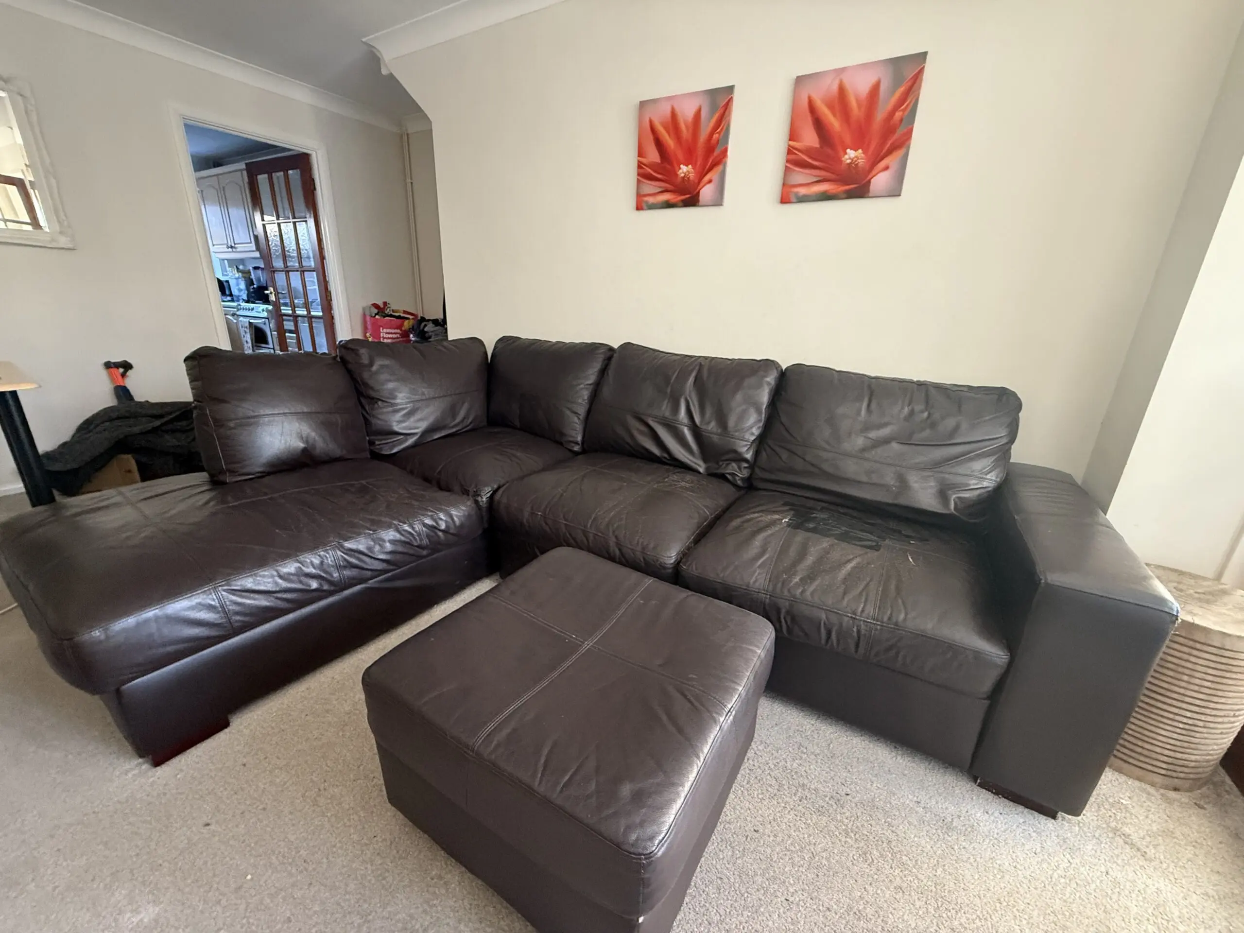 Leather 2 piece corner sofa with footstool. Moving house, for collection in Epsom KT17.
