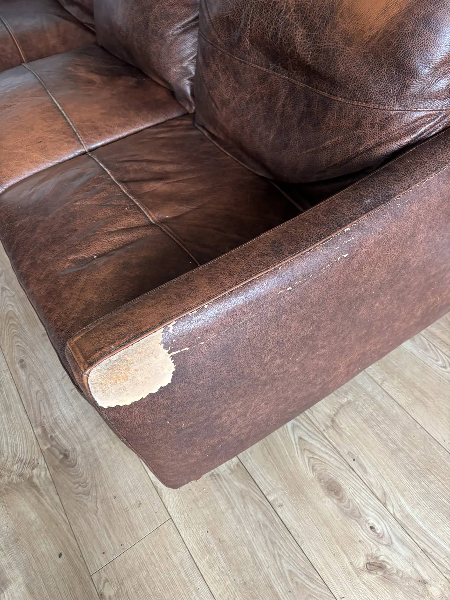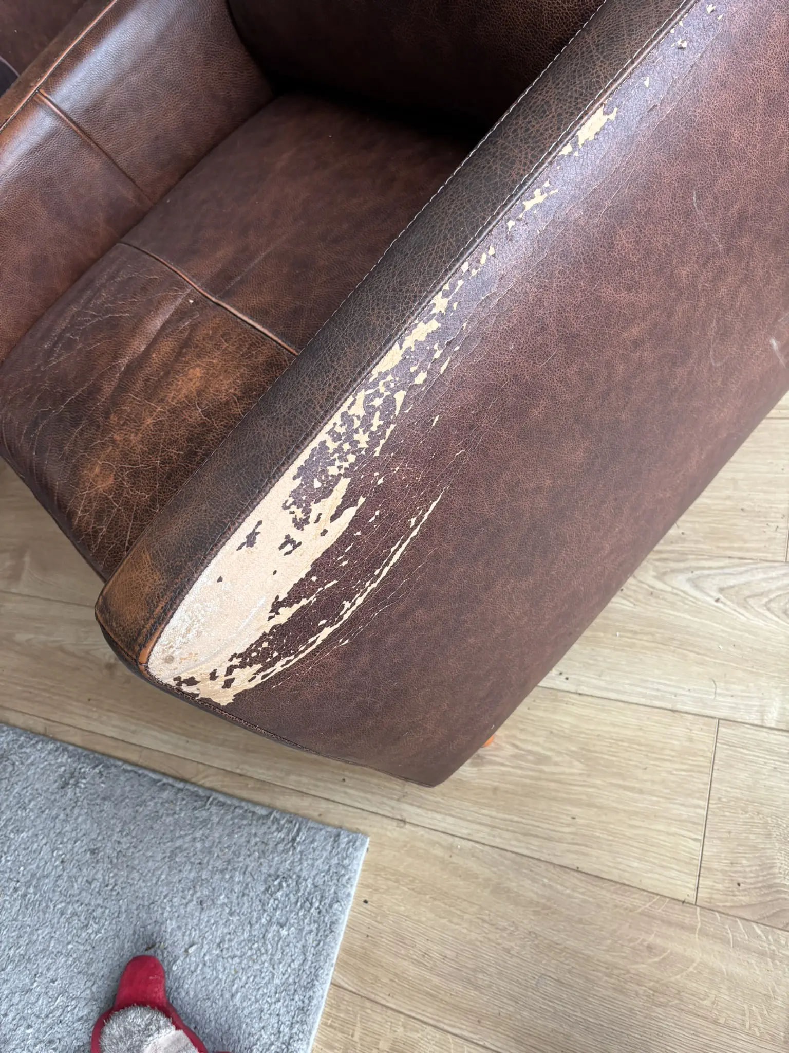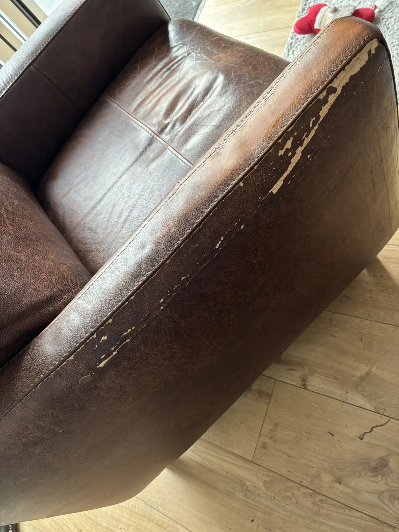 Sun damage to side of arms has led to flaking of fabric.