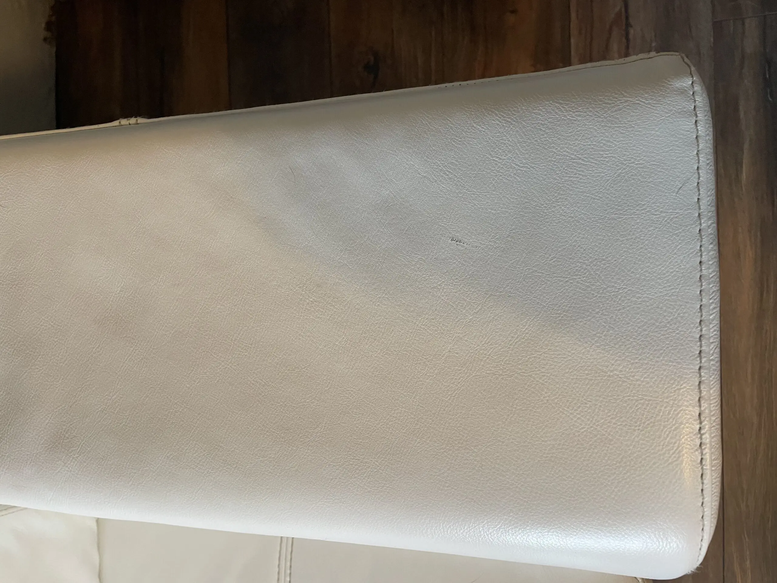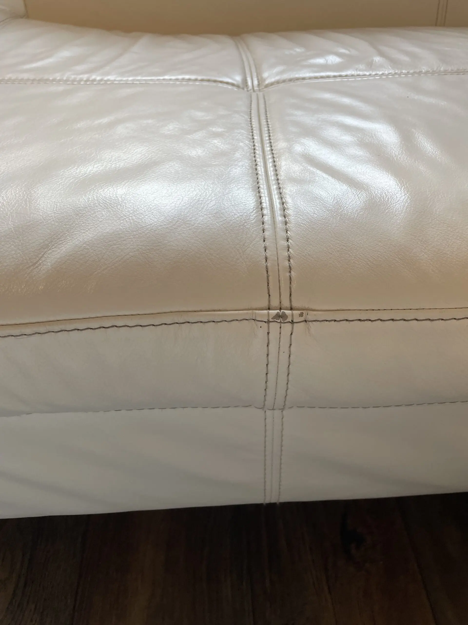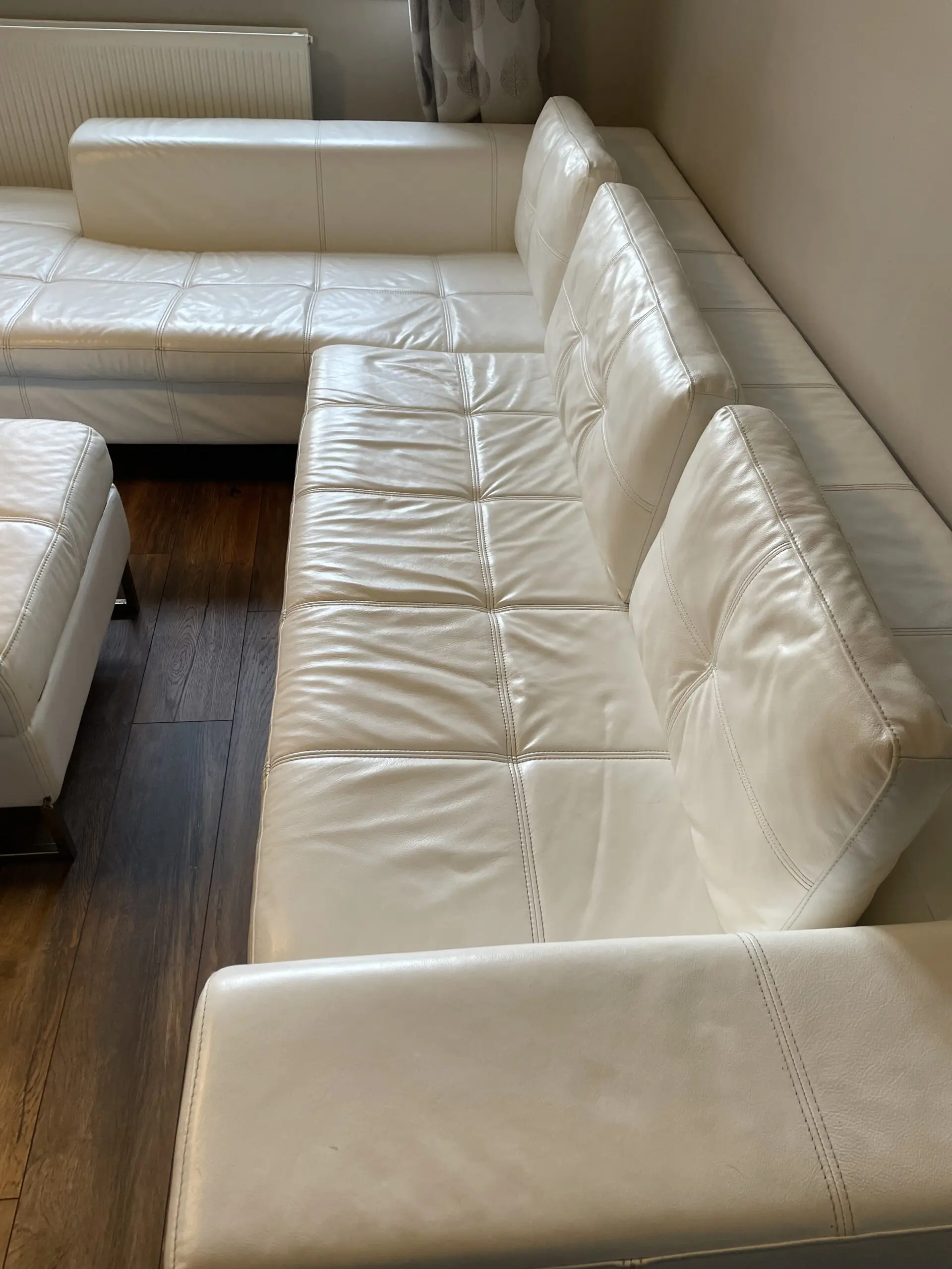 White leather corner sofa and footstool. Great condition cost over £3000 18 months ago. Couple of very small scuffs as shown in photos. Soft leather. Splits into 2 parts for easier handling. Chrome feet. Smoke and pet free home.