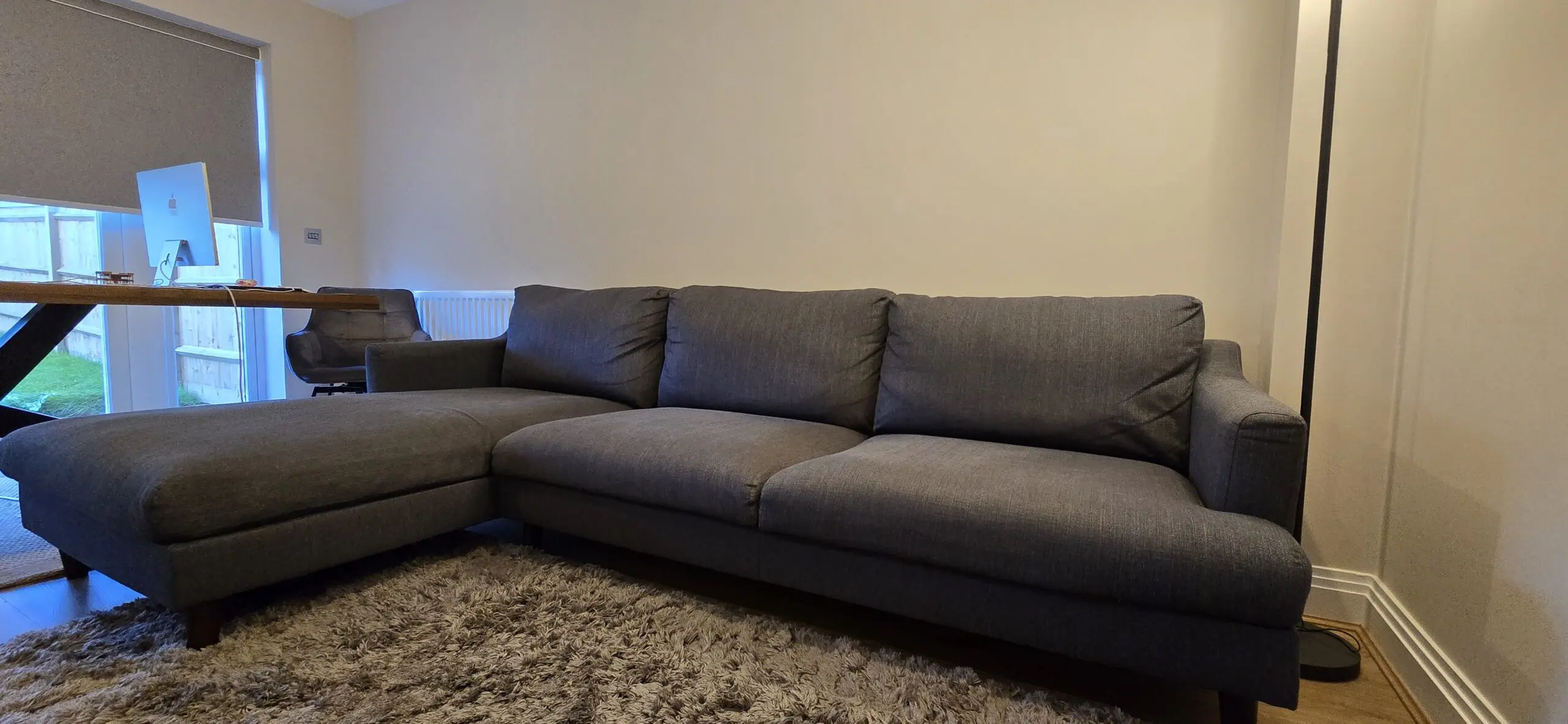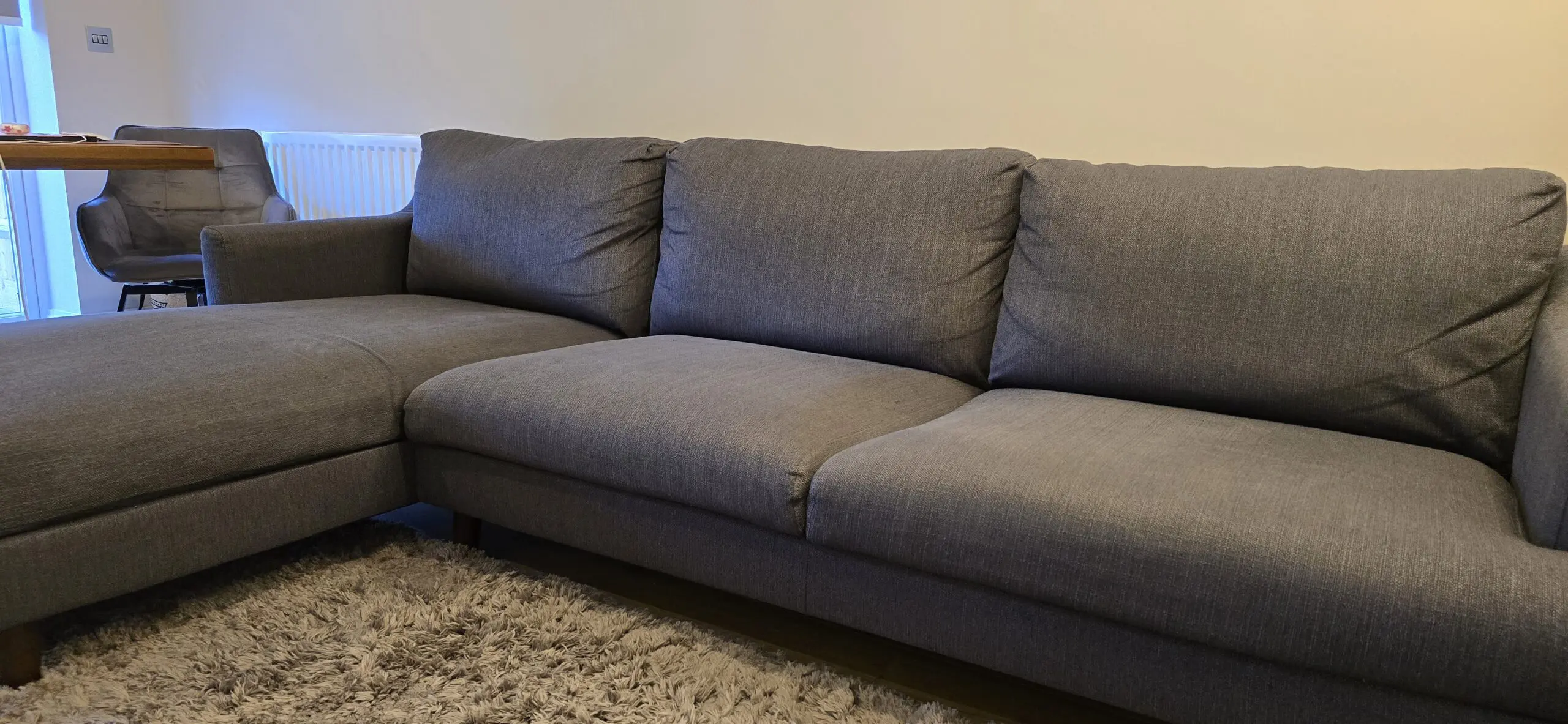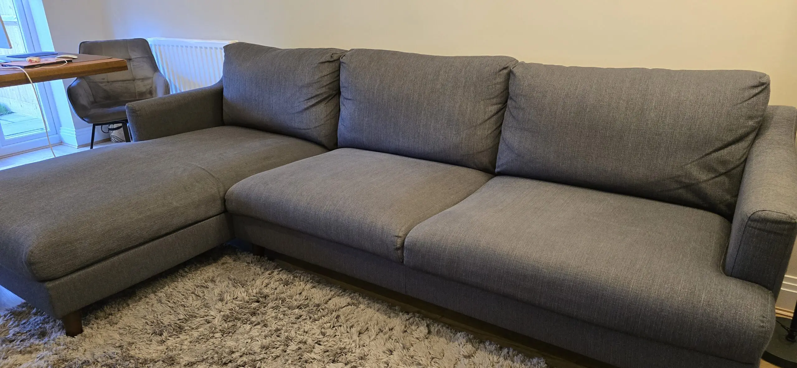 Modern L-shaped 3-seater corner sofa in grey woven fabric, in good used condition. We’ve had it for 3 years and it’s been well looked after.