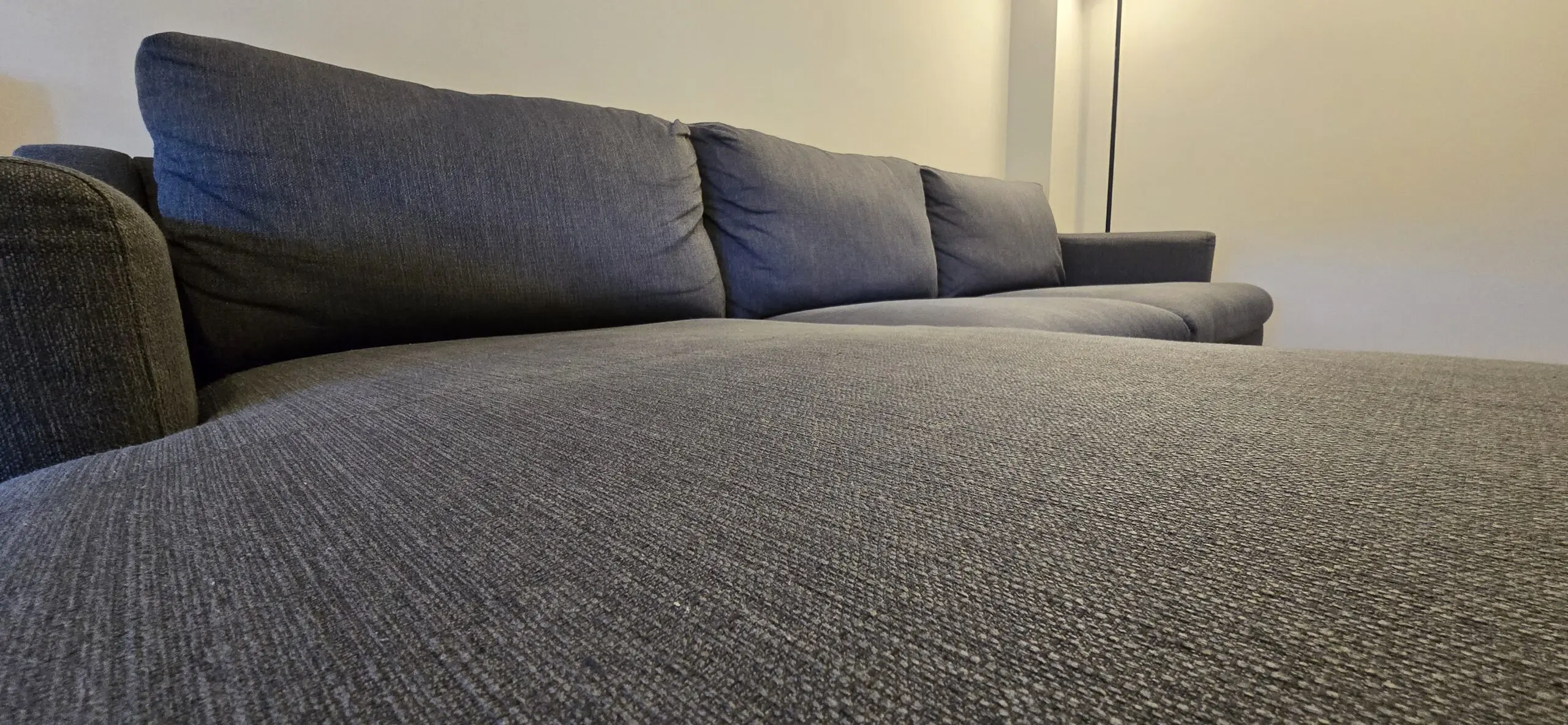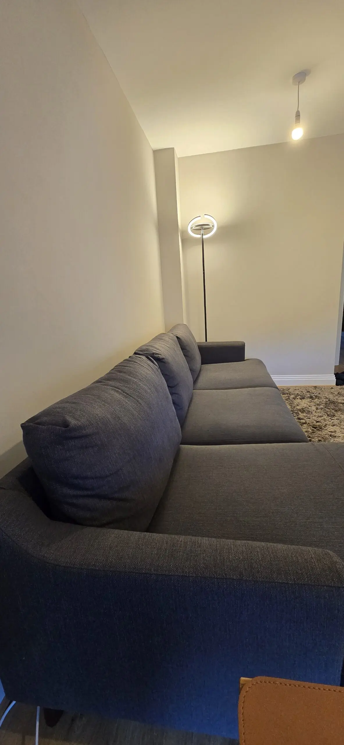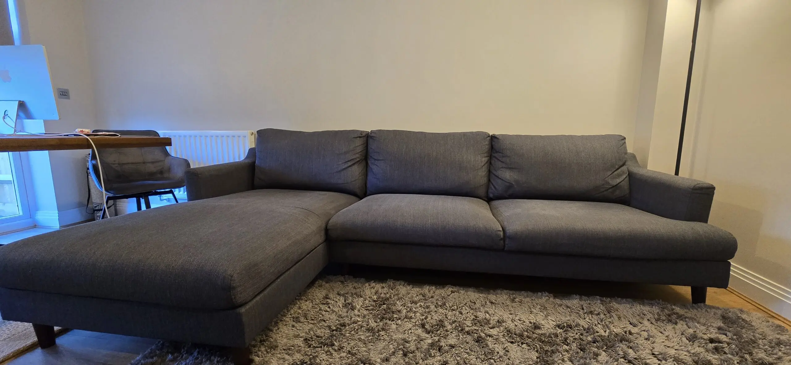 Modern L-shaped 3-seater corner sofa in grey woven fabric, in good used condition. We’ve had it for 3 years and it’s been well looked after.