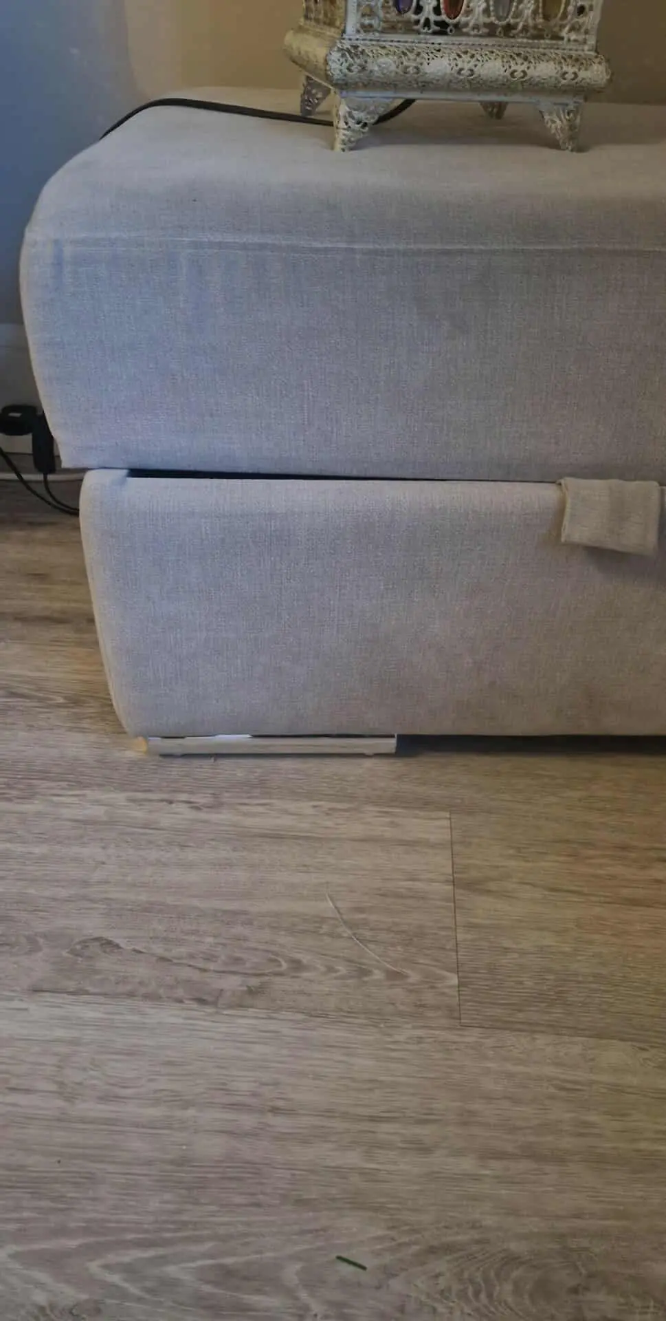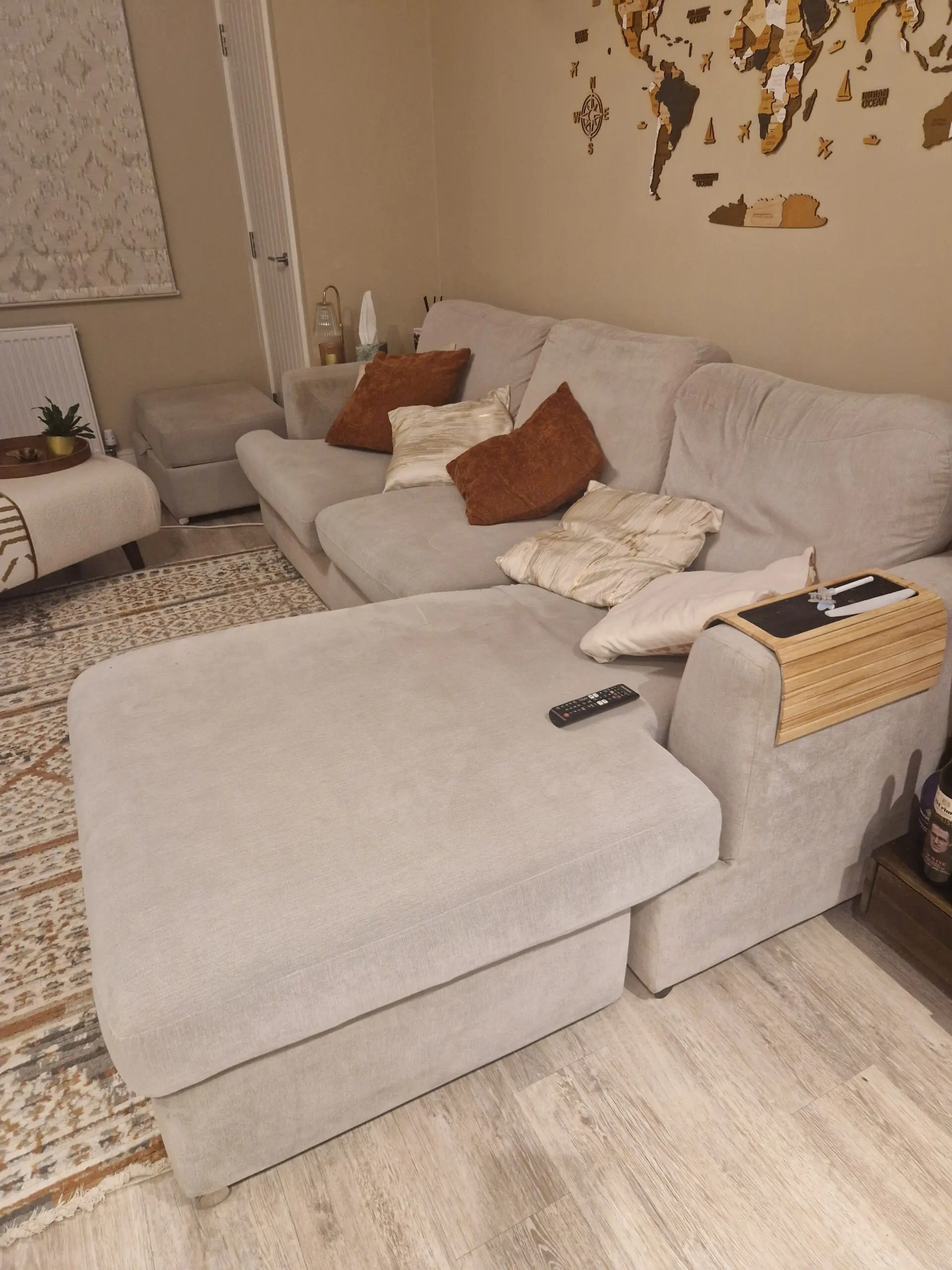 Light grey L shaped sofa. 3 seater with ottoman footstool.