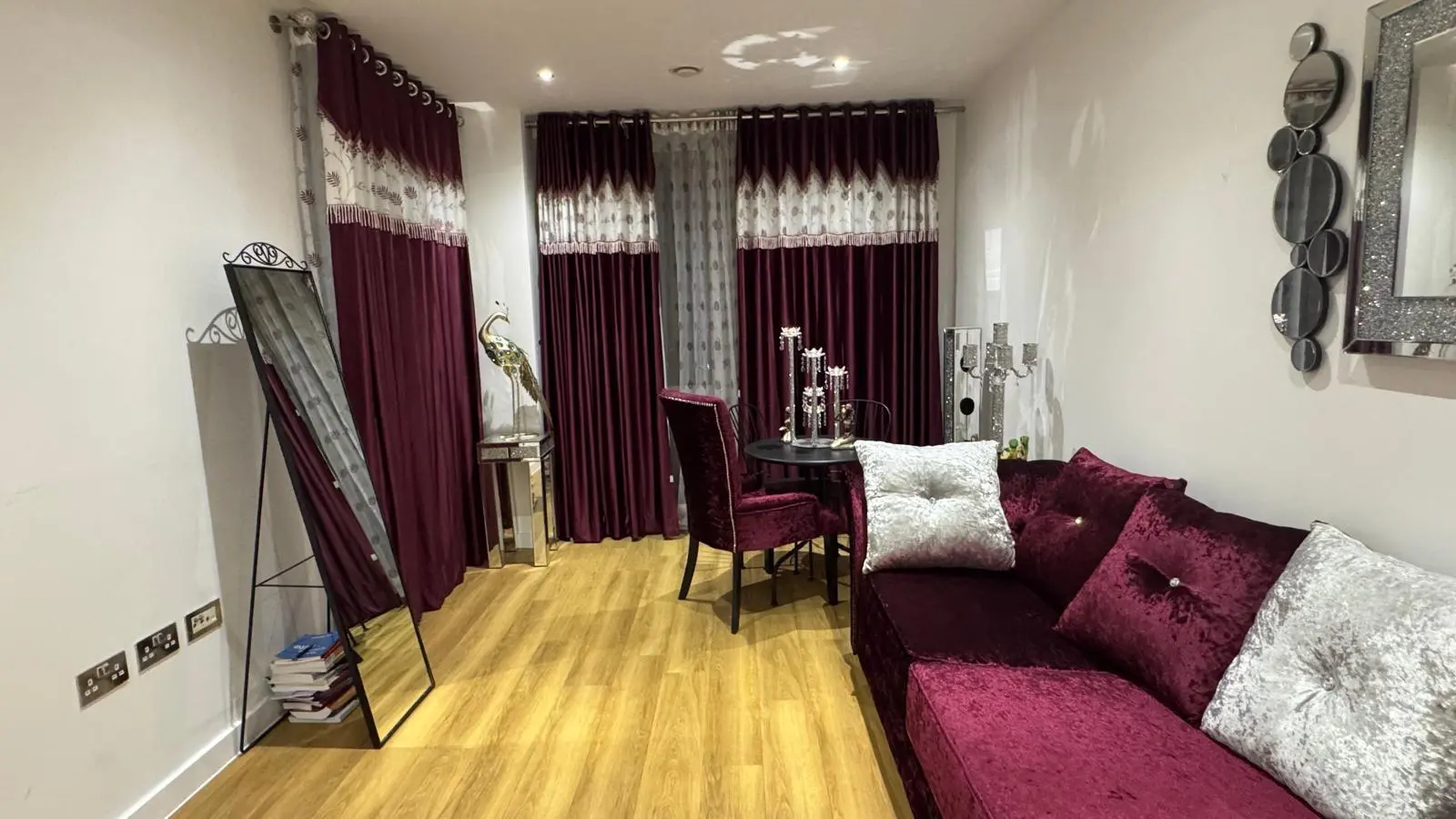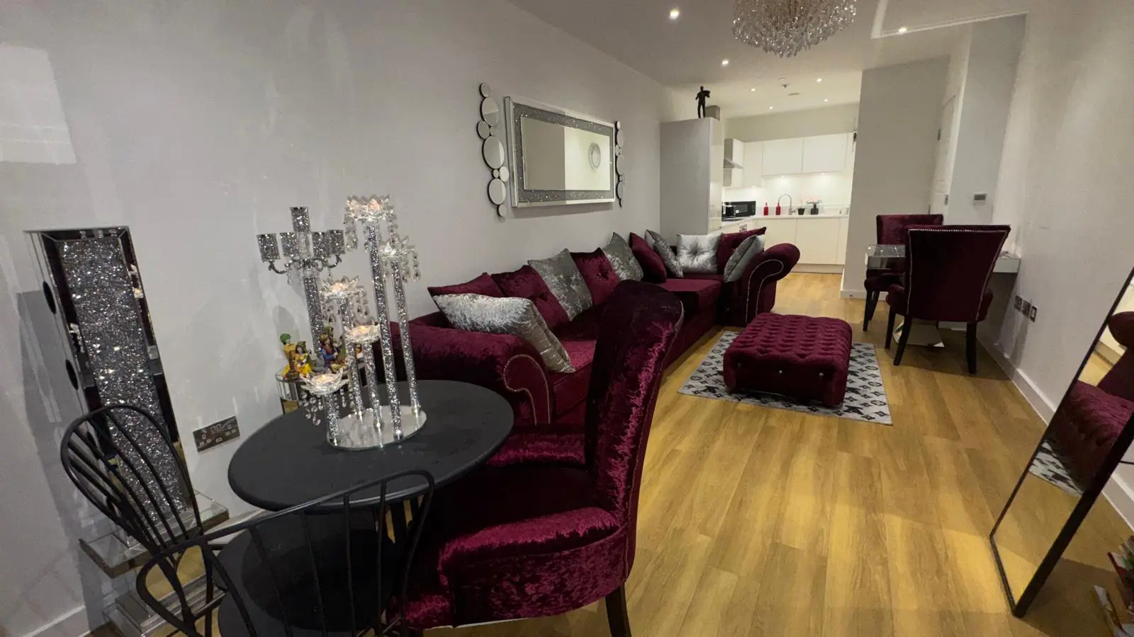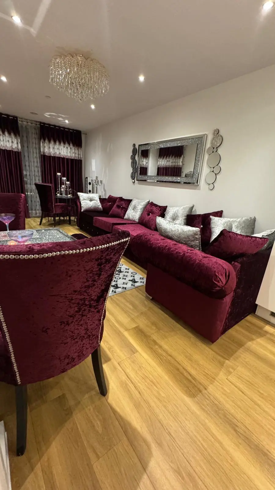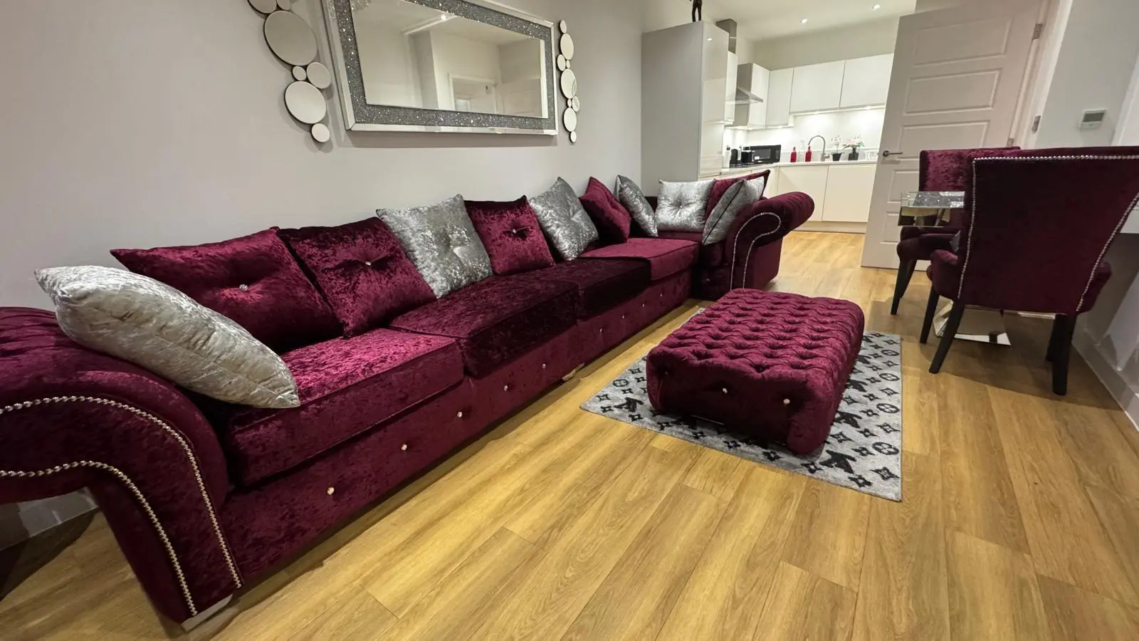 Brand New Corner / L Shape Sofa- Velvet Sofa with Cushions ( Silver and Dark Purple ) As Per the Pictures