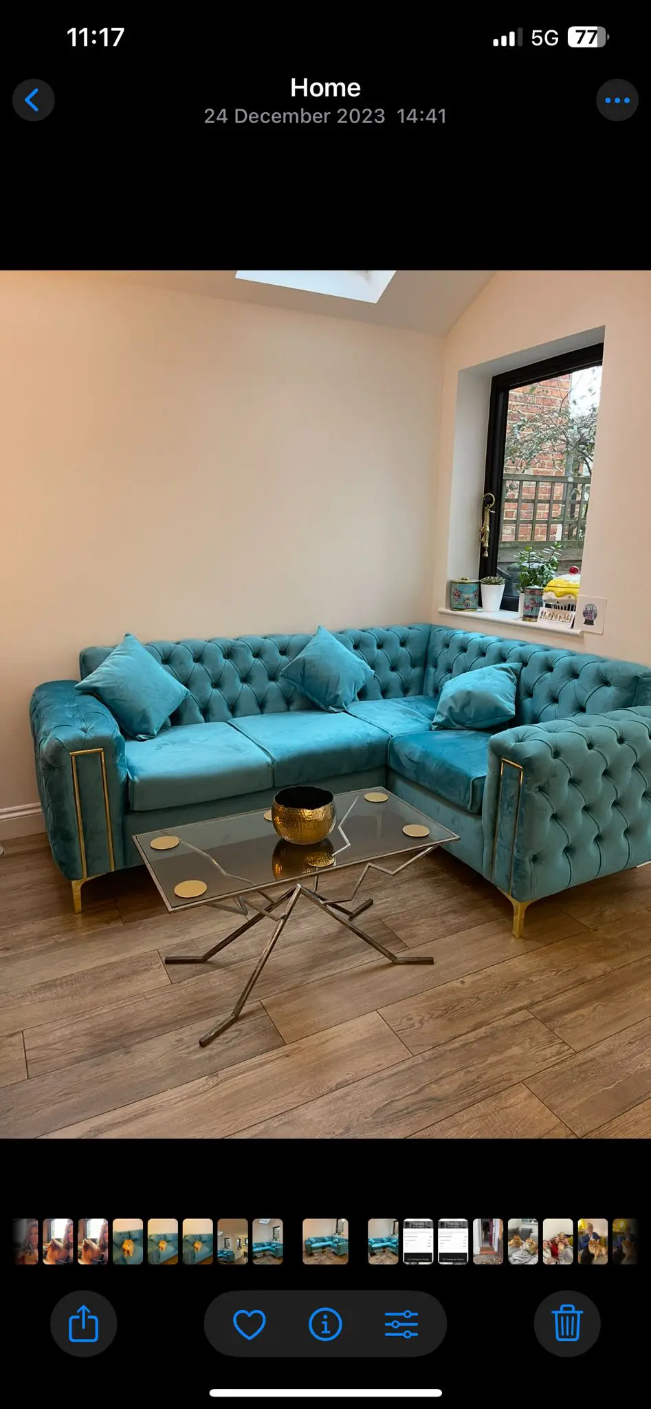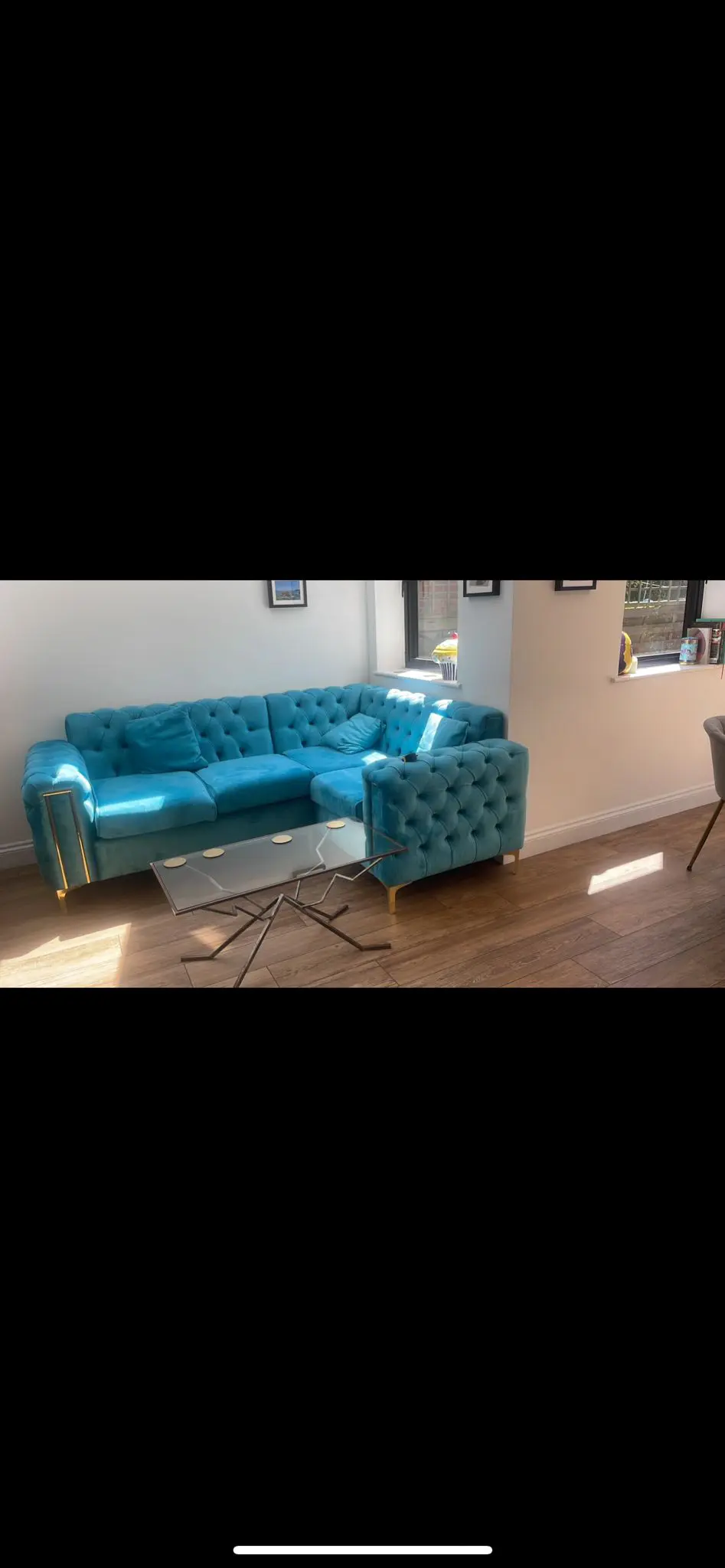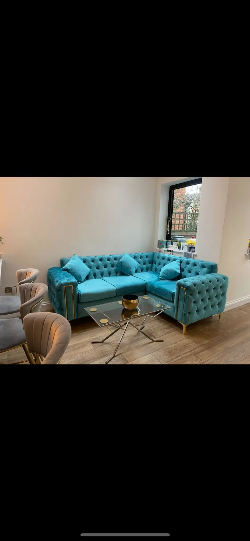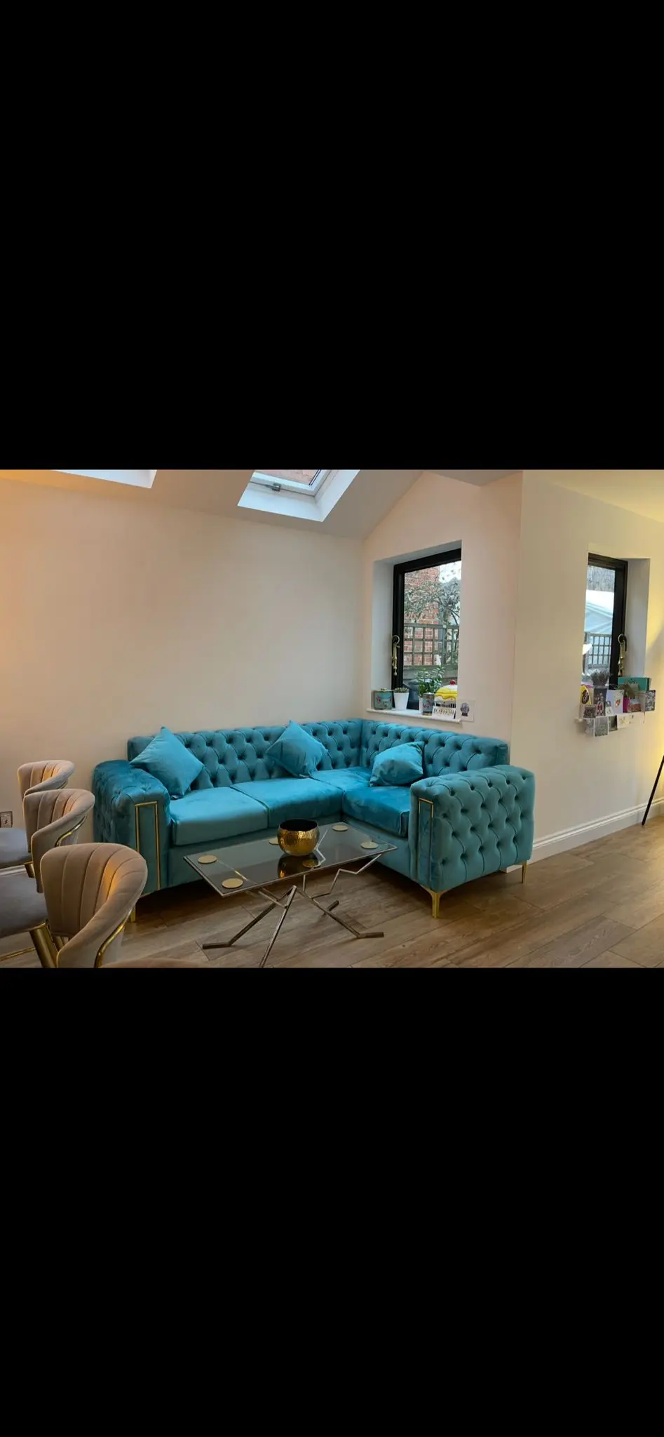 Blue Corner Sofa with Gold legs, comes with three matching cushions.