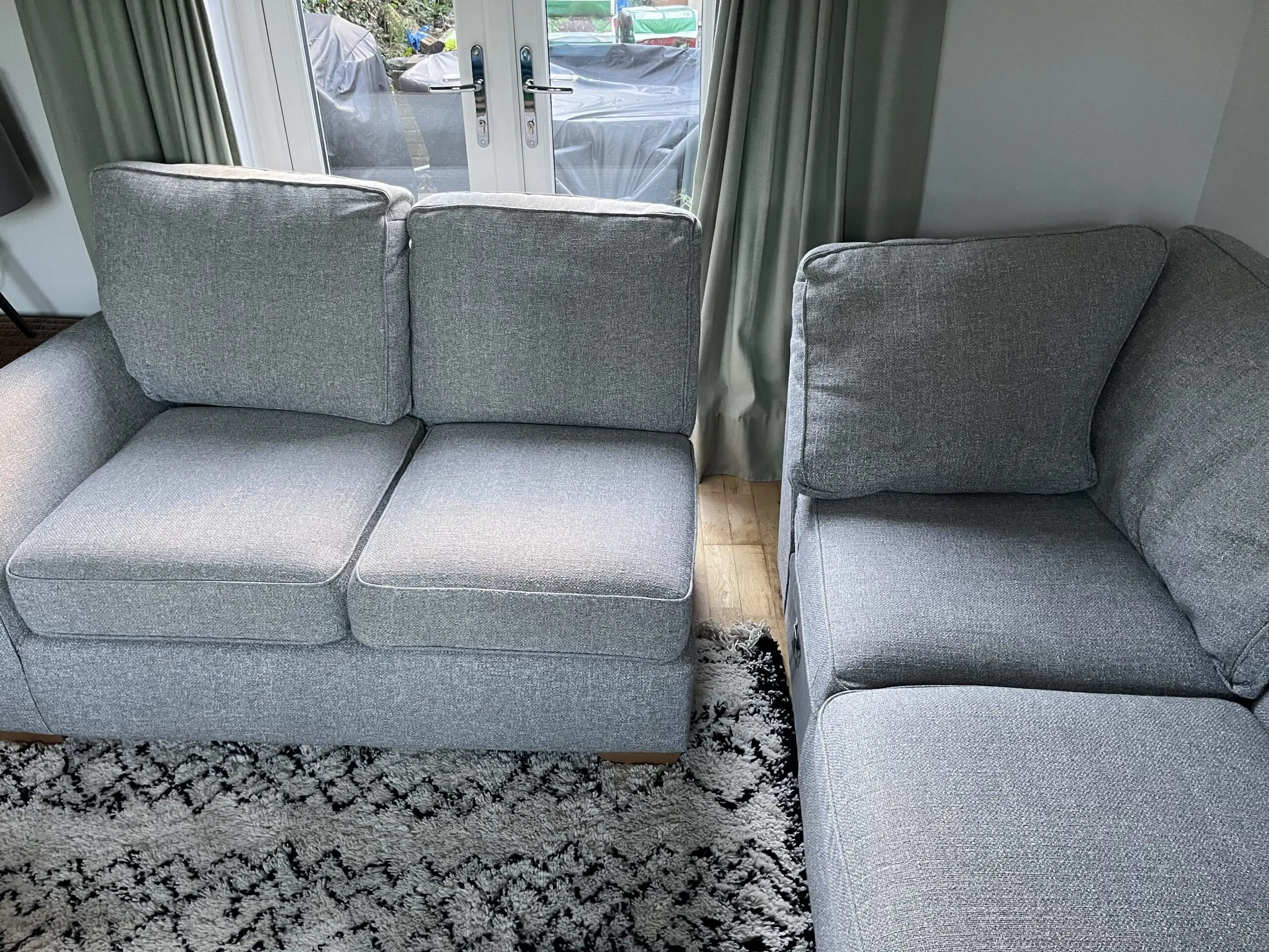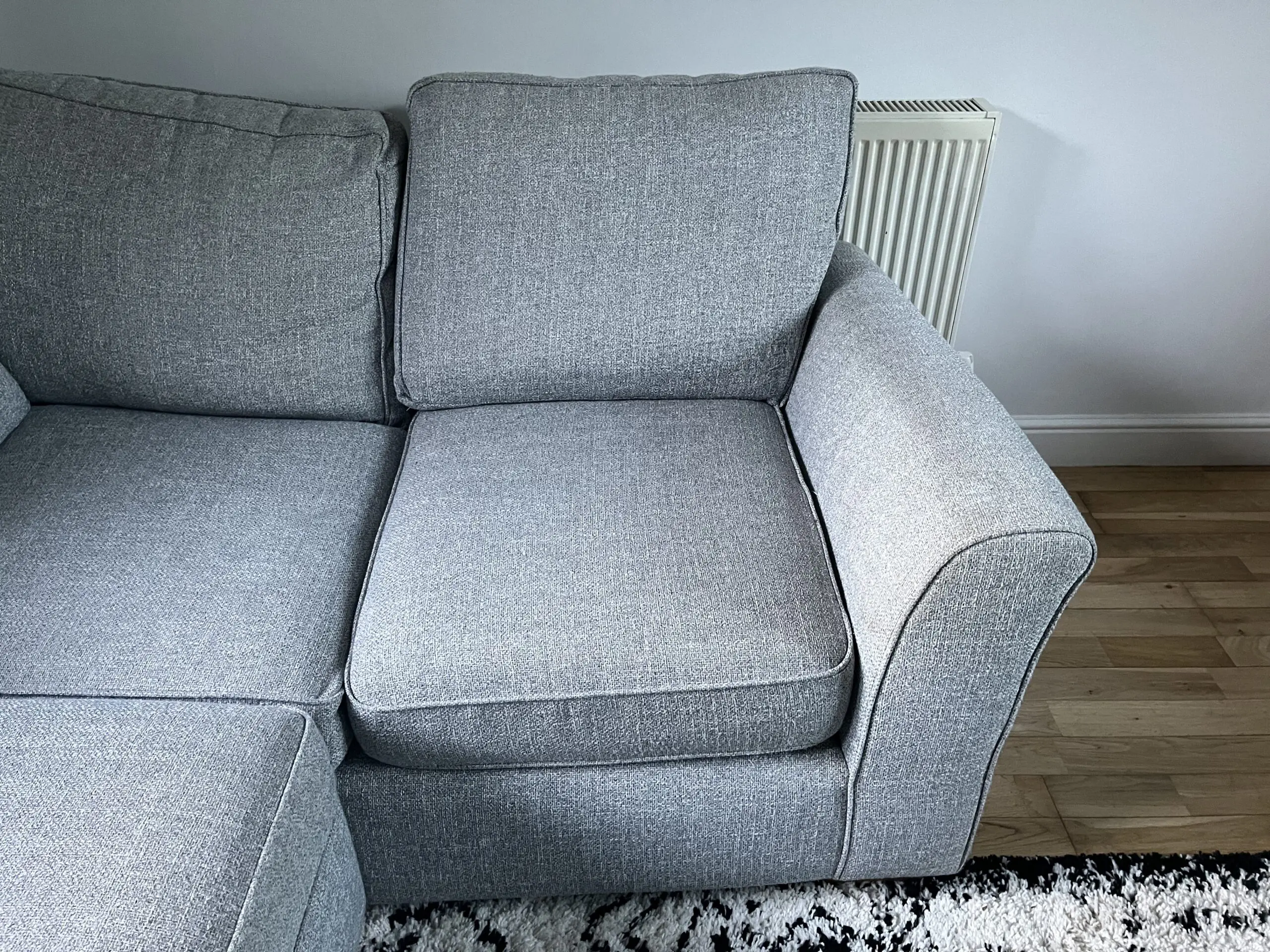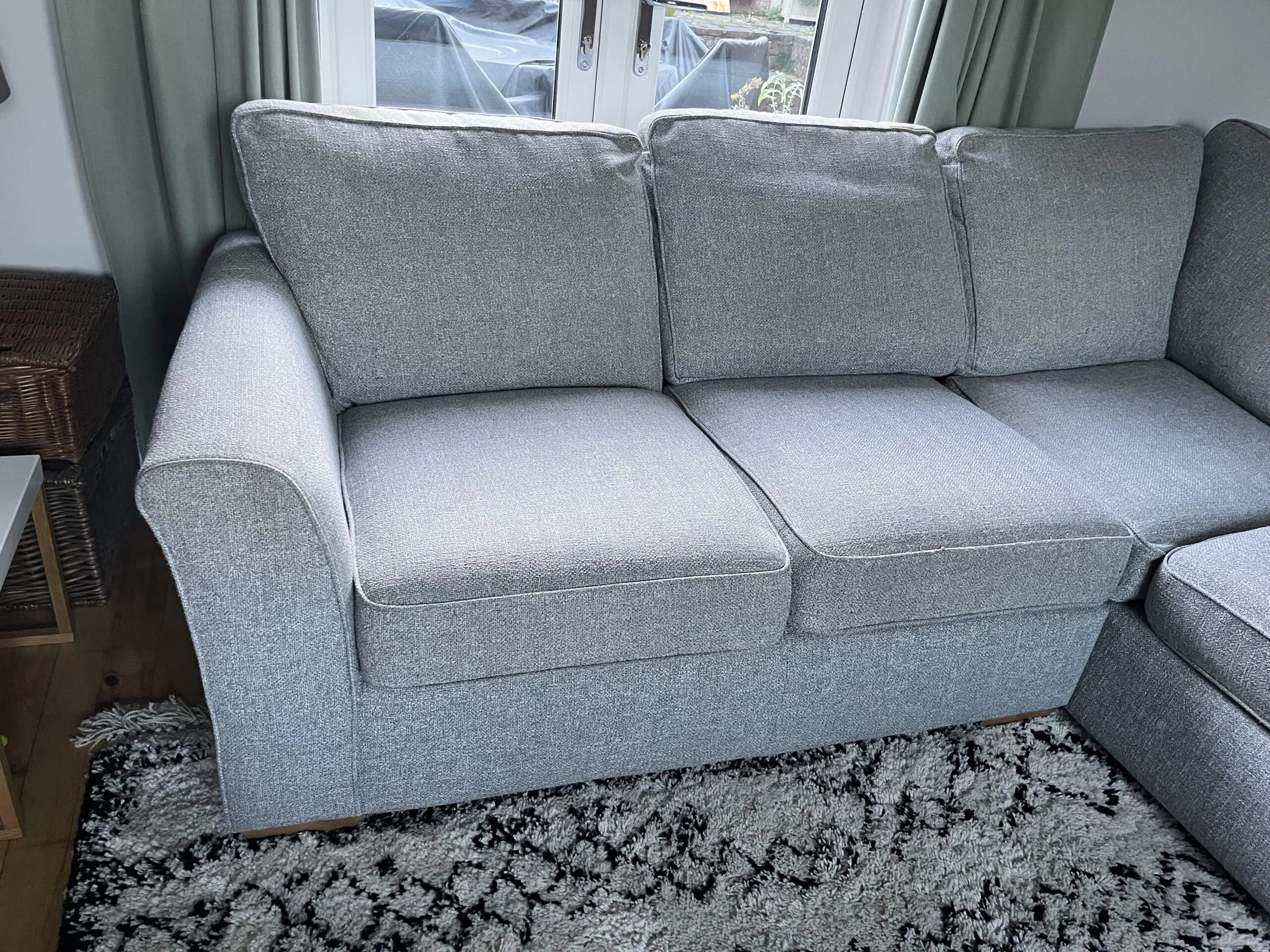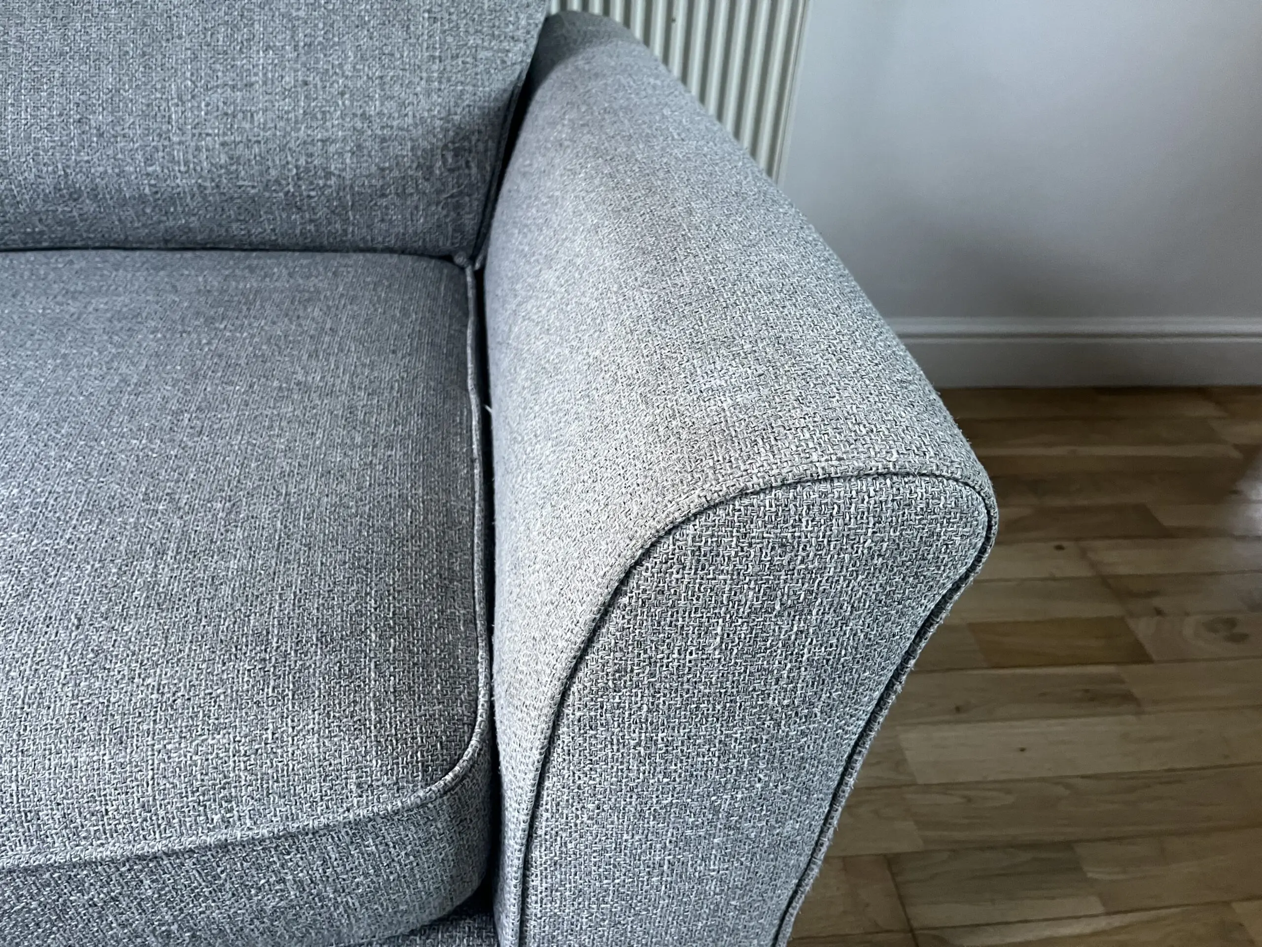 Had since 2018 and still love it but selling due to restricted space in our new house. Decent size, comfortable, great family sofa. Due to light colour has a few marks in places, including water marks on the arms where it has been cleaned. Some bobbling on the cushions. Otherwise in good condition. Think all bobbles could be removed with a wool comb and marks removed with a spot wash.