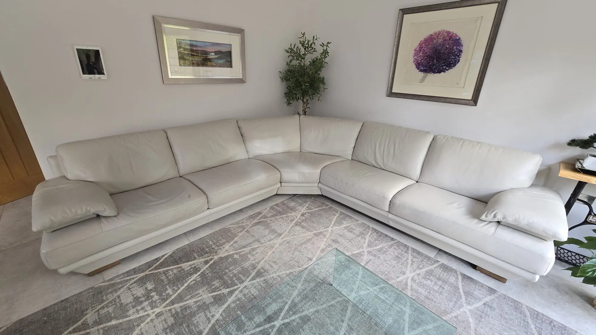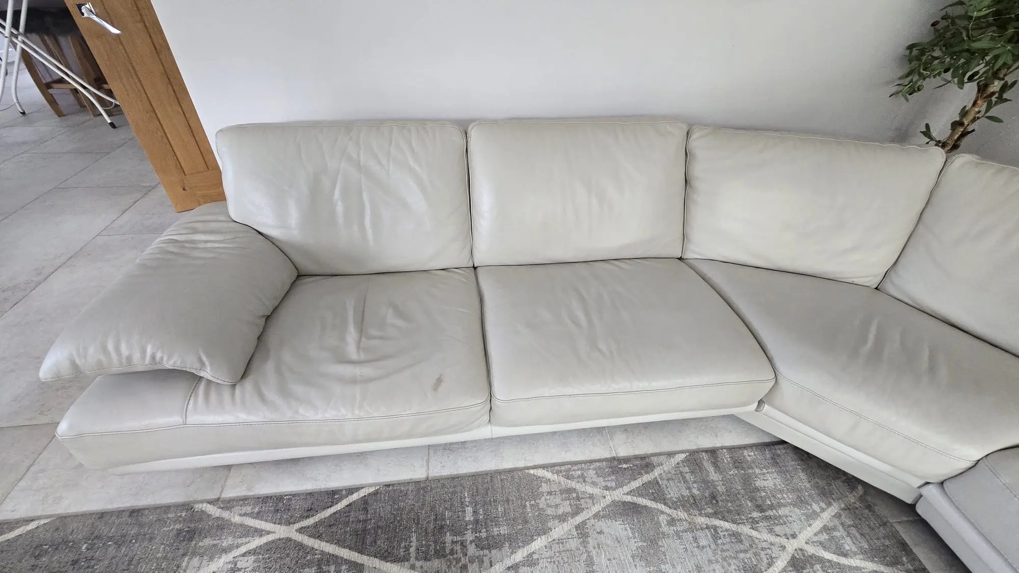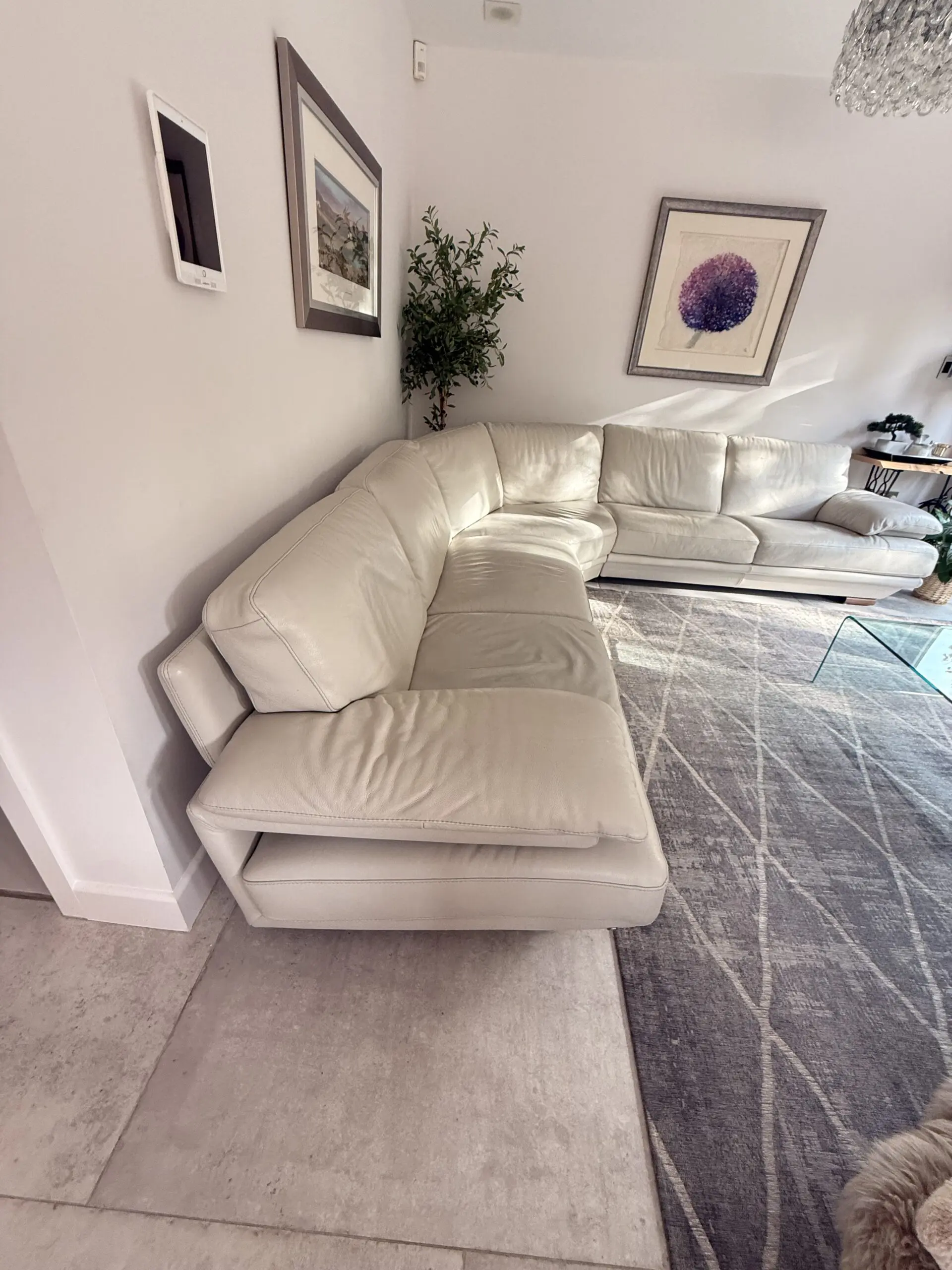 Comfortable excellent quality Natuzzi cream leather large corner sofa , it’s very clean and well looked after . Small mark on right hand side chair which isn’t too noticeable and could maybe be repaired . Original cost was over £7000