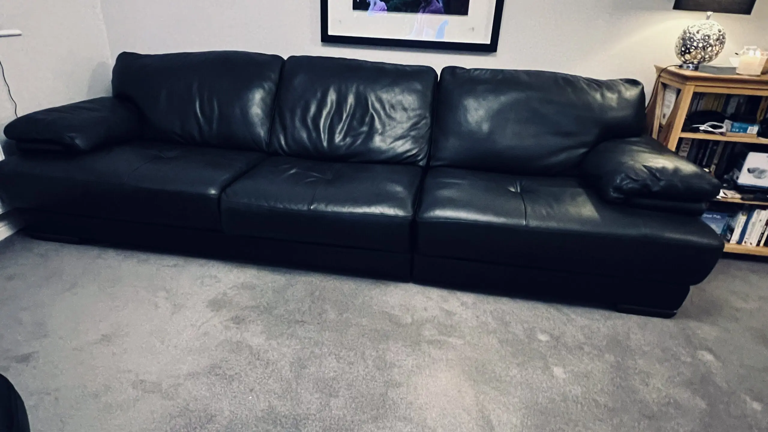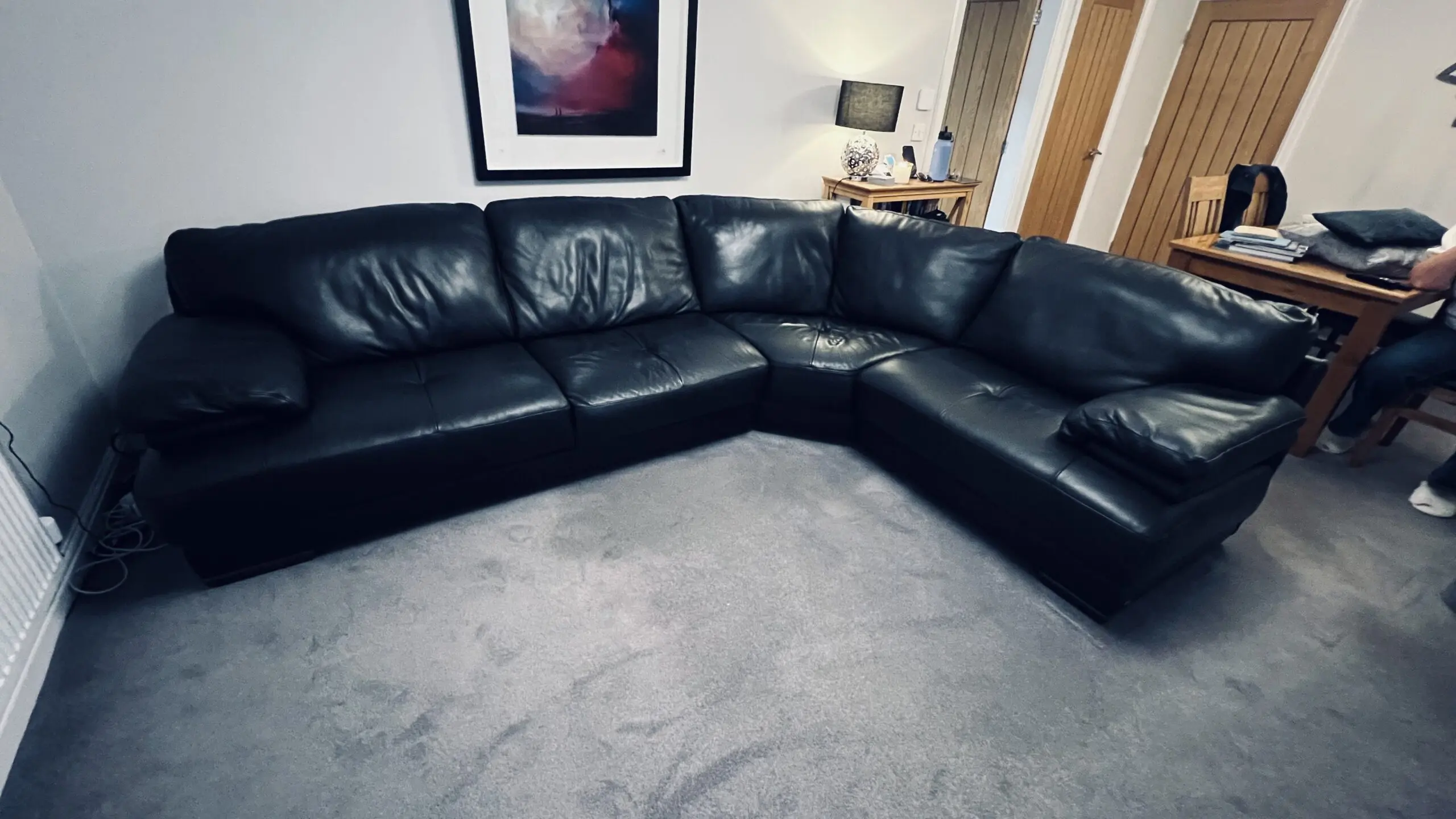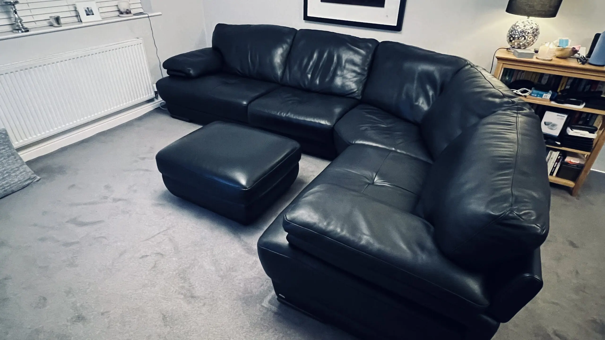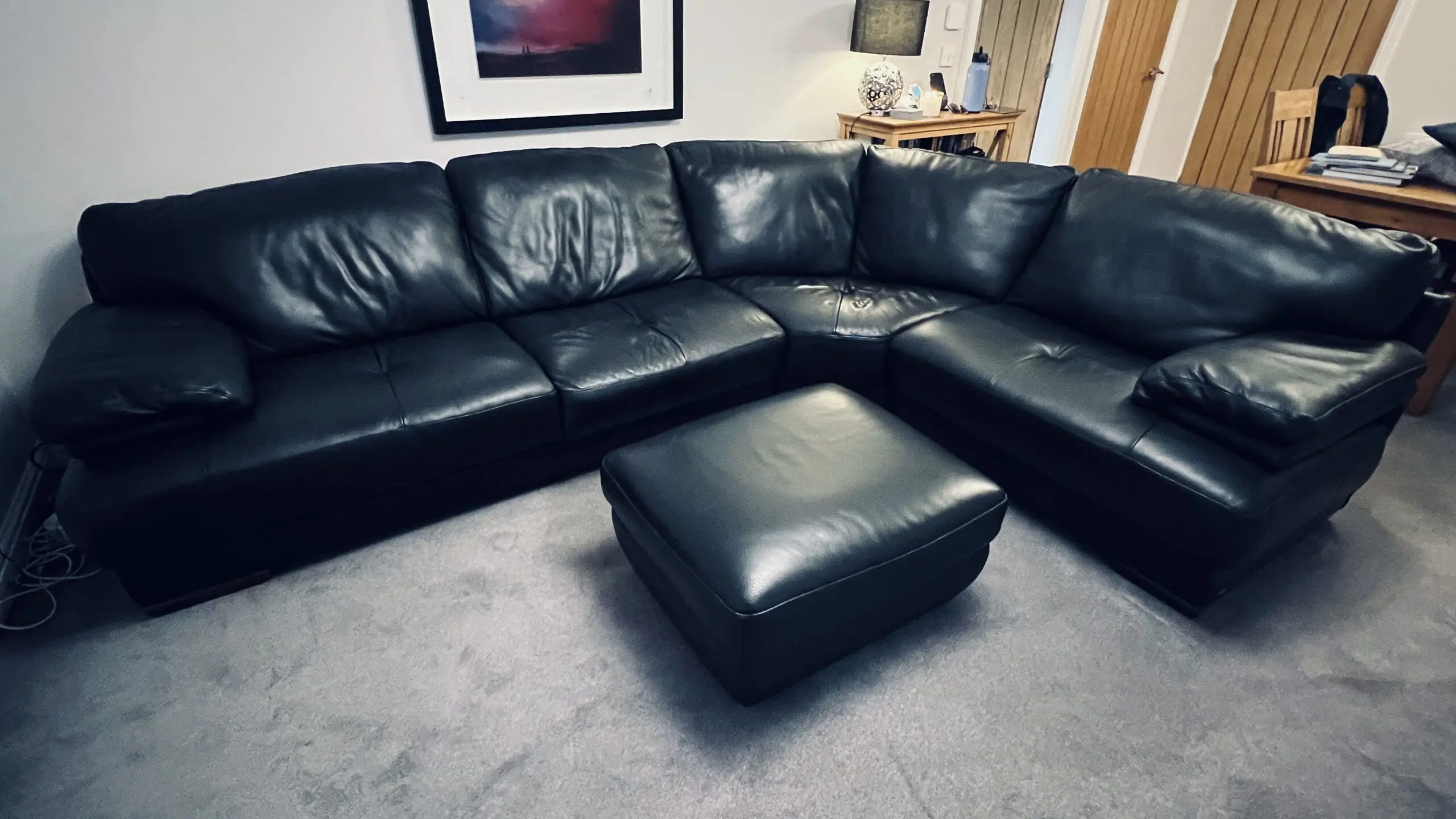Black corner sofa. Splits into 3 pieces. Good condition with minimal wear. With matching foot stool. Can be used as straight sofa without corner. Exact measurements to follow.