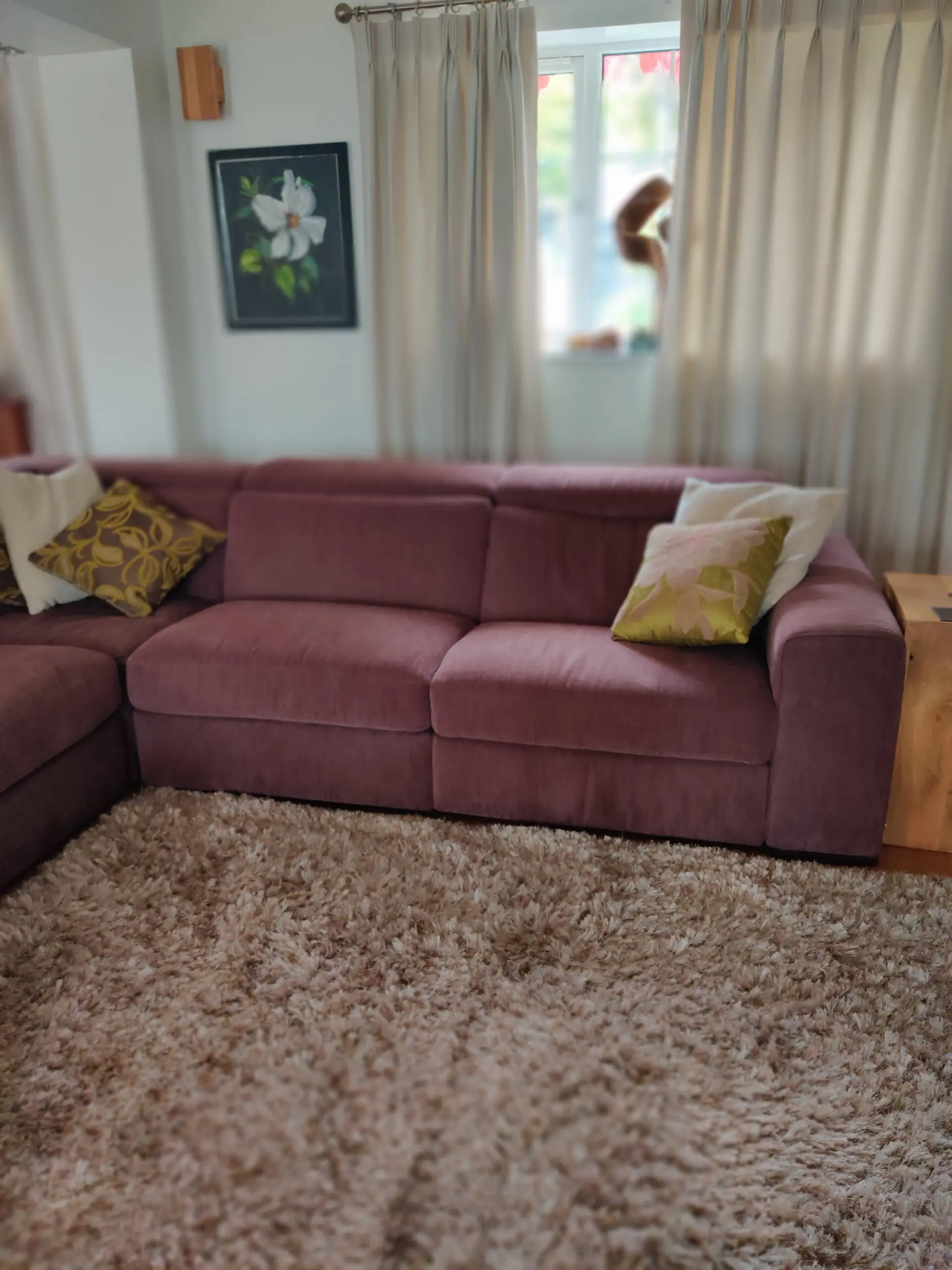 3 metre X 4 metre corner sofa. Maroon fabric. Chase at one end and foot rest at the other.
