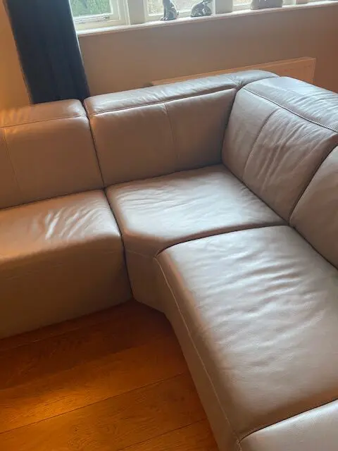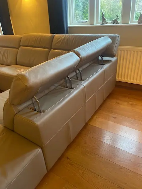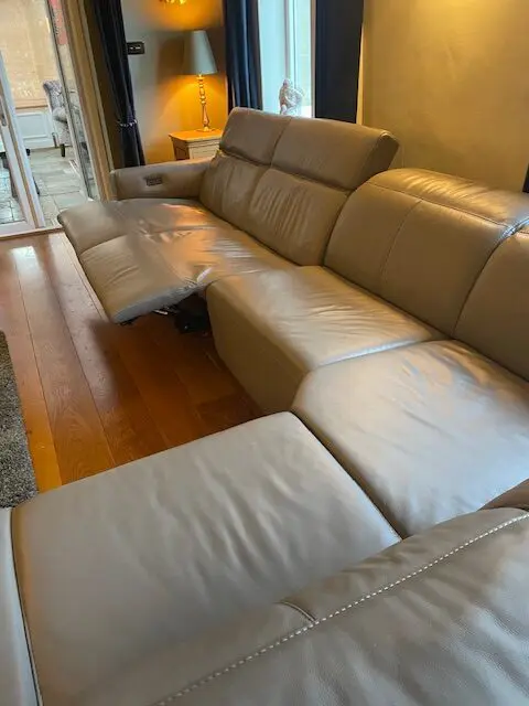 Natuzzi Modus Corner Suite in Grey Leather. Overall Size 398cm x 230cm made up of 4 components which are 2 electric reclining seats, a chair and a half and corner chair and return.