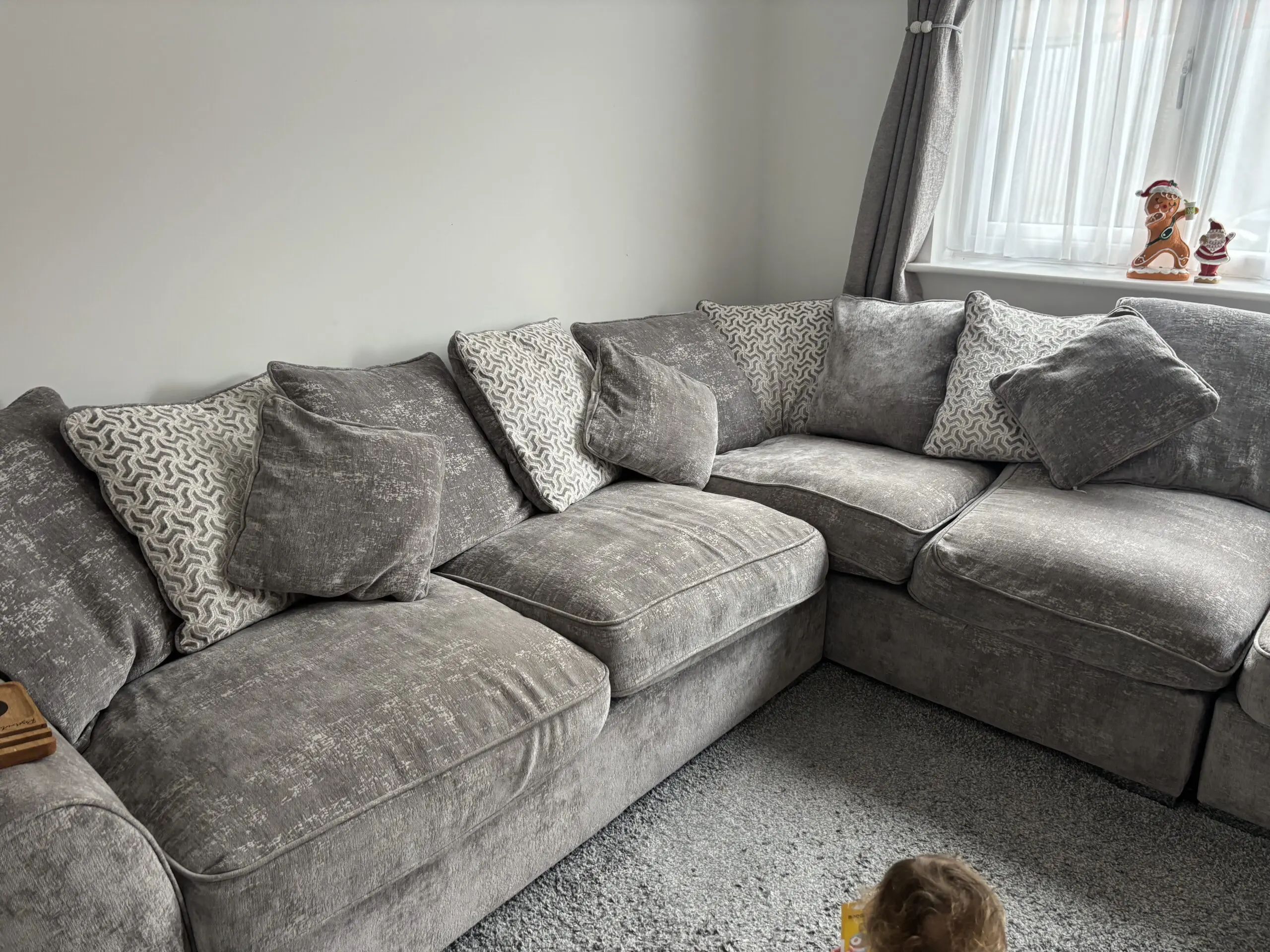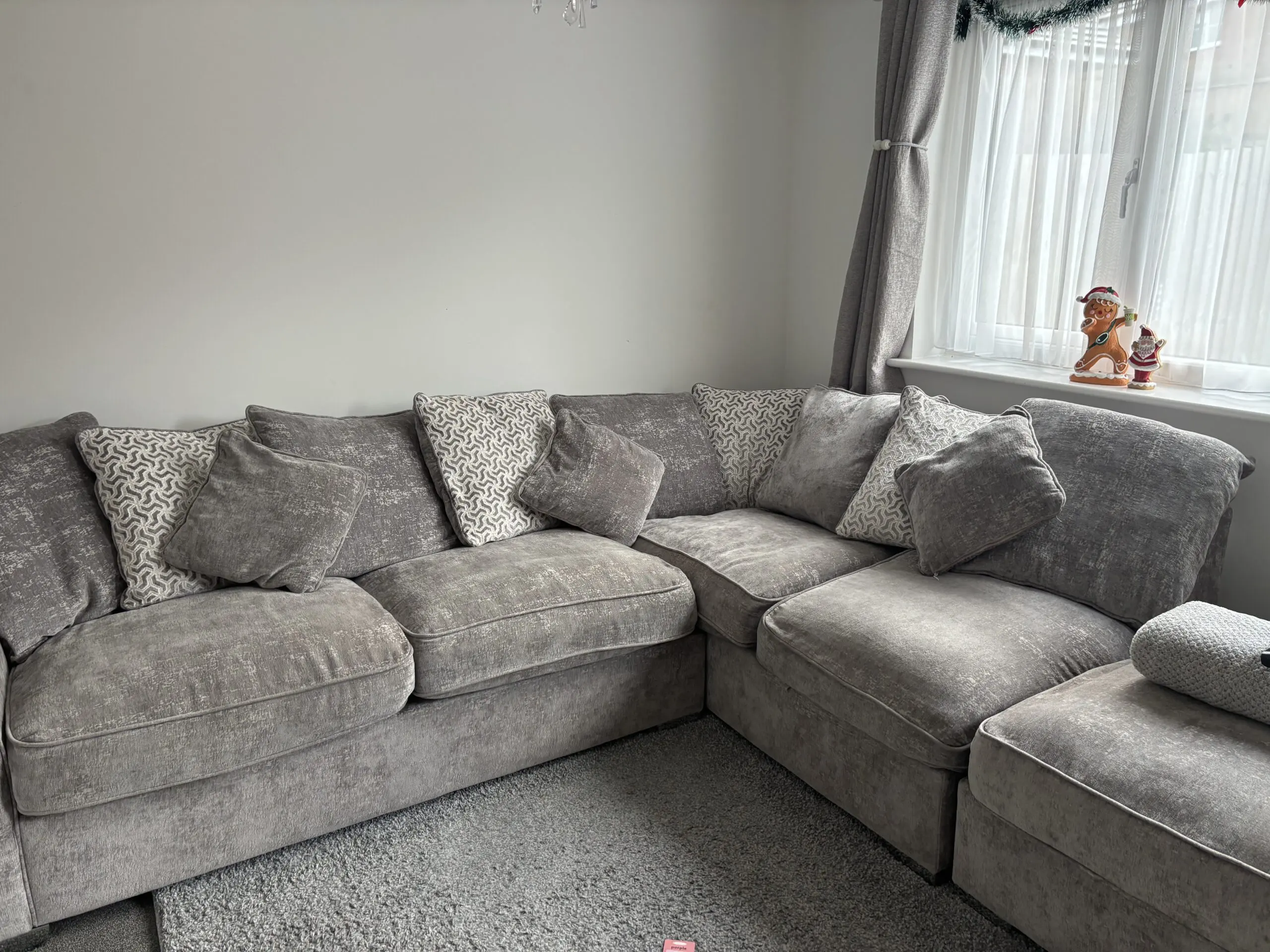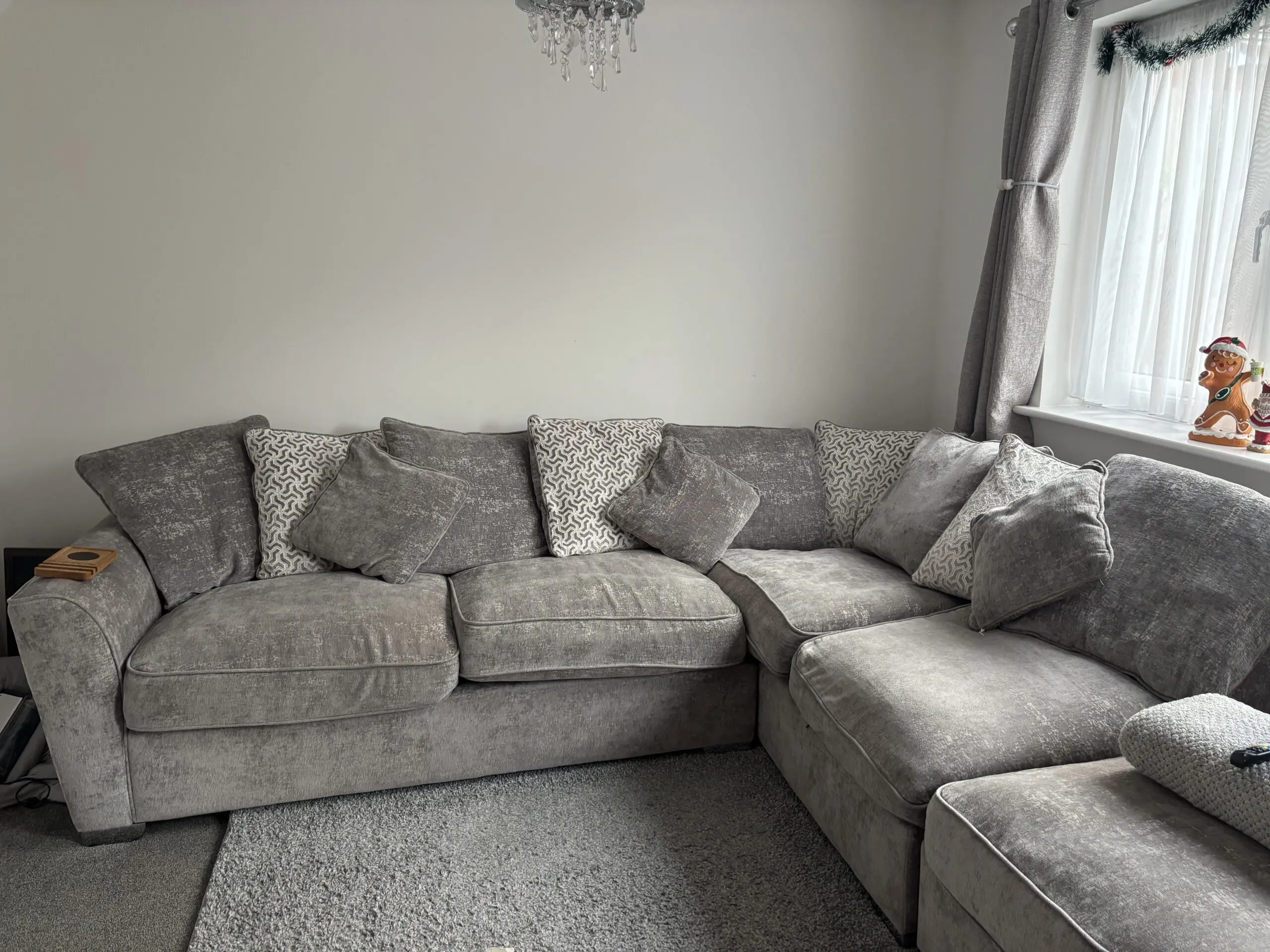 Grey/silver corner sofa from NCF only had for 2 years. Comes with scatter back cushions and 3 smaller cushions