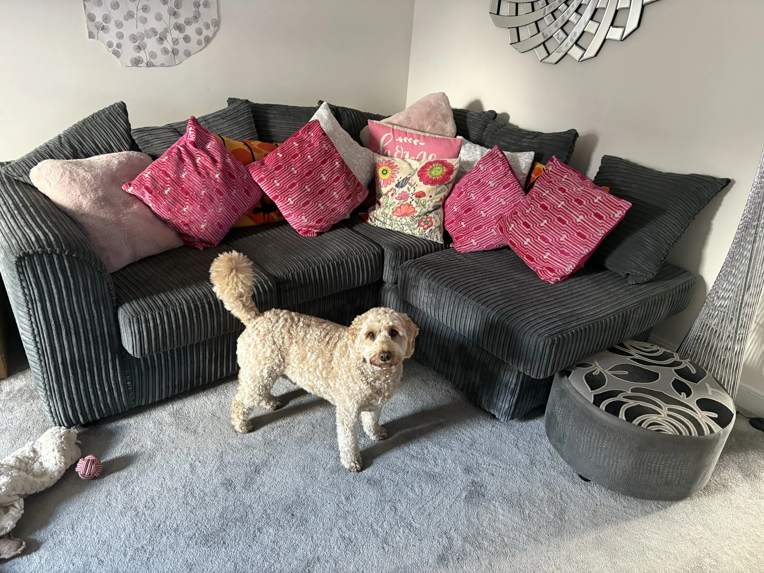 Grey corduroy corner sofa . 4 months only . Base Comes in 2 parts , 7 back cushions , 3 base cushions – perfect condition