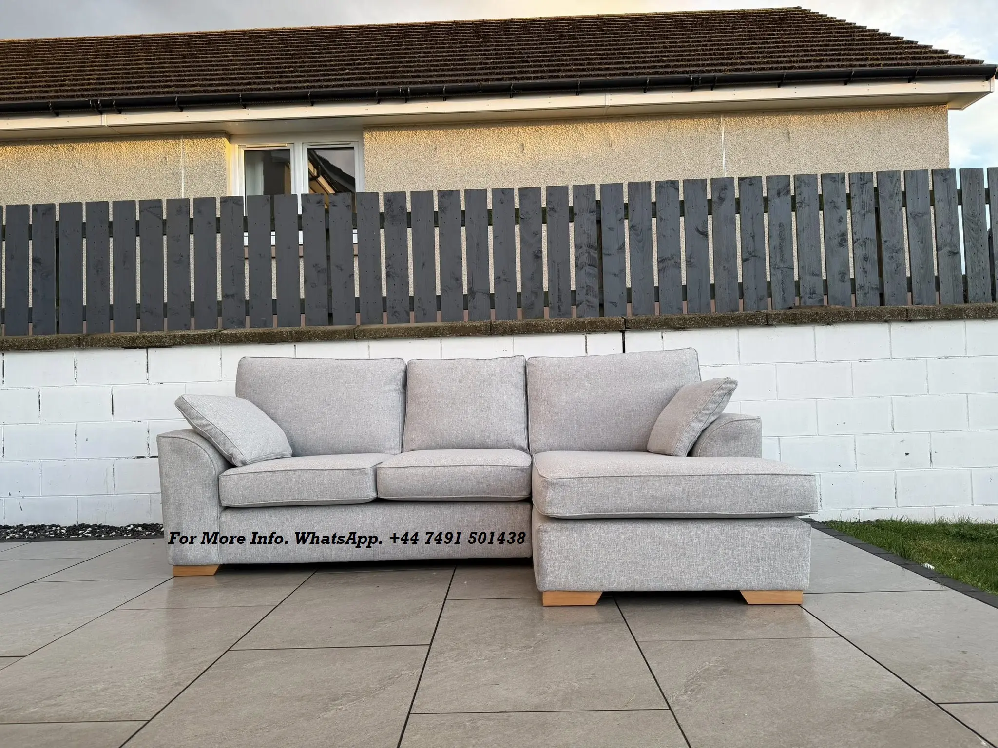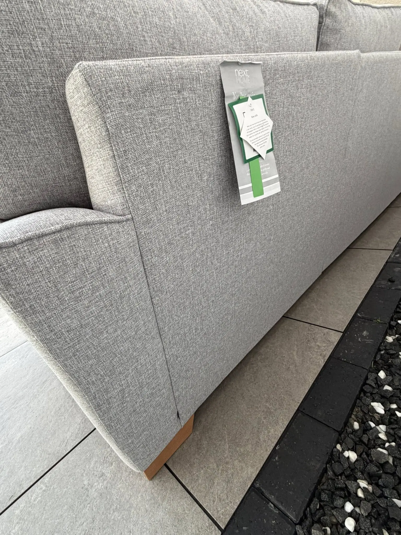 A fantastic NEXT corner sofa from THEIR ‘Stamford’ range. This sofa has been upholstered in a grey fabric. The set has foam seat cushions and fibre filled back and side cushions.