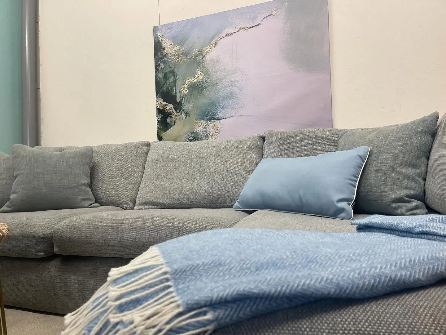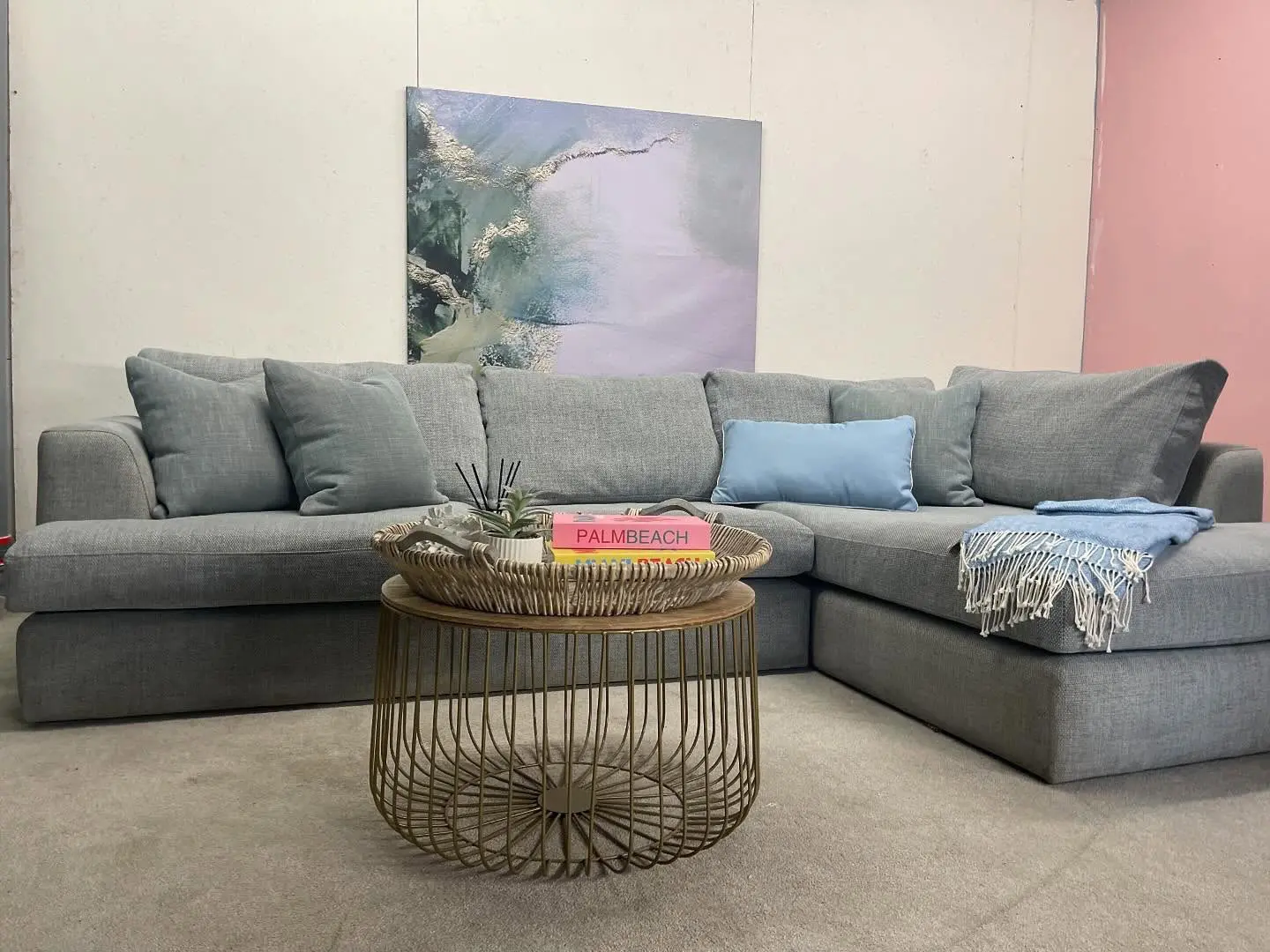 The chaise has storage space underneath the seat and the sofa contains a pull-out double bed. Upholstered in Light Grey Chunky Weave fabric… it’s a real lounging sofa that seats 5-6 people✌️.