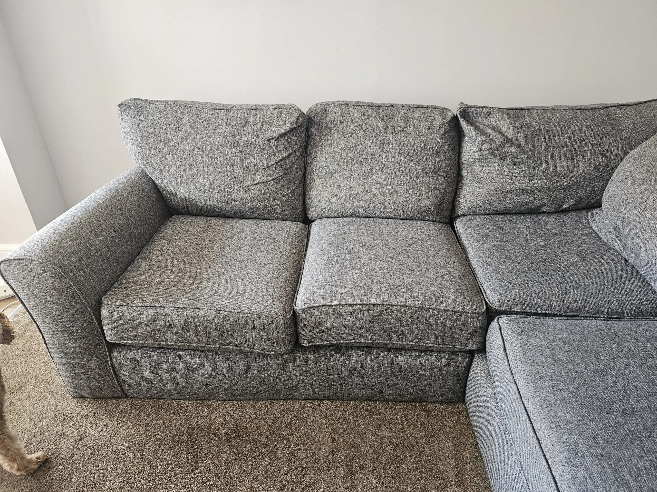 Next right hand corner sofa in grey. Originally bought for £1300. Overall good condition. No rips, stains or damage. Smoke free home. Well looked after. Does with brown legs, that we still have brand new (we never attached them). Selling as not the right size for our space.
