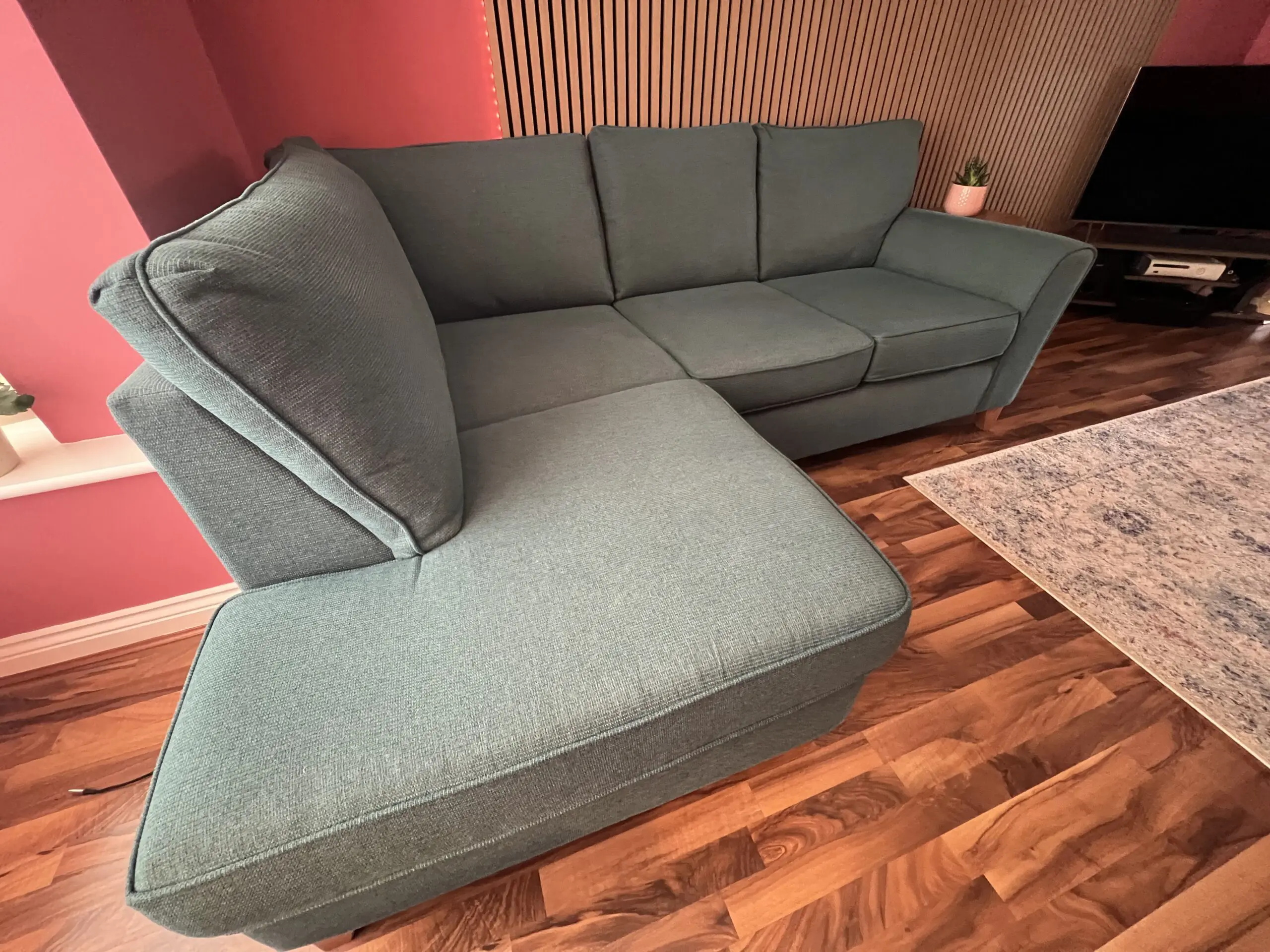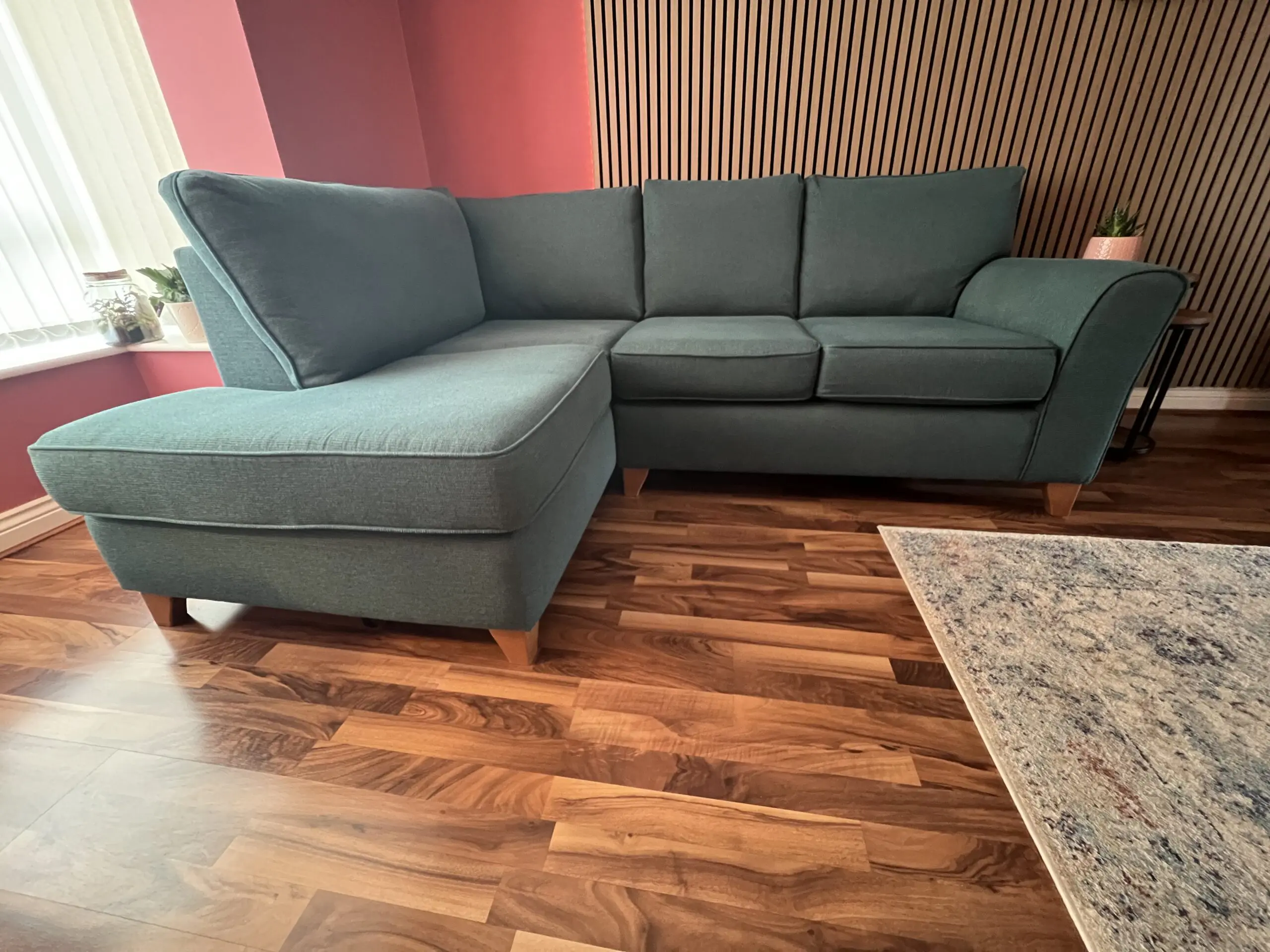 This spacious L-shaped corner sofa is perfect for family living and entertaining guests. The design features a comfortable chaise lounge section on the left and a three-seater section, providing ample seating for 4-5 people. It comes with a selection of coordinating scatter cushions including patterned accent pillows that add visual interest. The sofa sits on wooden legs and would make an excellent centrepiece for any living room or lounge area.