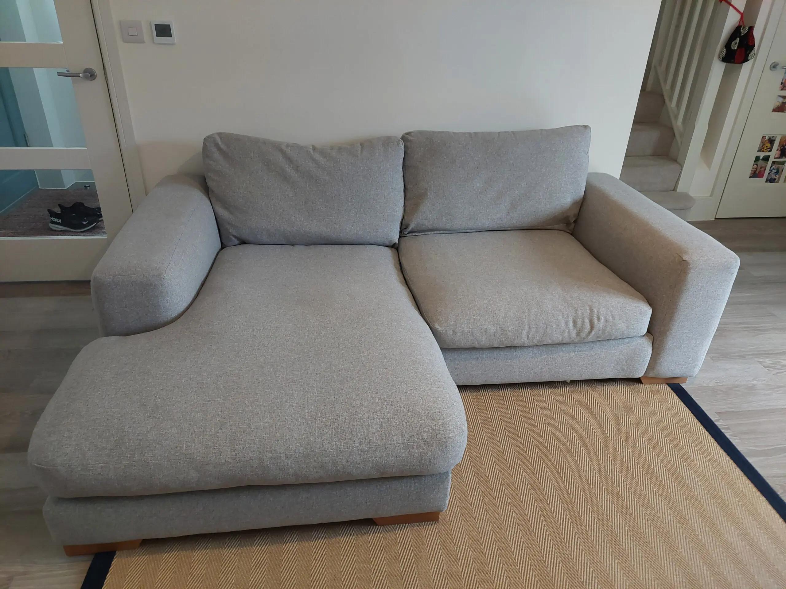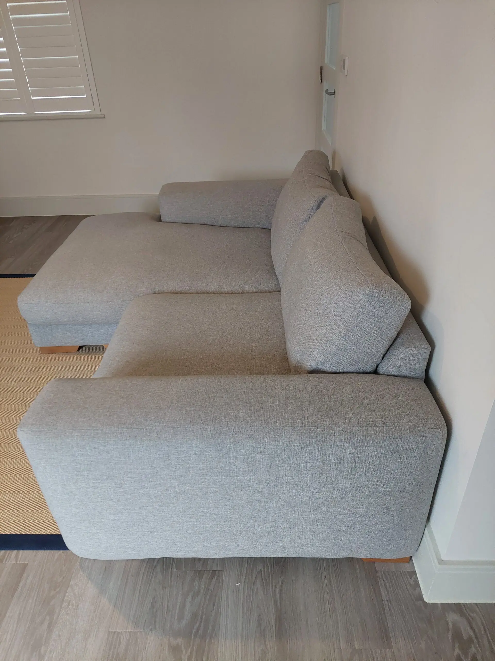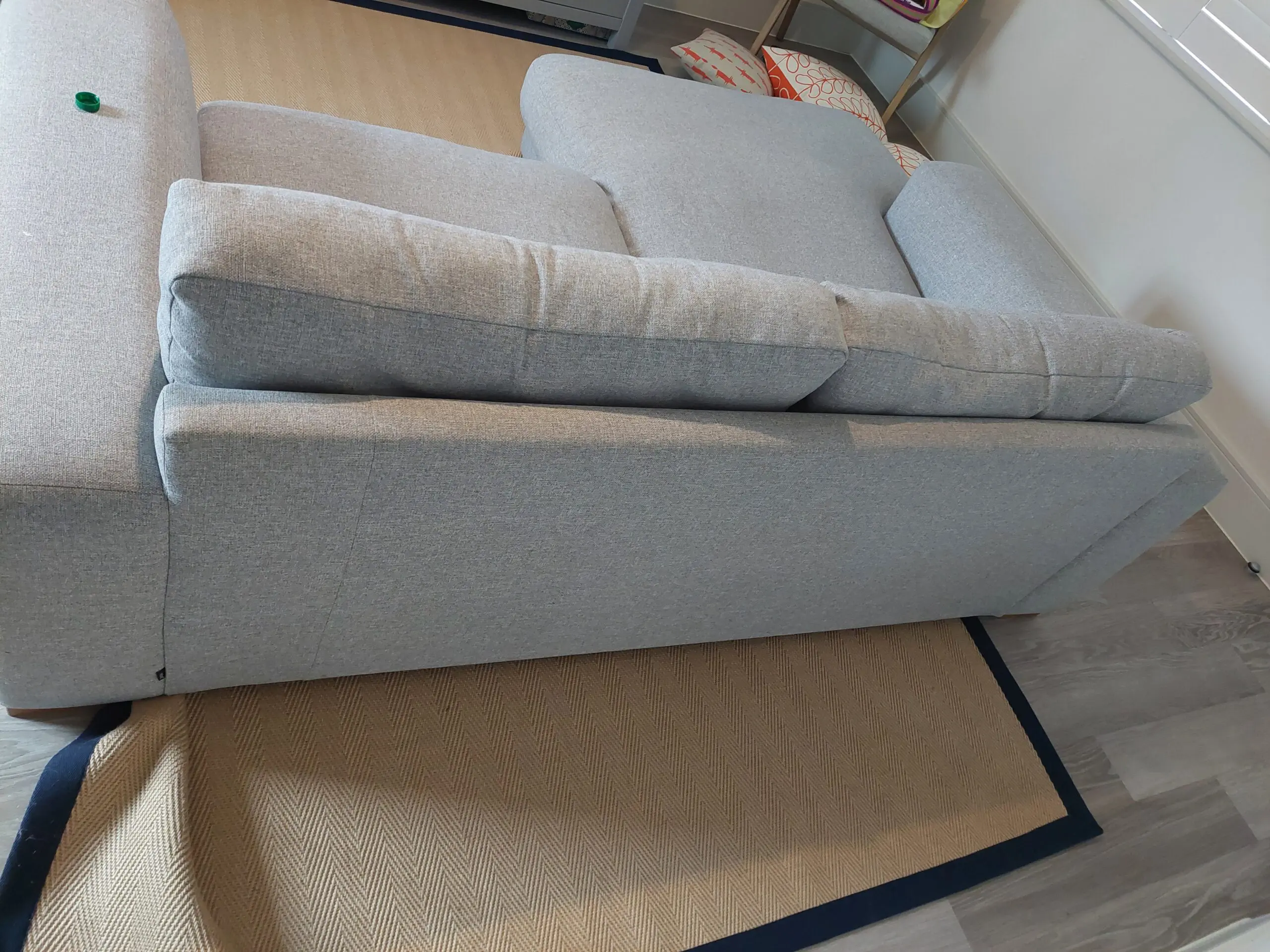 My sofa is in very good shape. It’s 7 years old, and it has scotch guard on the whole of the sofa, so it won’t stain. It’s a large 2 seater sofa. L shaped and you can move the L, to be right or left. It’s grey/blue coloured and soft material .. very comfy and soft to sit on. It would fit 1 adult and 2 kids..