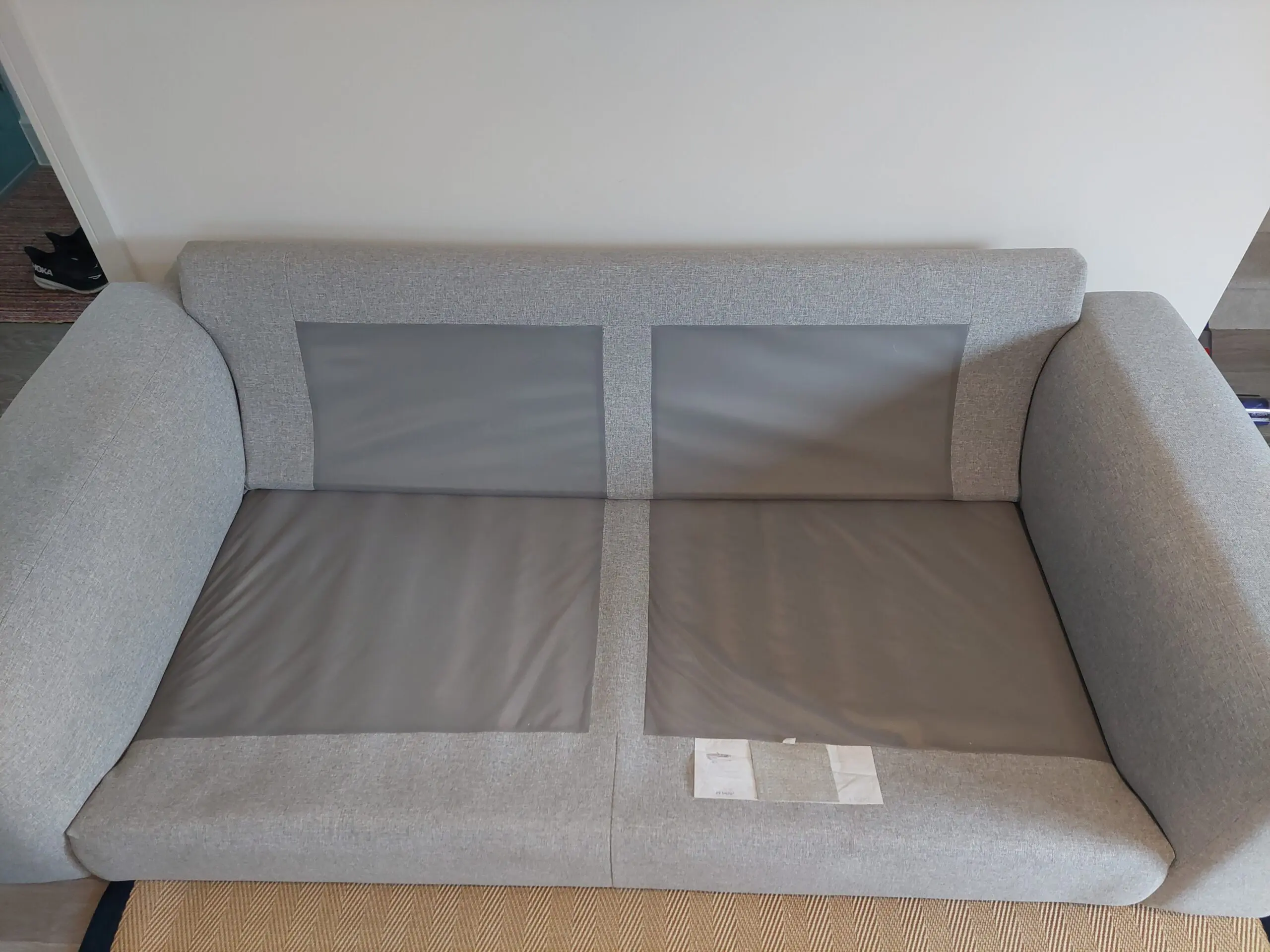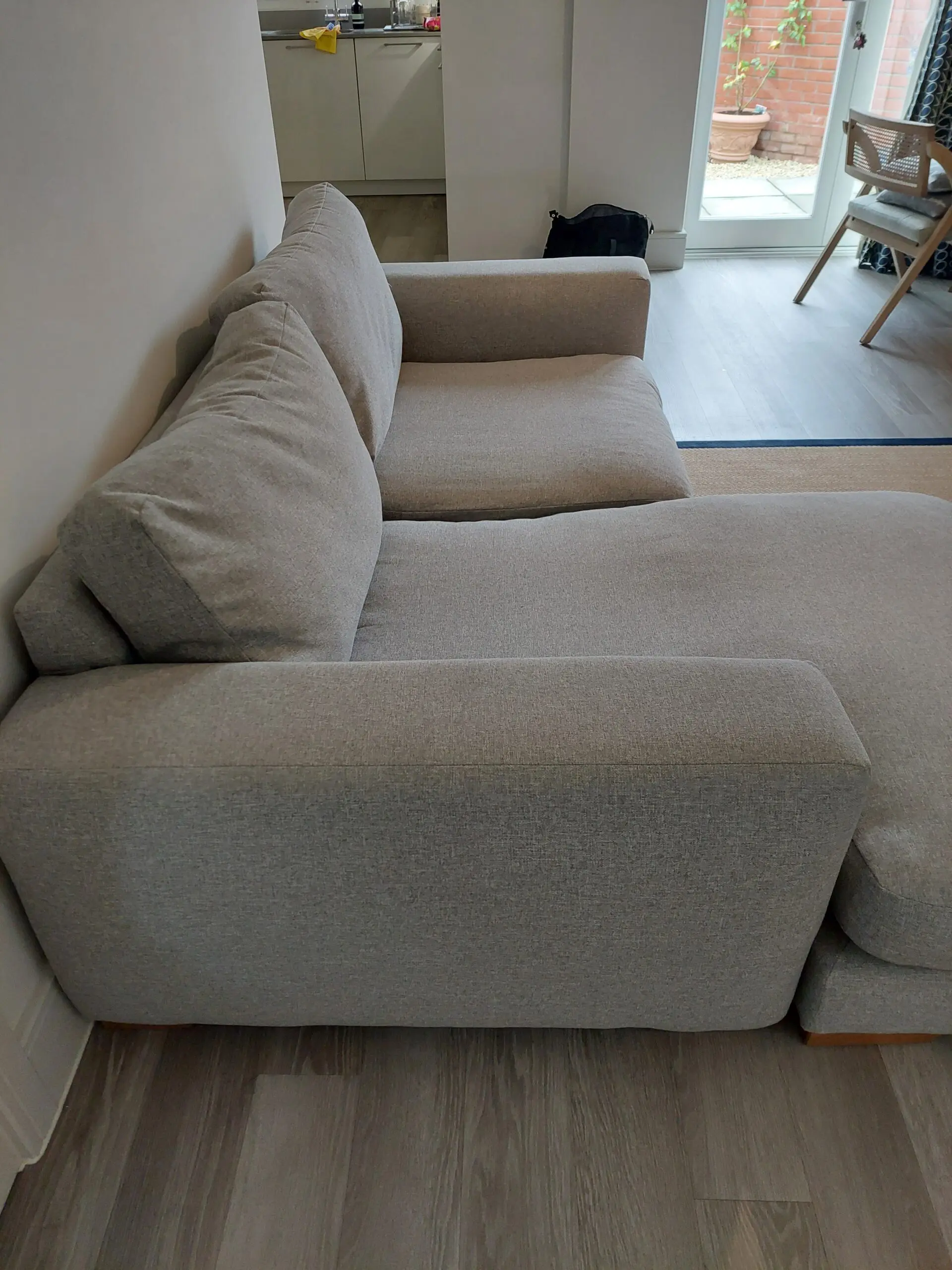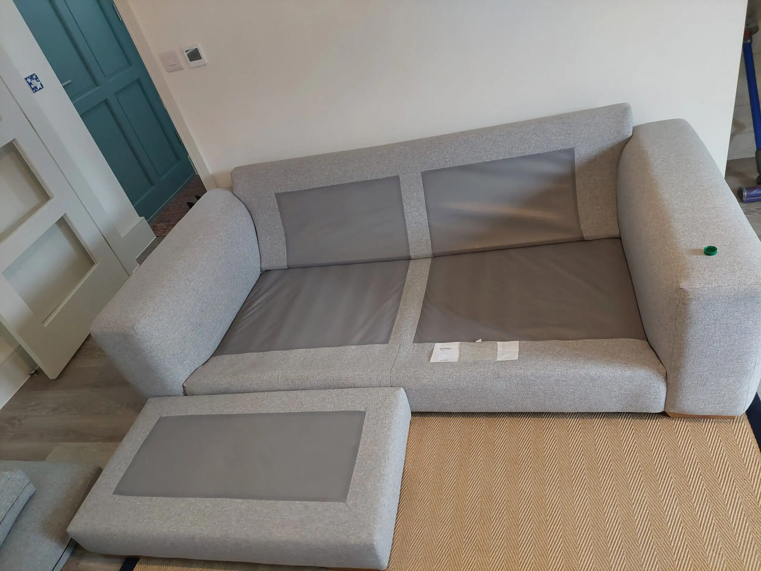 My sofa is in very good shape. It’s 7 years old, and it has scotch guard on the whole of the sofa, so it won’t stain. It’s a large 2 seater sofa. L shaped and you can move the L, to be right or left. It’s grey/blue coloured and soft material .. very comfy and soft to sit on. It would fit 1 adult and 2 kids..