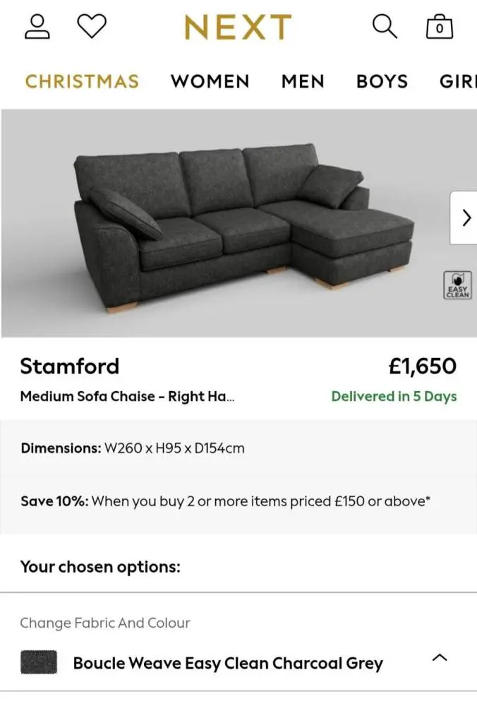 NEXT Stamford Medium Chaise Corner Sofa in Boucle Weave Charcoal