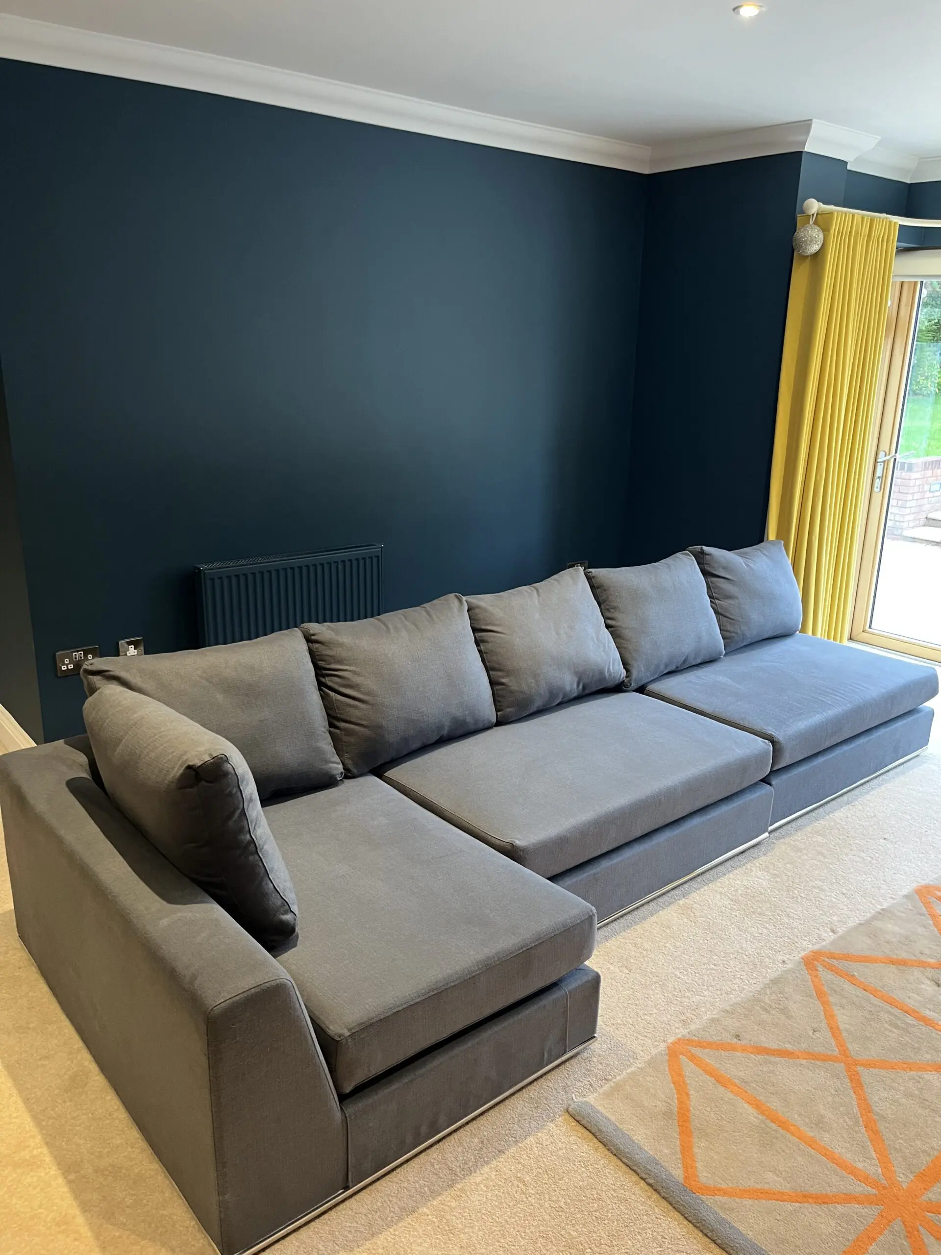Beautiful modular chaise sofa in dark grey. Cost £1800 just 18 months ago but like new. Non smoking, pet free home. 325cm length, 125cm depth (chaise end), 100cm depth the rest. 56cm height.